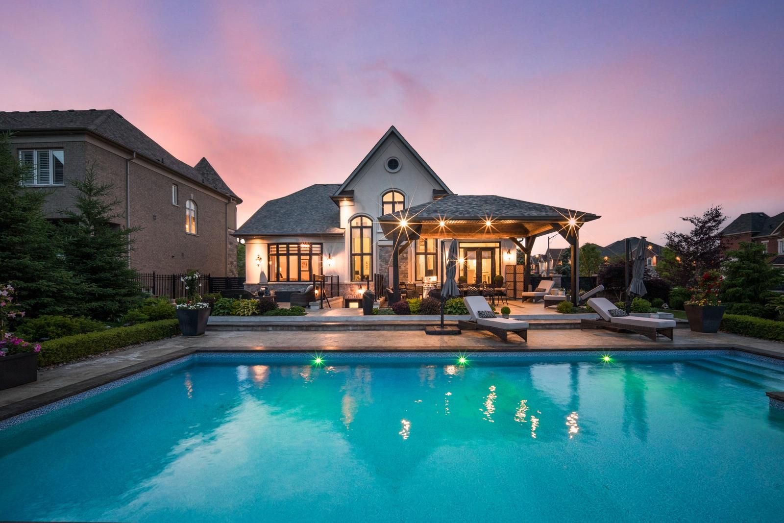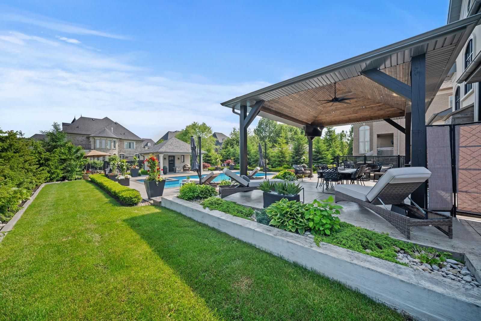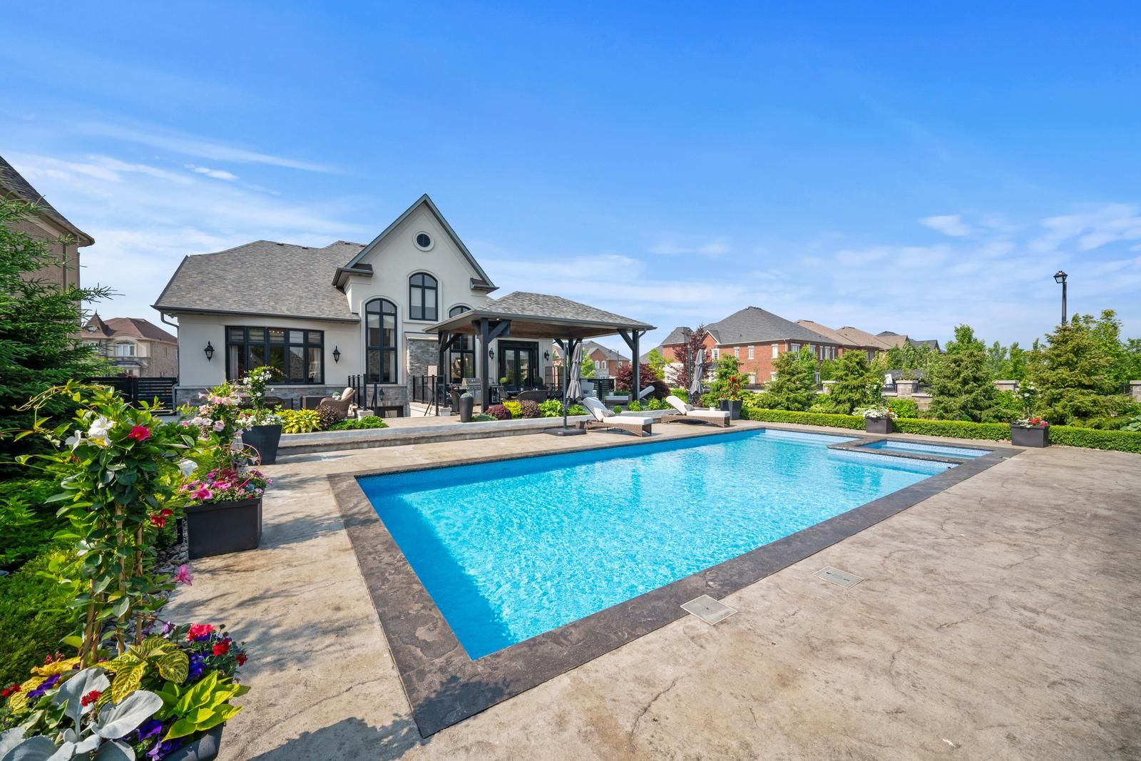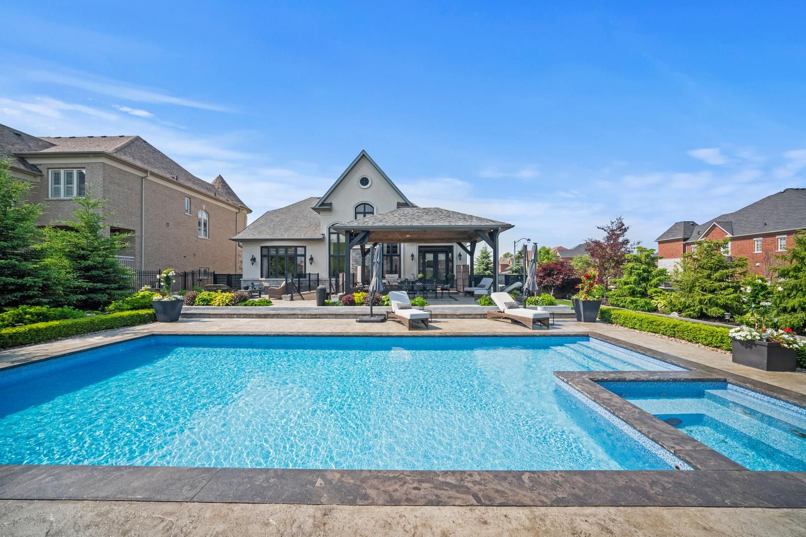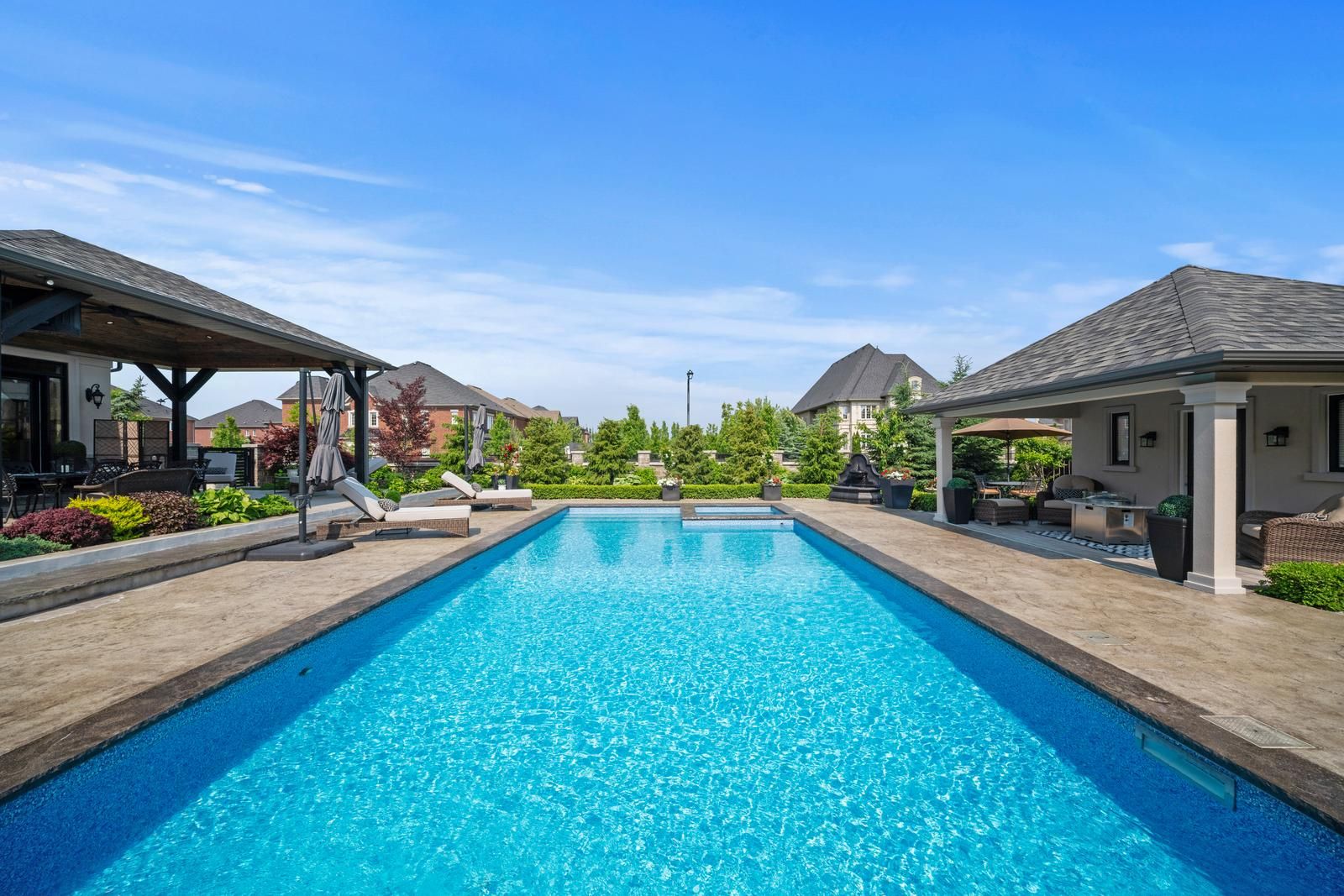This estate bungaloft offers a blend of refined living and timeless sophistication in a serene atmosphere. At the heart of the home lies a chef-inspired kitchen outfitted with professional appliances, sleek quartz countertops, backsplash, central island, walk-in pantry & servery, ideal for everyday living or upscale entertaining. The soaring two-storey family room is perfect for grand gatherings, offering breathtaking views of the backyard oasis through expansive windows that flood the space with natural light. The main-floor primary suite featuring walk-in closets and a spa-like 5-piece ensuite is designed for pure indulgence. A second bedroom, currently styled as a dressing room is conveniently located beside the primary suite and includes its own 3-piece bath. Throughout the home, warmth and charm abound, elevated by custom drapery, beautiful fireplaces, and two radiant motorized chandeliers that lend a touch of glamour to the living space. Step outside into your own resort-style paradise, complete with a glistening pool, a rejuvenating hot tub, and a cabana featuring a 2-piece bath and storage. Entertain in comfort under the custom gazebo with a tv and ceiling fan, surrounded by manicured gardens, fruit trees, and a thriving vegetable patch all set within beautifully landscaped grounds. The fully finished walk-up basement offers flexibility, whether as a private in-law or nanny suite, guest accommodations, or a teen retreat. It includes a full kitchen, dining area, cozy family room with led fireplace & feature wall, exercise room, a large bedroom with ensuite, an additional 3-piece guest bath, and a spacious laundry room. With minor modifications, the basement can easily be converted into a 2-3 bedroom suite. For car enthusiasts, the three-car garage is finished to perfection with epoxy floors and is equipped to support one or two car lifts. Nearby schools, charming cafes, conveniences, and golf course.. An exceptional lifestyle opportunity not to be missed.