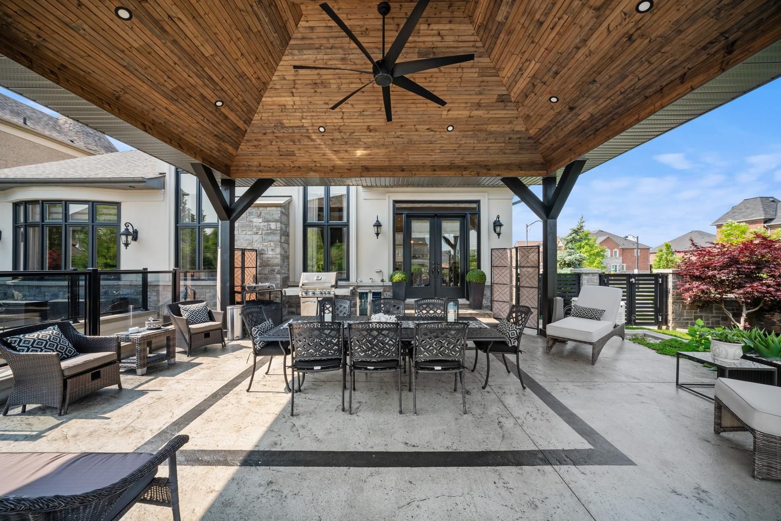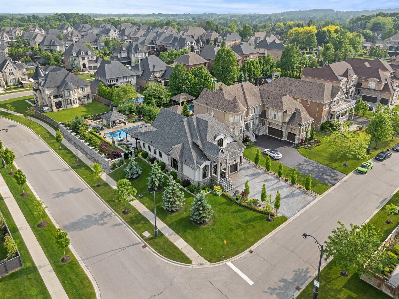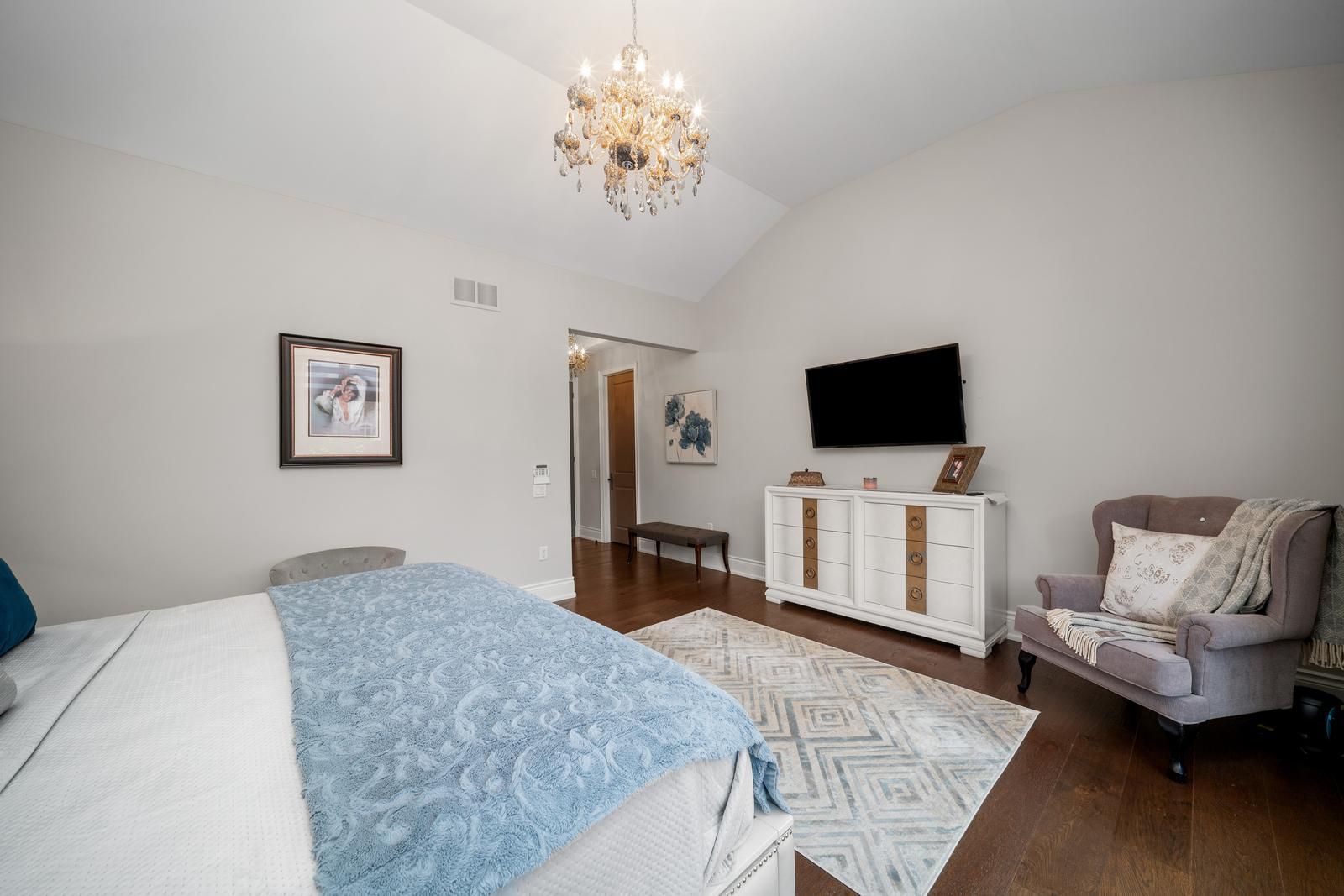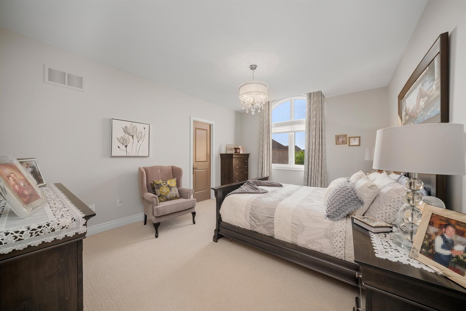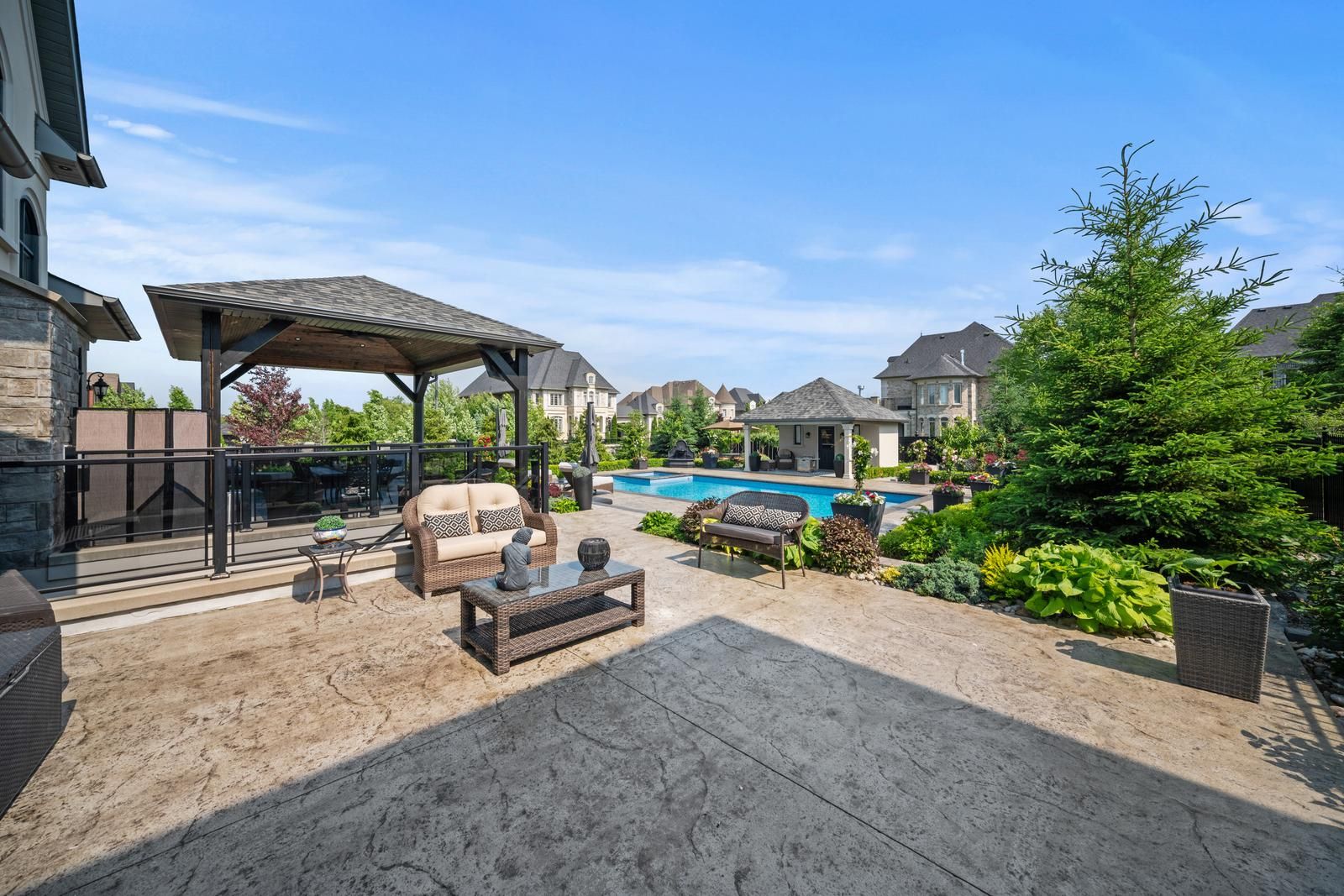 This estate bungaloft offers a blend of refined living and timeless sophistication in a serene atmosphere. At the heart of the home lies a chef-inspired kitchen outfitted with professional appliances, sleek quartz countertops, backsplash, central island, walk-in pantry & servery, ideal for everyday living or upscale entertaining. The soaring two-storey family room is perfect for grand gatherings, offering breathtaking views of the backyard oasis through expansive windows that flood the space with natural light. The main-floor primary suite featuring walk-in closets and a spa-like 5-piece ensuite is designed for pure indulgence. A second bedroom, currently styled as a dressing room is conveniently located beside the primary suite and includes its own 3-piece bath. Throughout the home, warmth and charm abound, elevated by custom drapery, beautiful fireplaces, and two radiant motorized chandeliers that lend a touch of glamour to the living space. Step outside into your own resort-style paradise, complete with a glistening pool, a rejuvenating hot tub, and a cabana featuring a 2-piece bath and storage. Entertain in comfort under the custom gazebo with a tv and ceiling fan, surrounded by manicured gardens, fruit trees, and a thriving vegetable patch all set within beautifully landscaped grounds. The fully finished walk-up basement offers flexibility, whether as a private in-law or nanny suite, guest accommodations, or a teen retreat. It includes a full kitchen, dining area, cozy family room with led fireplace & feature wall, exercise room, a large bedroom with ensuite, an additional 3-piece guest bath, and a spacious laundry room. With minor modifications, the basement can easily be converted into a 2-3 bedroom suite. For car enthusiasts, the three-car garage is finished to perfection with epoxy floors and is equipped to support one or two car lifts. Nearby schools, charming cafes, conveniences, and golf course.. An exceptional lifestyle opportunity not to be missed.