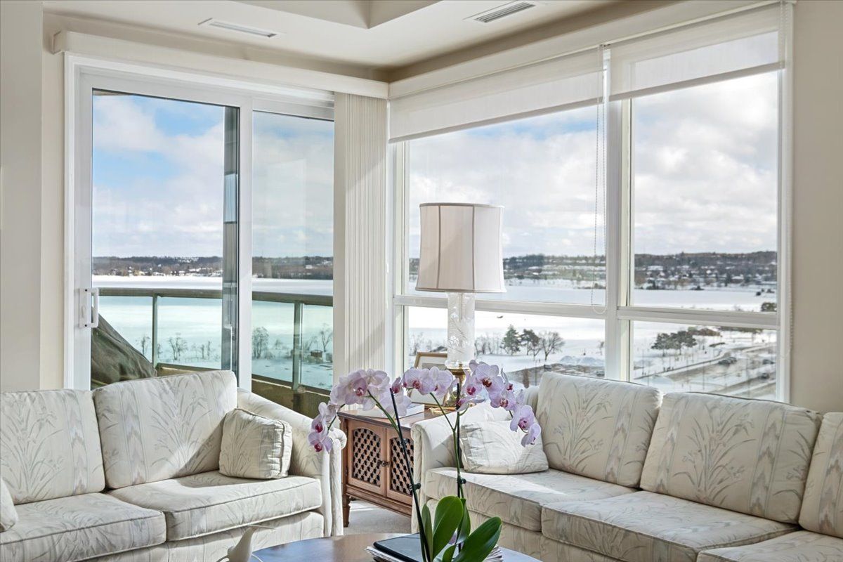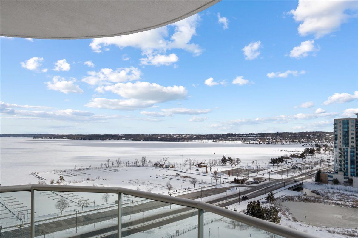 Waterfront living in barrie - space, views and lifestyle at the prestigious grand harbour. Life feels a little different on the water, and this spacious 2-bedroom, 2-bath plus den waterfront condo captures everything people love about living along the shores of kempenfelt bay. Step inside to a bright open-concept layout designed for both comfort and entertaining. Expansive windows invite natural light to pour into the living and dining areas while framing beautiful waterfront views. Open kitchen flows seamlessly into the main living space, perfect for entertaining. The separate den provides valuable bonus space-ideal as a home office, reading room, or creative studio. One of the true highlights is the private balcony. Whether it's morning coffee watching the sunrise over the bay or relaxing evenings with the city lights reflecting on the water, the balcony becomes an extension of your living space and a daily reminder of why waterfront living is so special. Barrie's waterfront offers a scenic shoreline, parks, beaches, walking trails, and the marina, making it a favourite destination for residents year-round. Just steps away, downtown offers restaurants, cafés, and shops, creating the perfect blend of nature and urban convenience. Wonderful building amenities and social activities include an indoor pool, hot tub, sauna, exercise room, games room, party room, guest suites and extensive social activities. Pet friendly building, underground parking and an exclusive storage locker. This is a perfect place to call home.