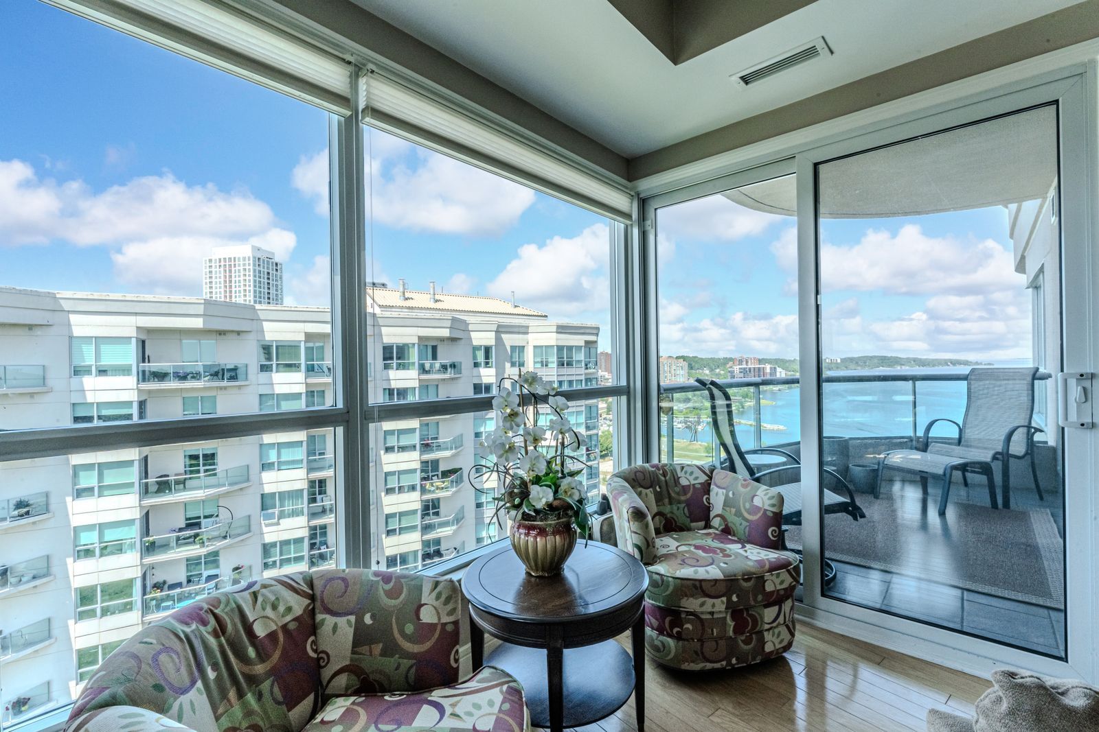 Corner unit penthouse with panoramic kempenfelt bay views! Wake up to the shimmer of the bay and the gentle hum of the marina coming to life across the street. From this top-floor corner suite in barrie's beloved lakeshore, life feels lighter and beautifully connected to the water. Set within the sought-after grand harbour building, this elevated home captures sweeping views of kempenfelt bay, the city skyline, and the boats drifting in and out of the barrie marina. Morning walks along the boardwalk, spontaneous beach days at centennial, intimate patio dinners downtown, and sunset strolls by the water all become part of your everyday routine. Inside, the space is airy and welcoming, with 9-foot ceilings, rich hardwood floors, and a natural gas fireplace that anchors the open-concept living area. The kitchen flows effortlessly into the dining and living spaces, creating the perfect setting for relaxed evenings or hosting friends after a day at the waterfront. Slide open the glass doors and step onto your private balcony, where coffee tastes better at sunrise and evenings are best spent watching the sky melt into the bay. The thoughtful layout offers two spacious bedrooms, including a tranquil primary retreat with a walk-in closet and an ensuite featuring a soaker tub and glass shower. A second full bathroom, in-suite laundry, dedicated parking space, and a storage locker make daily living seamless. Beyond your suite, enjoy resort-style amenities including an indoor pool, fitness centre, games room, and guest suites for visiting family and friends. With quick access to highway 400, the allandale go station, and nearby transit, commuting is simple while your lifestyle remains effortless. Enjoy lakeside living at its finest, where every day feels like a getaway, and the shoreline is quite literally your front yard.