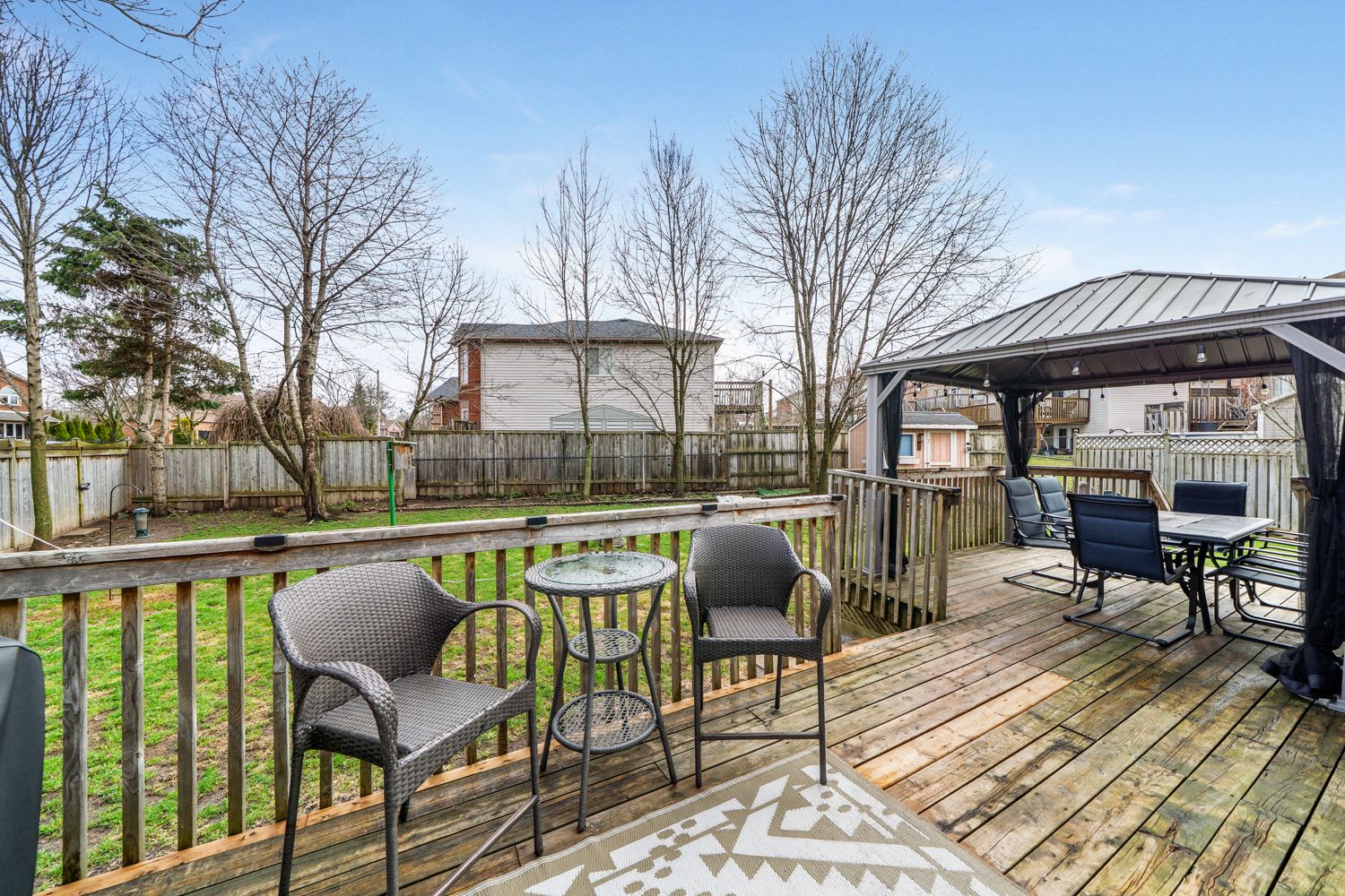 • Private backyard with a large deck, gazebo, and gas BBQ hookup.