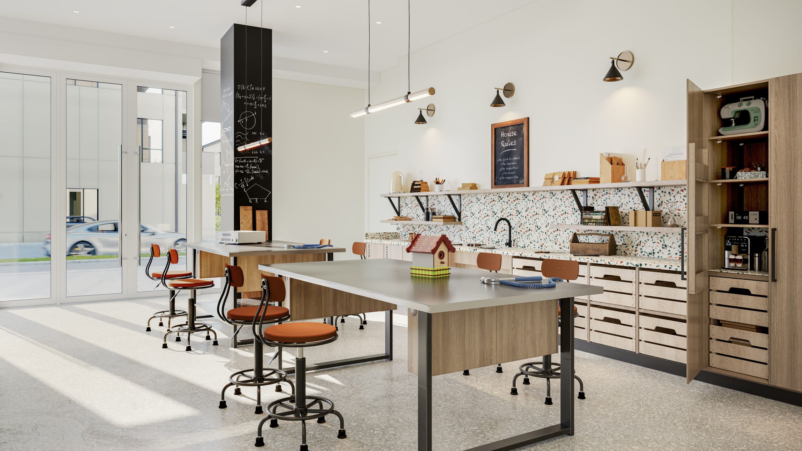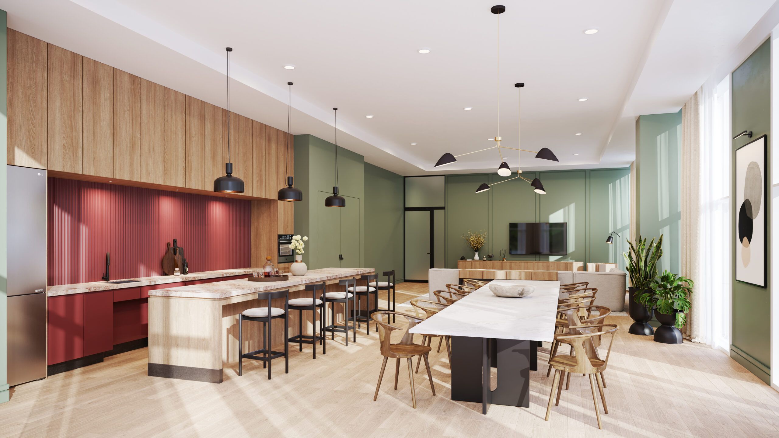 • Modern kitchen features a central island and laminate floors.