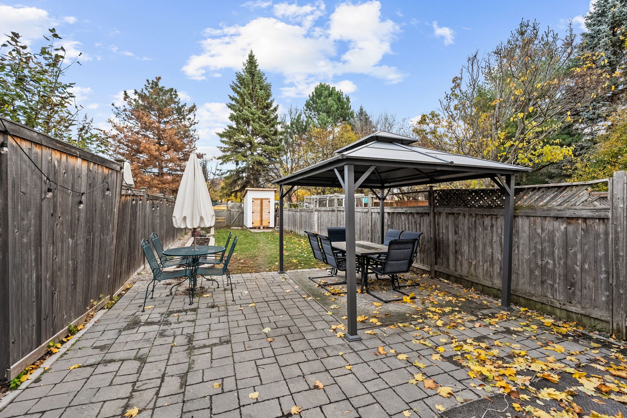 • Fully fenced yard with large patio, gazebo, and storage shed.