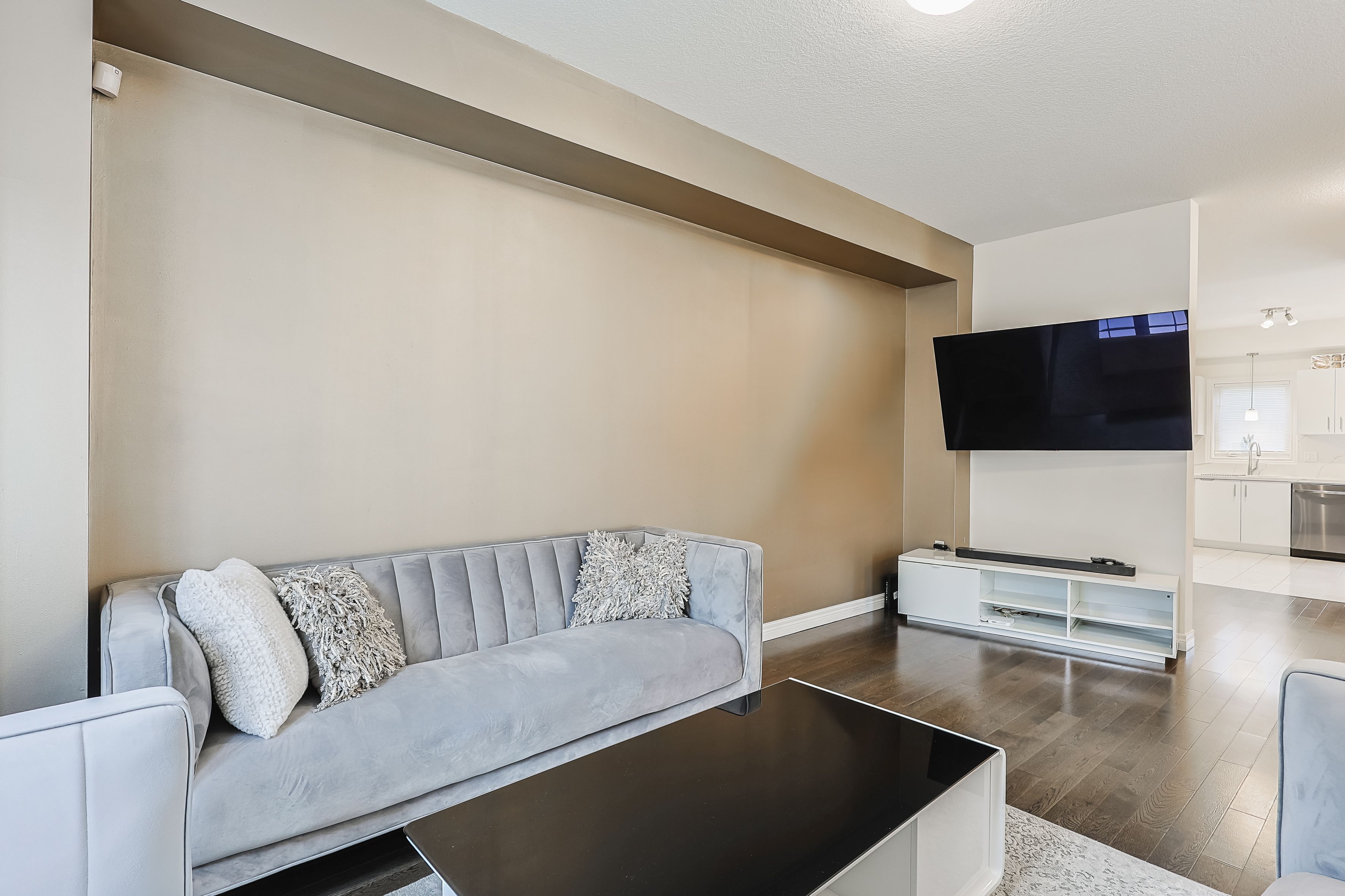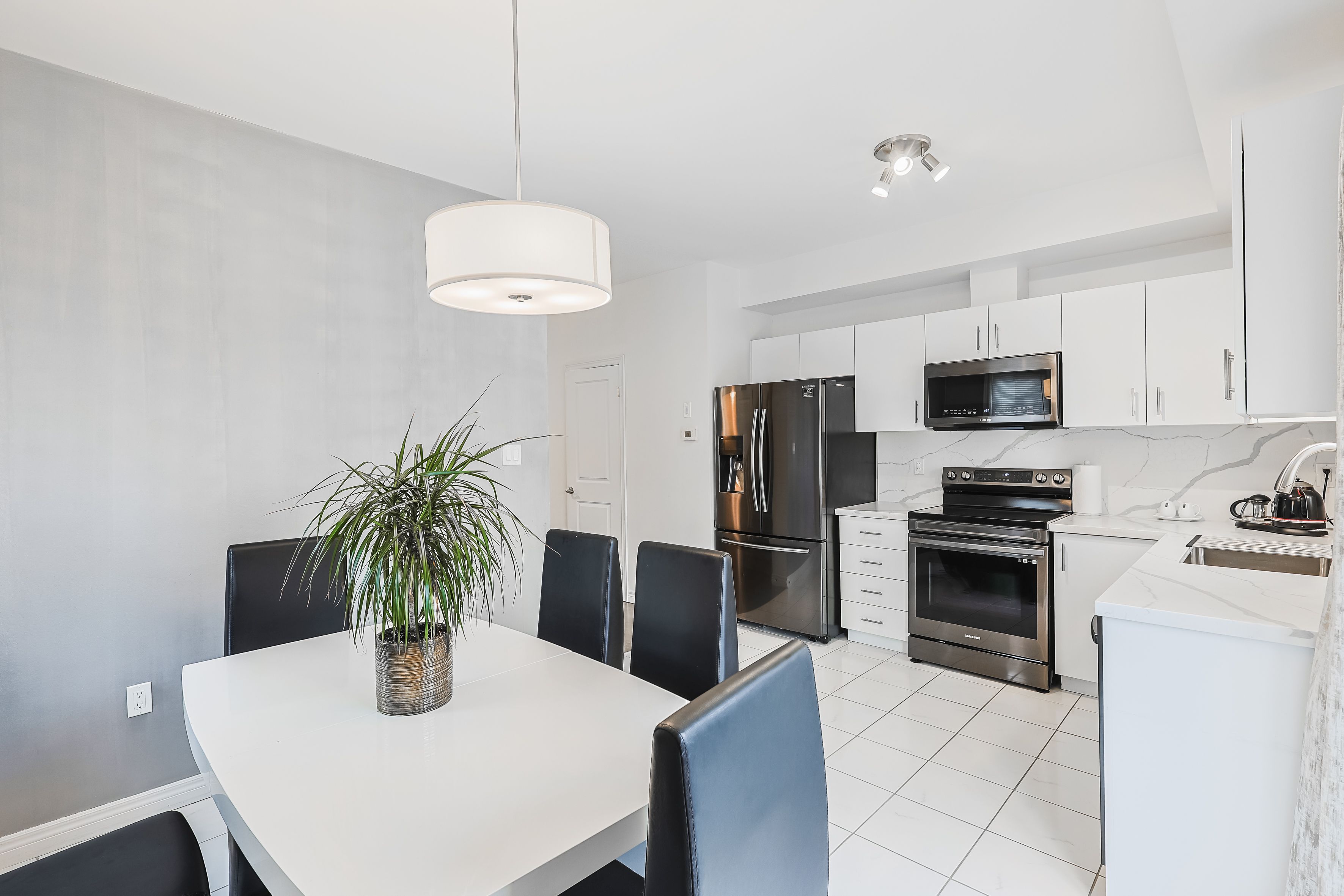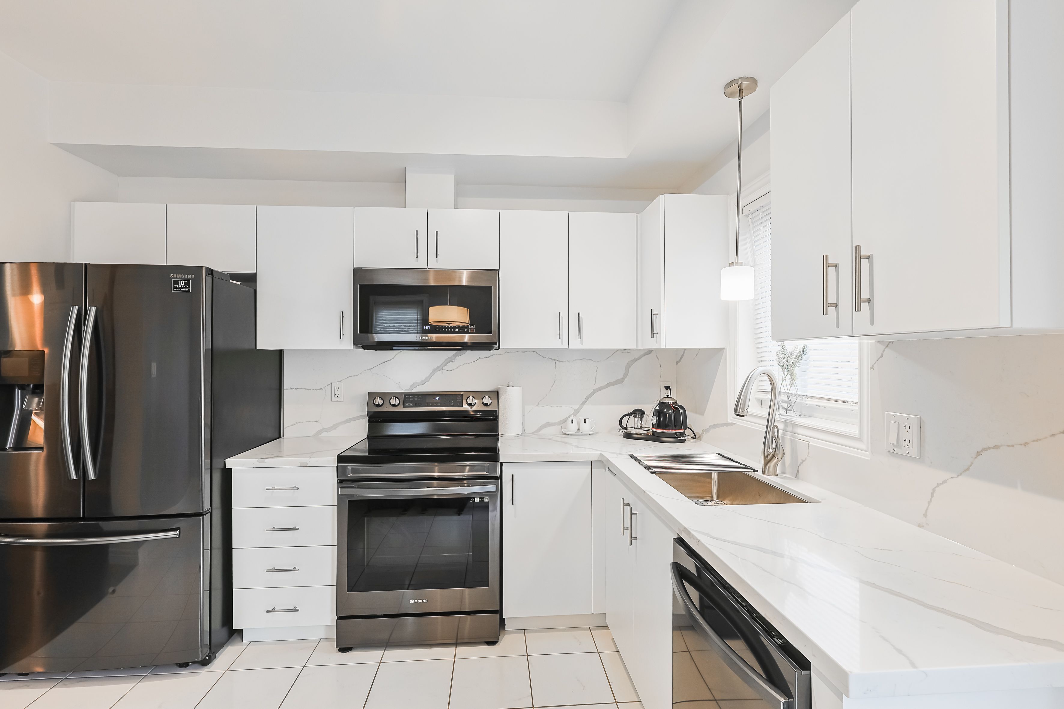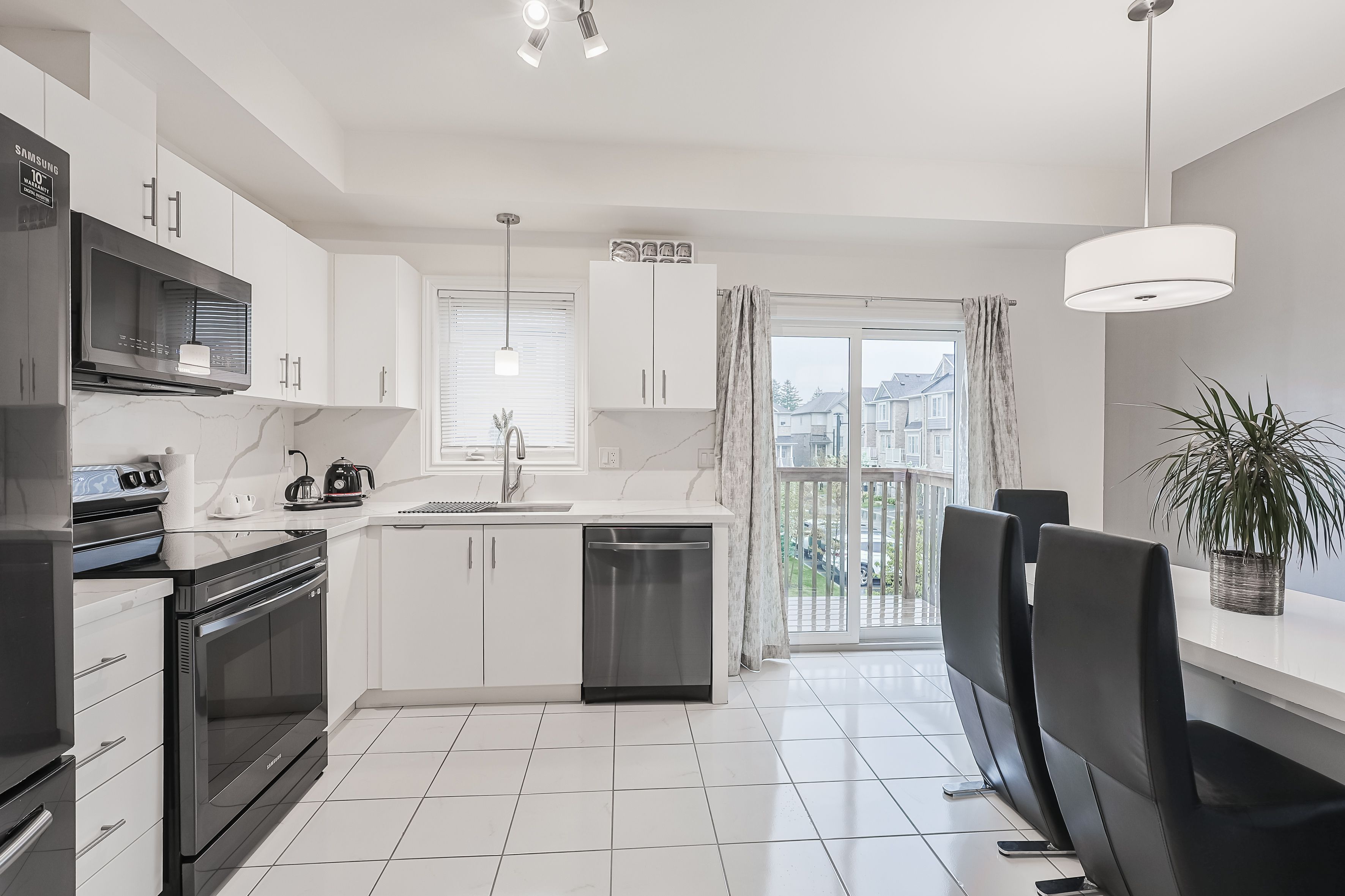 • Modern kitchen with upgraded cabinetry and quartz countertops.