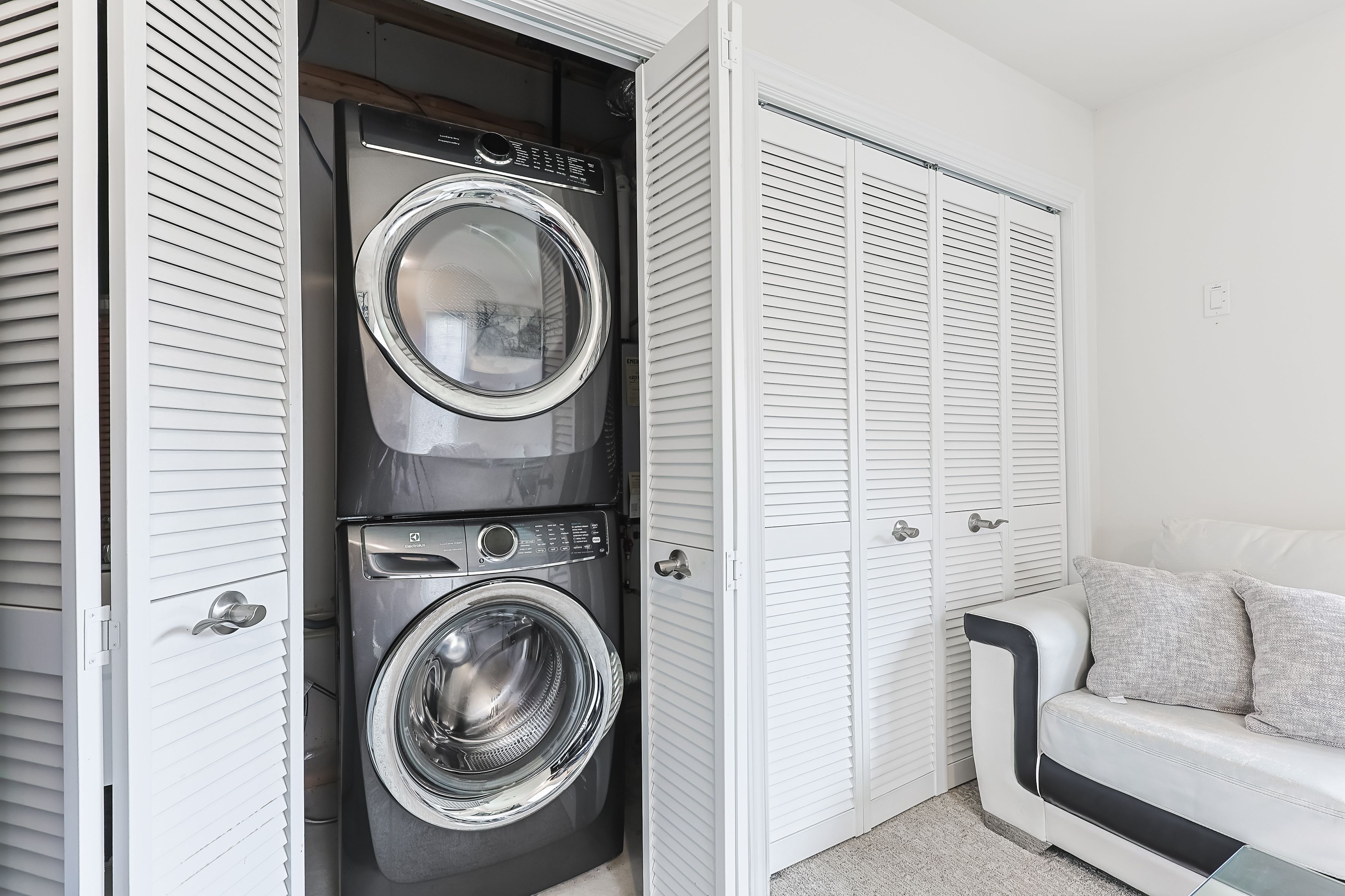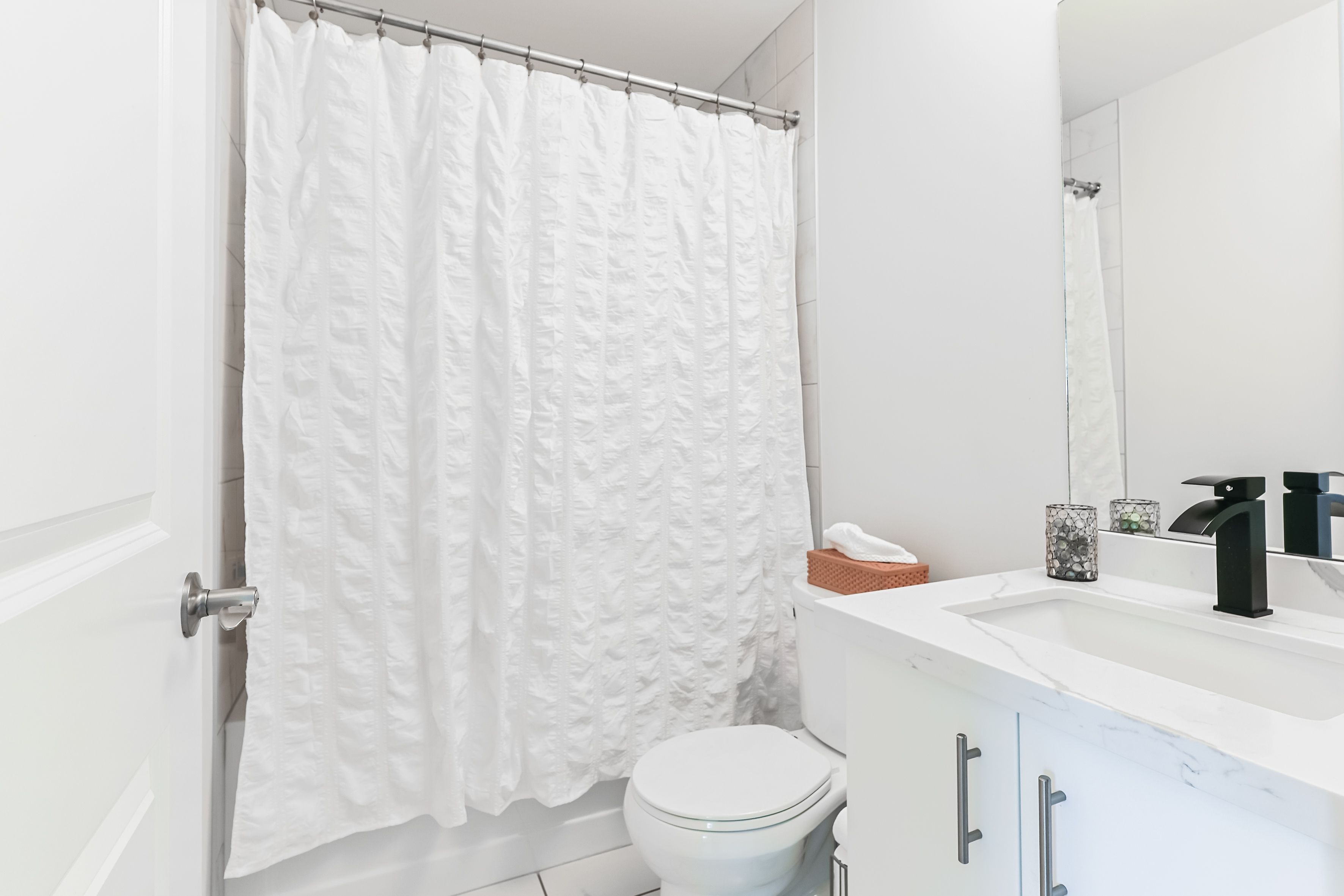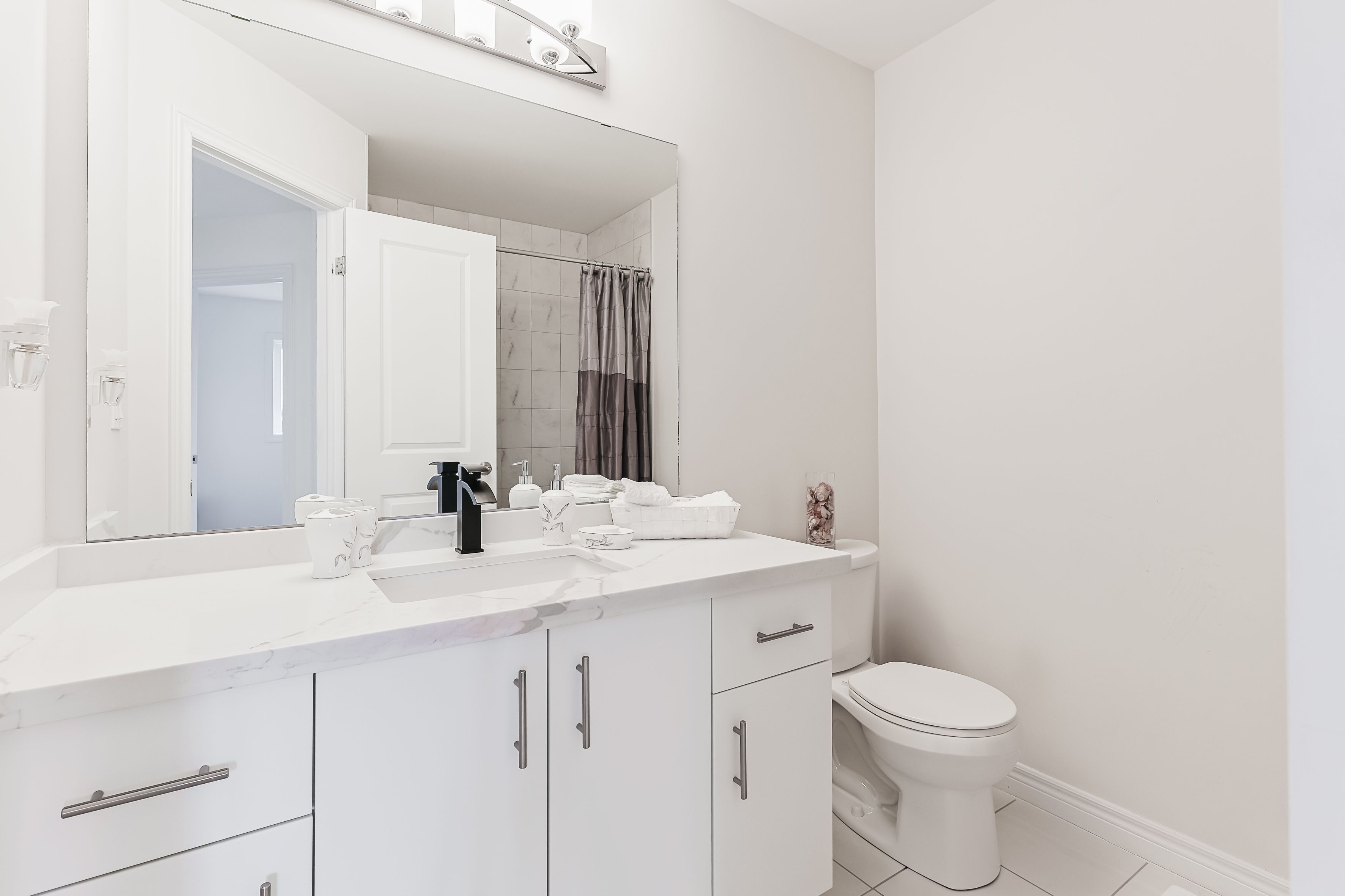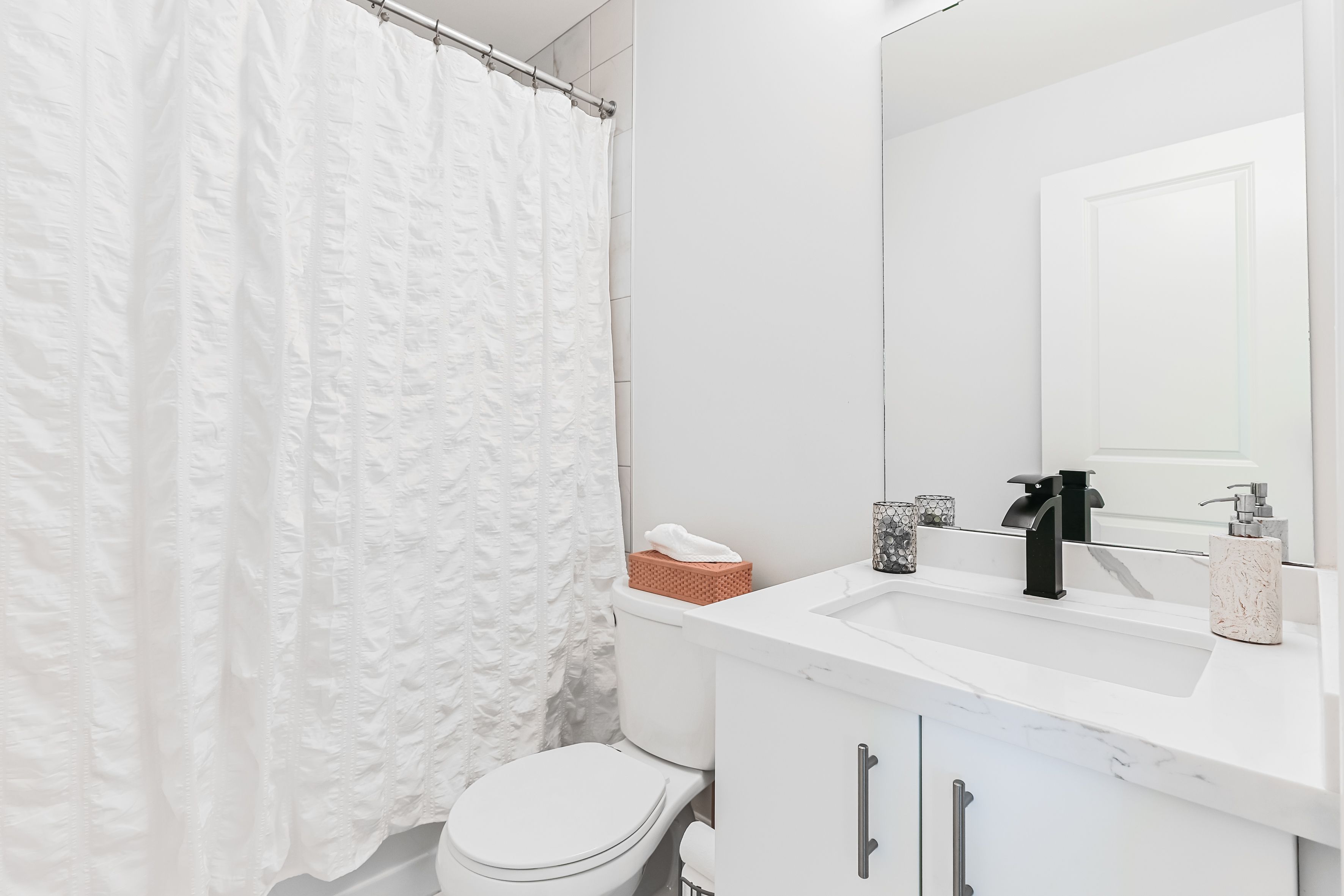 • Modern kitchen with upgraded cabinetry and quartz countertops.