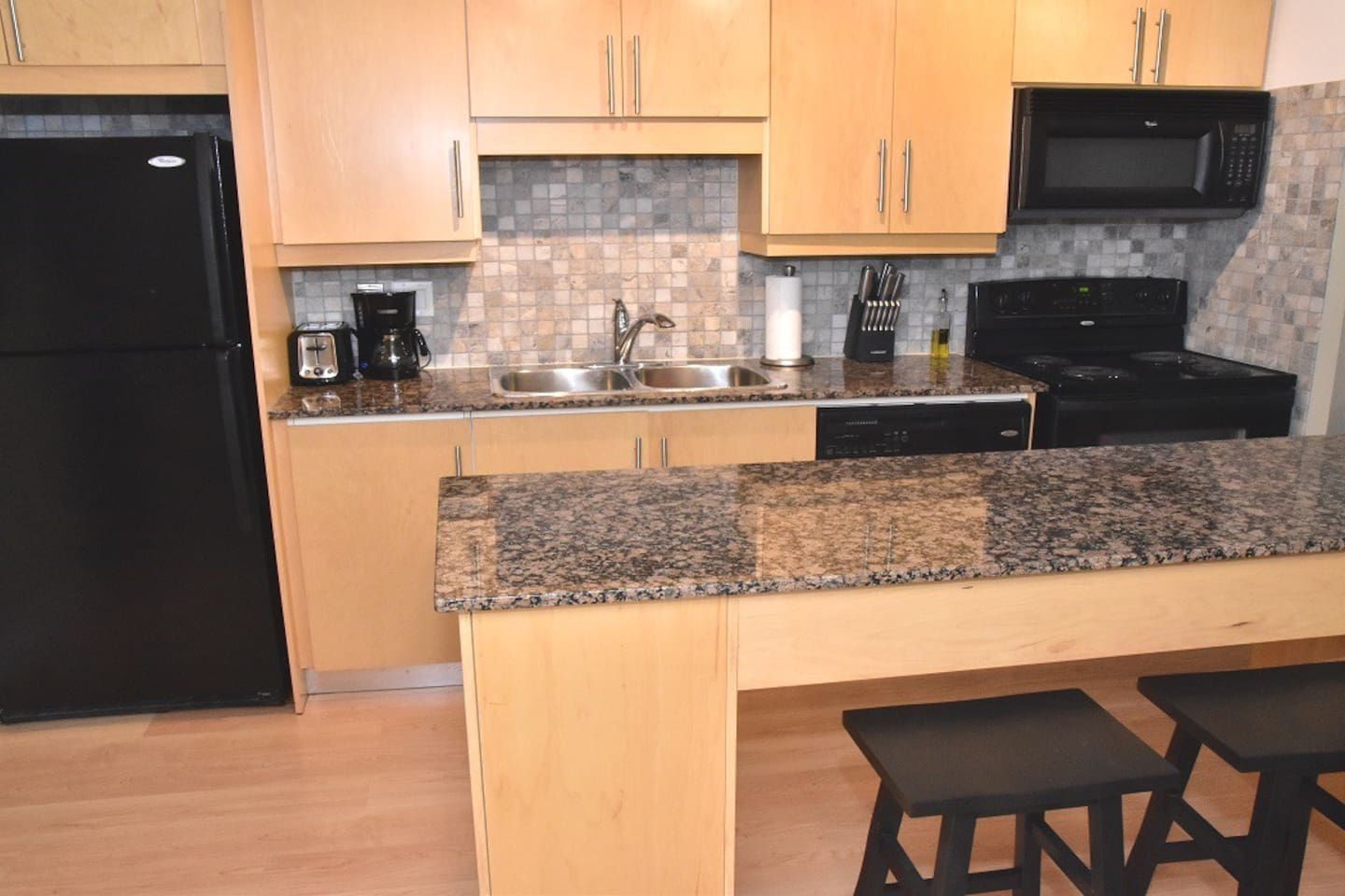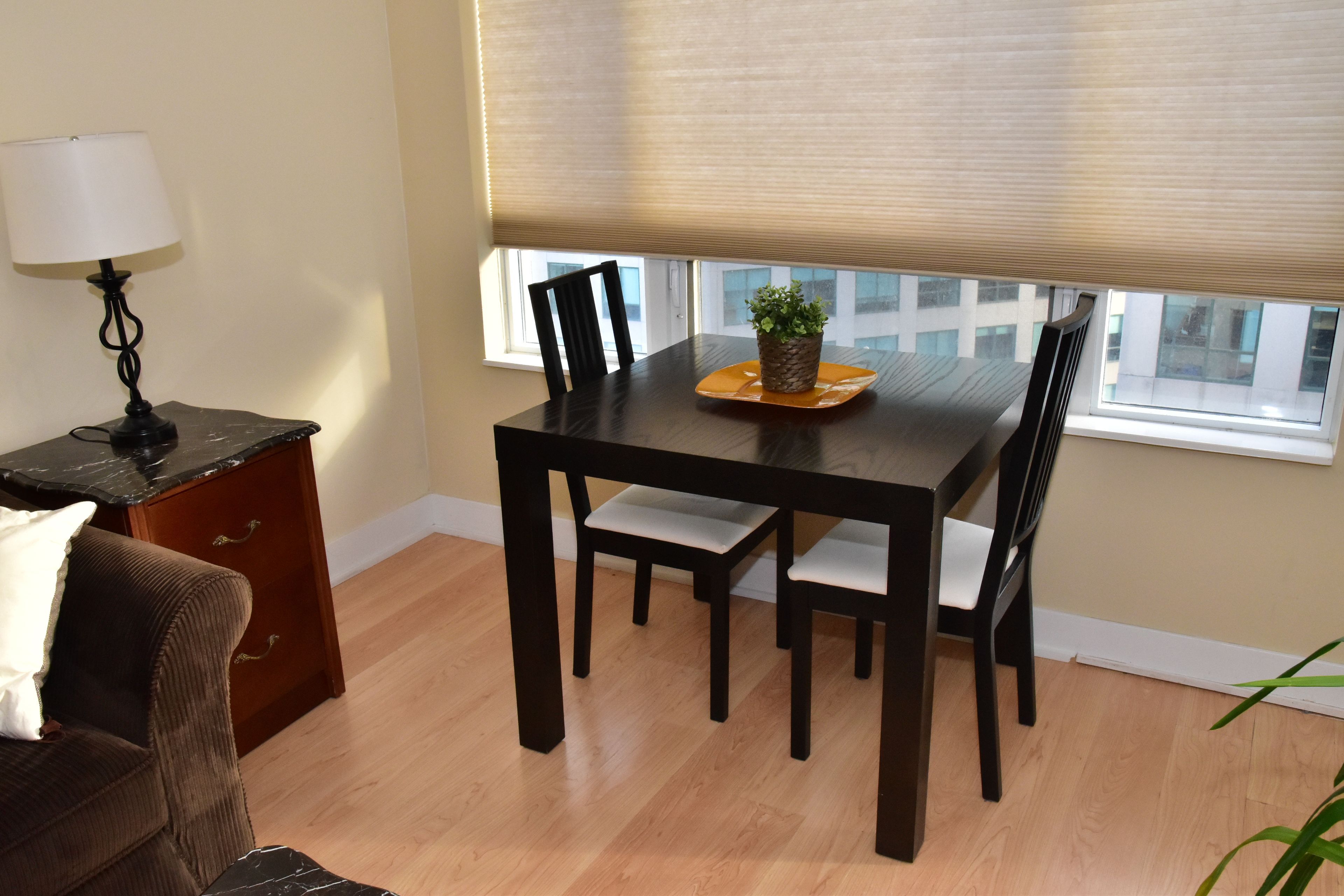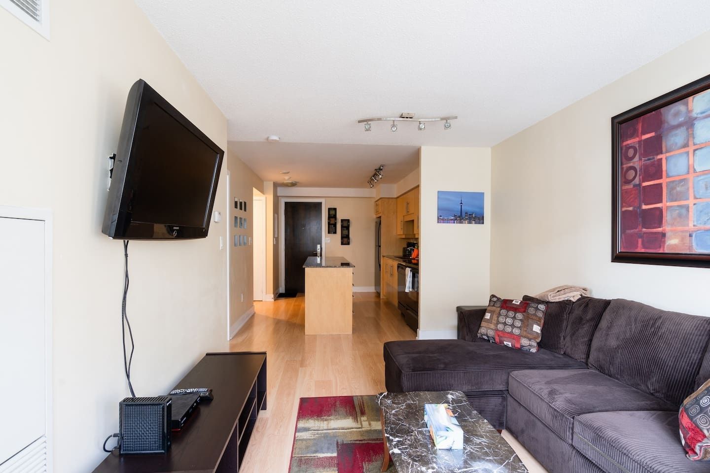 Furnished luxury suite * 620 sq ft living space w/balcony cn tower view > 4 - 12 months executive rental * corporate contract staff professionals, athletes > situated in toronto's entertainment district this beautiful spacious 1 bedroom east exposure - enjoy the sunshine and gorgeous cn tower kaleidoscope of colours > beautiful spacious popular design and no wasted space * open concept chefs delight kitchen, large granite breakfast bar with lots of counter space > fully equipped with everything you require > small & large appliances, kitchenware, dish sets, pots, pans, cutlery, glasses etc. * large living room and dining room allows the added work space with a dining table and 4 chairs set in front of the window to admire the cn tower * comfortable luxury sleeps on a quality queen bed in the primary bedroom * mirror closet doors * incredible location 3-4 minute walk cn tower, rogers centre, sobeys grocery, 24 hour rabba foods is across the street * the building main level features tim hortons pizza pizza * wonderful rooftop overlooks cn tower and rogers centre. The 22nd floor terrace w/gym, hosts a gym\ exercise room, quality equipment, aqua spa indoor pool, sauna, two 22nd floor terraces, bbq's, sun loungers * party room, billiard room and wrap around deck * the element has an exit/entrance to front street next to tim hortons > 3 minute walk to metro hall, metro convention centre and metro hall entrance for the p. A. T. H. Shopping, subway, quick walk to union station, transit lines and go train ** amazing p. A. T. H is underground city to the eaton's centre shopping hall at dundas square. The element condo is in the best toronto location showcasing major attractions within walking distance. * extras * fridge, stove, b/i microwave, b/i dishwasher, stacked washer/dryer ** aqua pool, whirlpool, party room theatre, billiards, barbecues, 24-hr concierge/security * the element building has parcel and food delivery approved and visitor parking