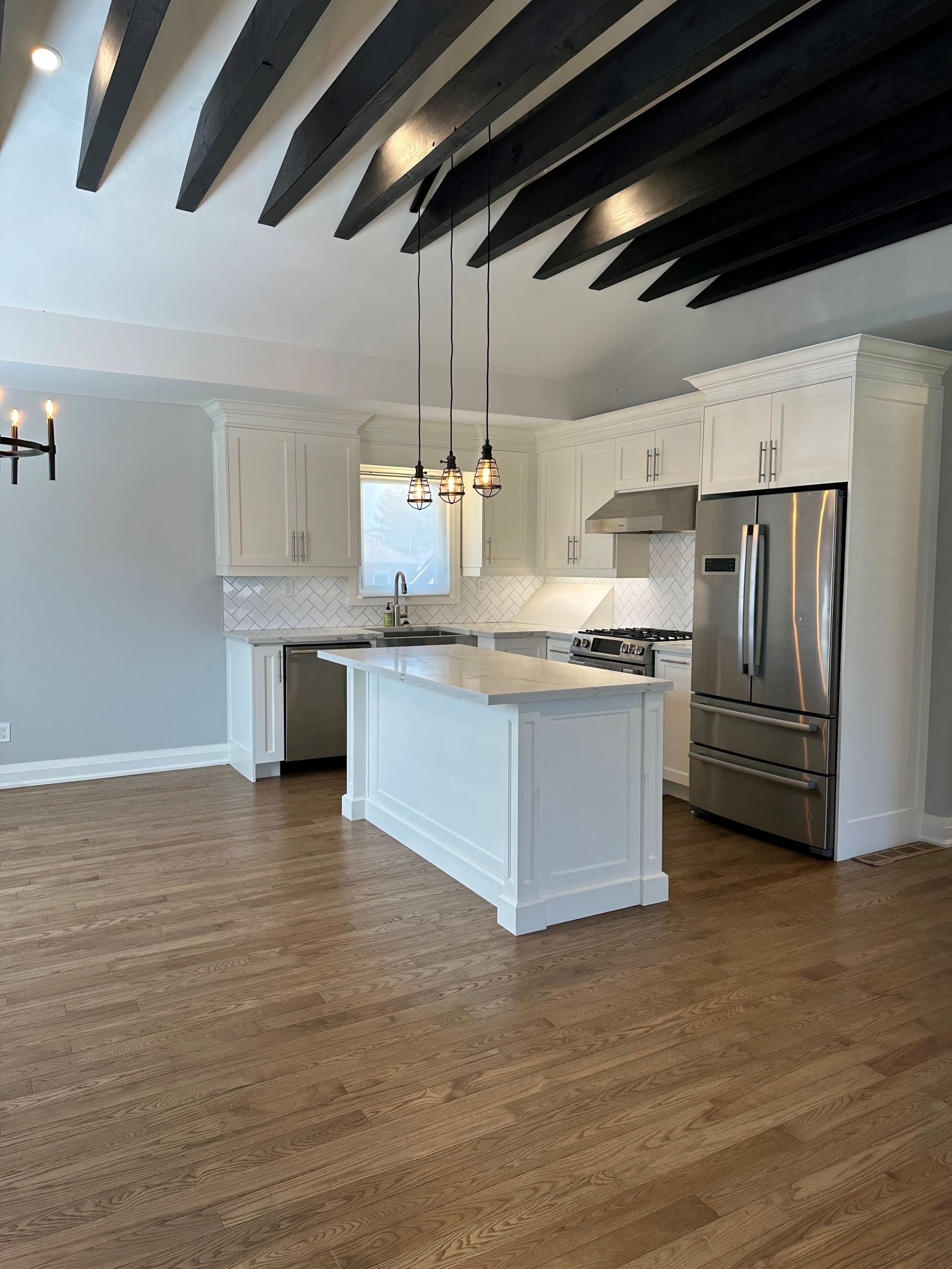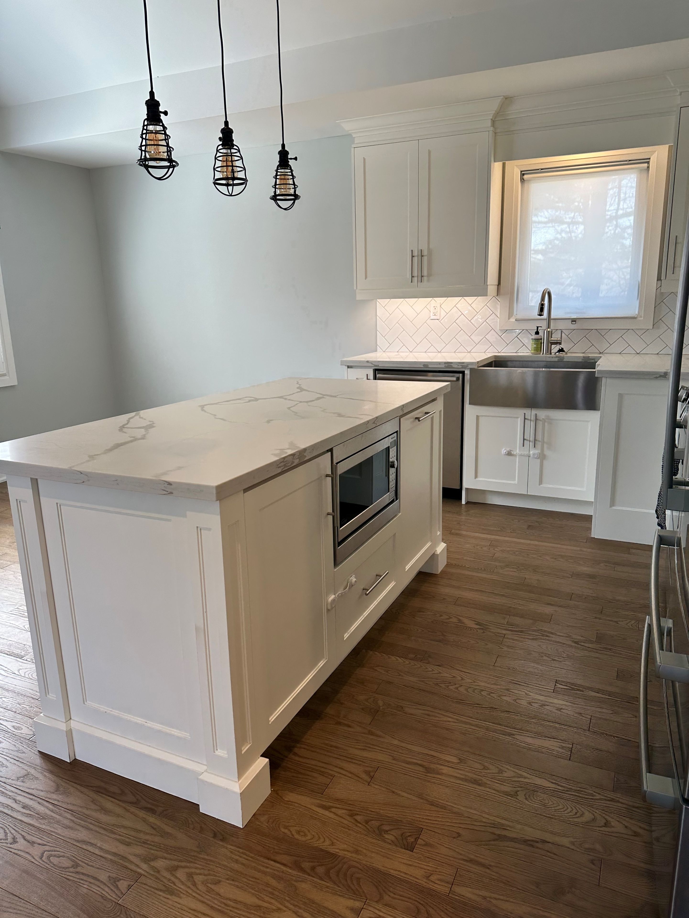 • Stylish kitchen features stainless steel appliances and quartz countertops.