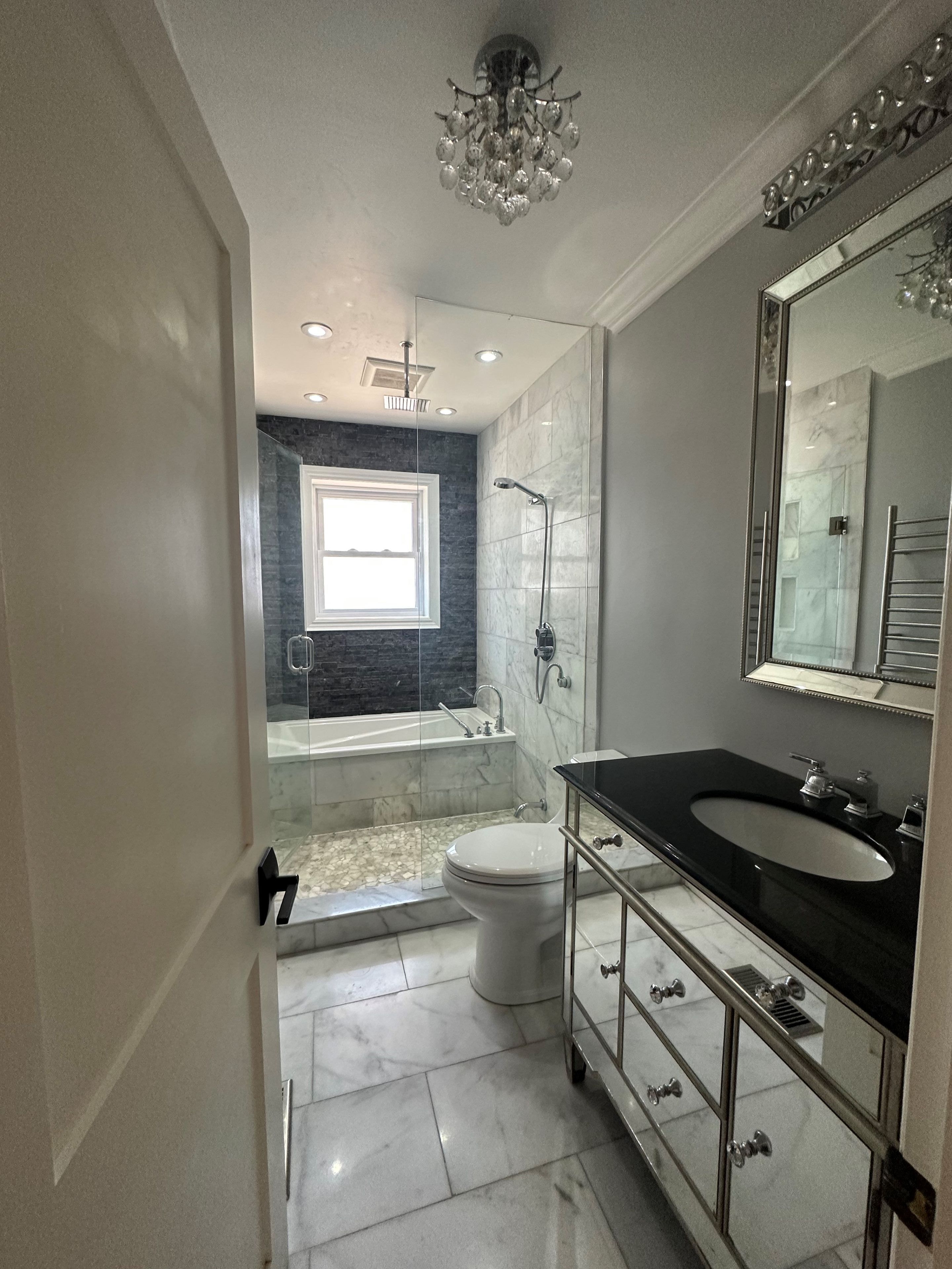 • Updated bathroom equipped with marble tile and four-piece fixtures.