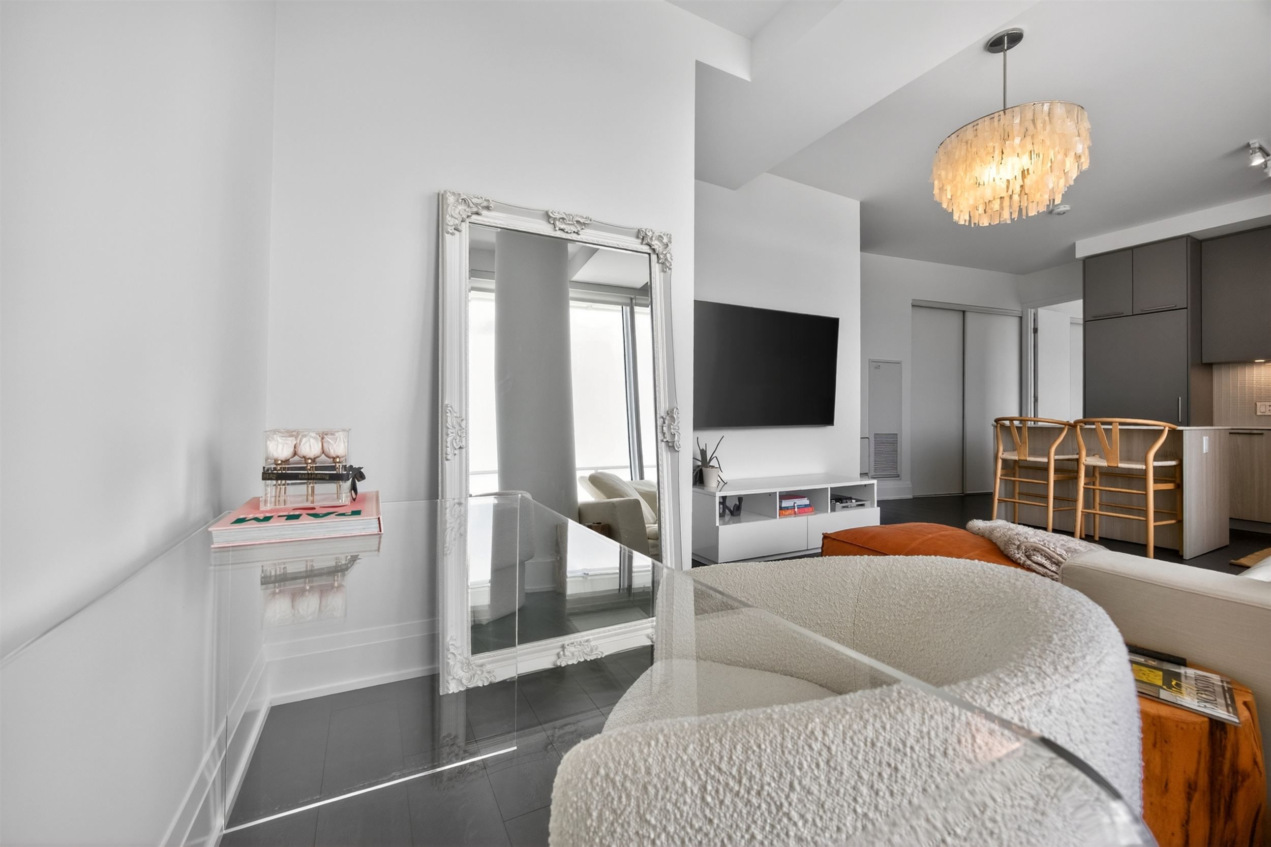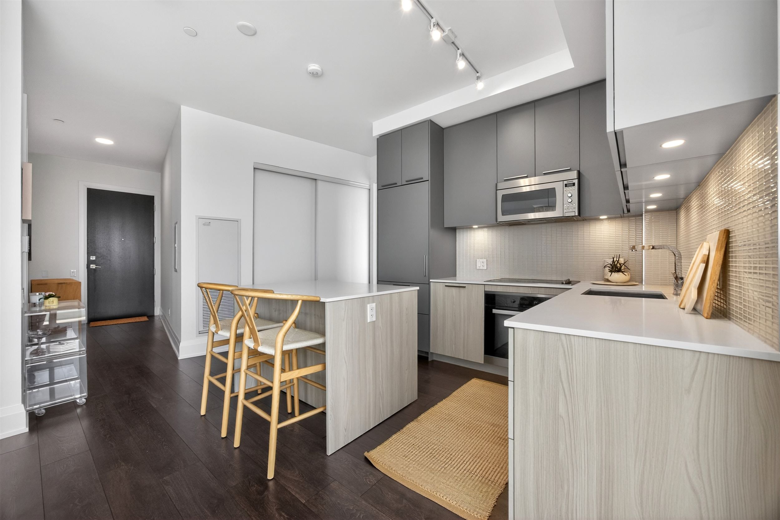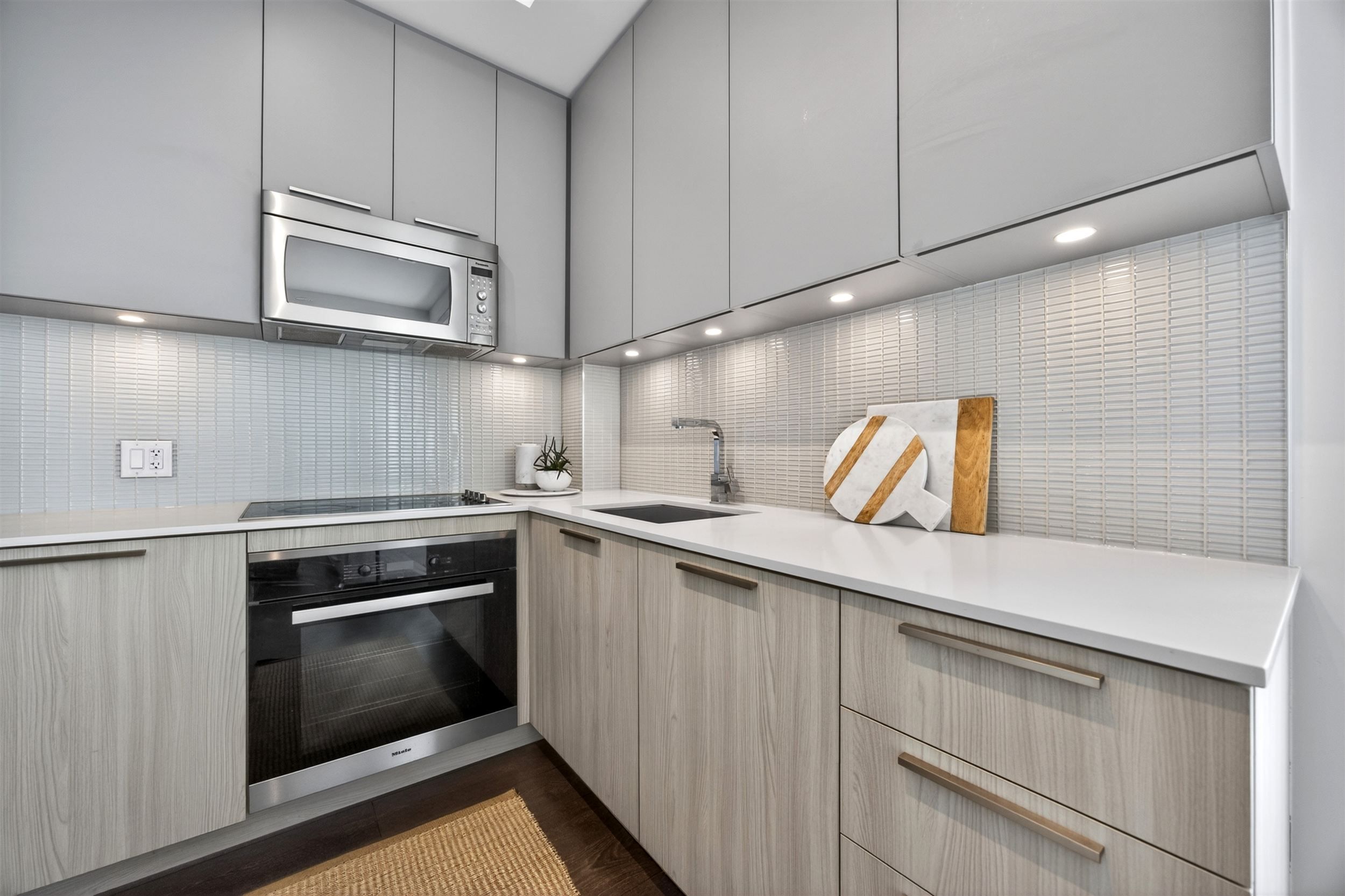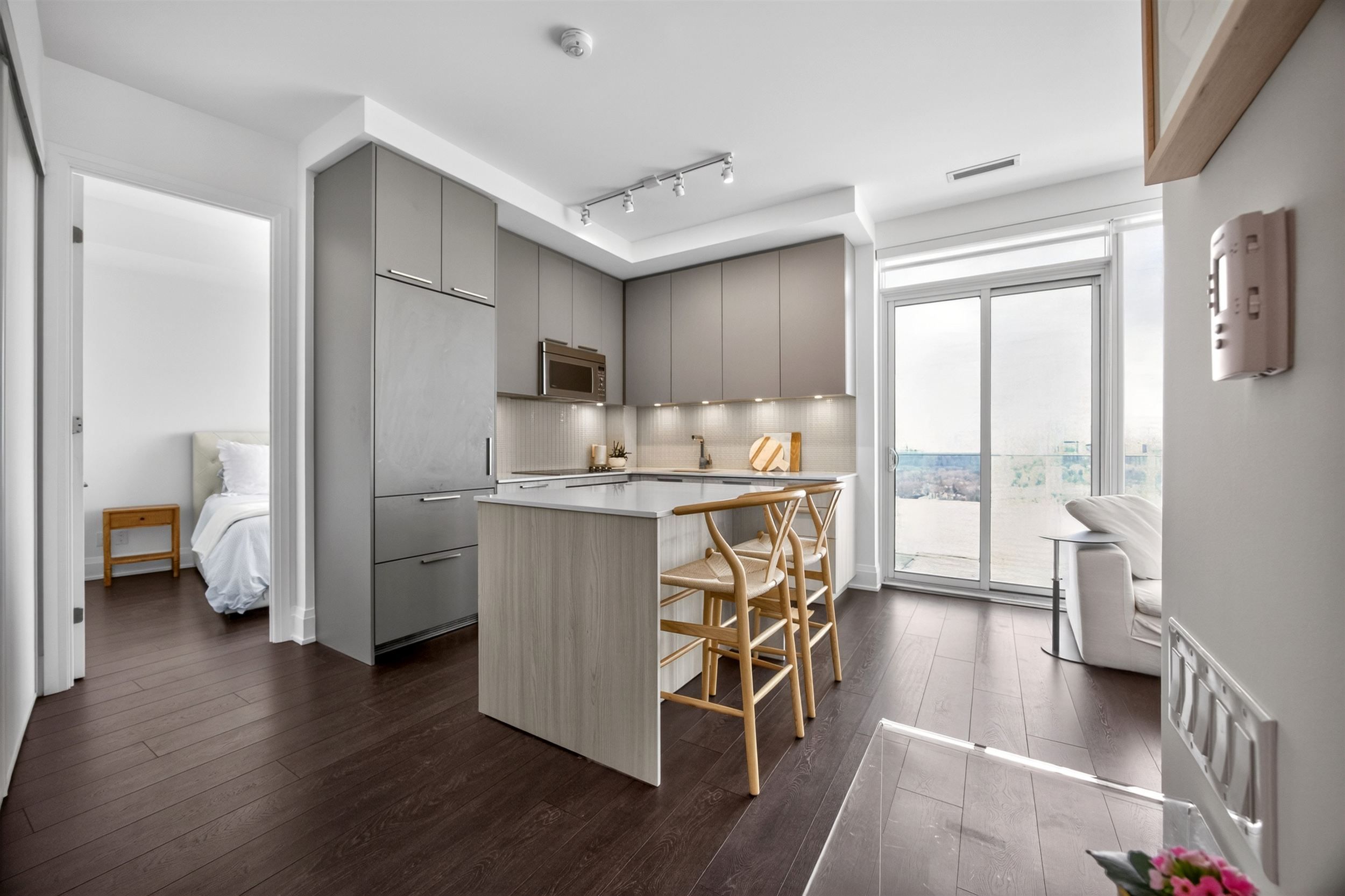 Spectacular sub-penthouse condo flooded with natural light, featuring soaring 10-foot ceilings and expansive southwest views. Enjoy seamless indoor outdoor living with an impressive 30-foot-wide private balcony spanning the entire width of the suite. Complete with a gas line- perfect for evening bbqs while taking in the stunning sunsets. The thoughtfully designed l-shaped kitchen offers an ideal workspace for home cooks and entertainers alike, featuring extended cabinetry for ample storage, a functional island for prep and gathering, and integrated miele appliances including a sleek induction cooktop. This spacious bedroom includes a large closet and a blackout window covering for added comfort. An open concept den flows effortlessly off the living area, creating a versatile space ideal for a home office or fitness nook not to mention high speed internet is included! Additional features include upgraded lighting, a generous entryway, a bathroom medicine cabinet for added storage, and modern light toned finishes that create a clean, organic aesthetic throughout. Complete with one parking space and one locker. This is a rare opportunity to lease a bright, well appointed sub-penthouse in a highly desirable setting.