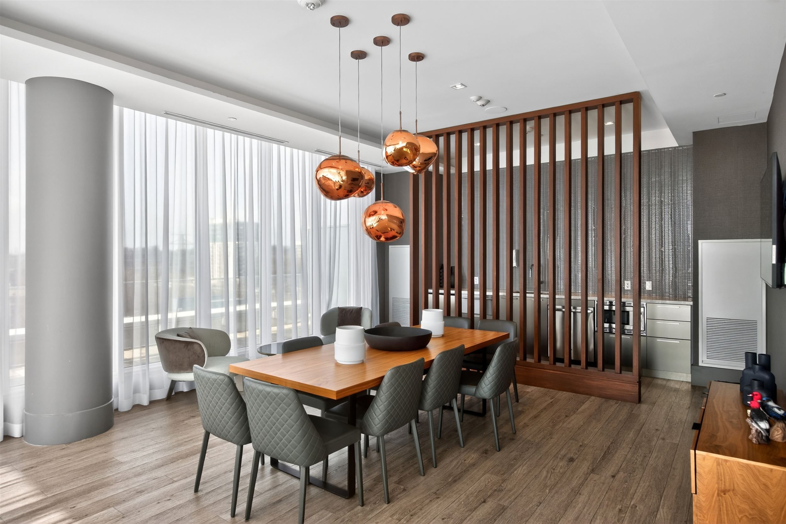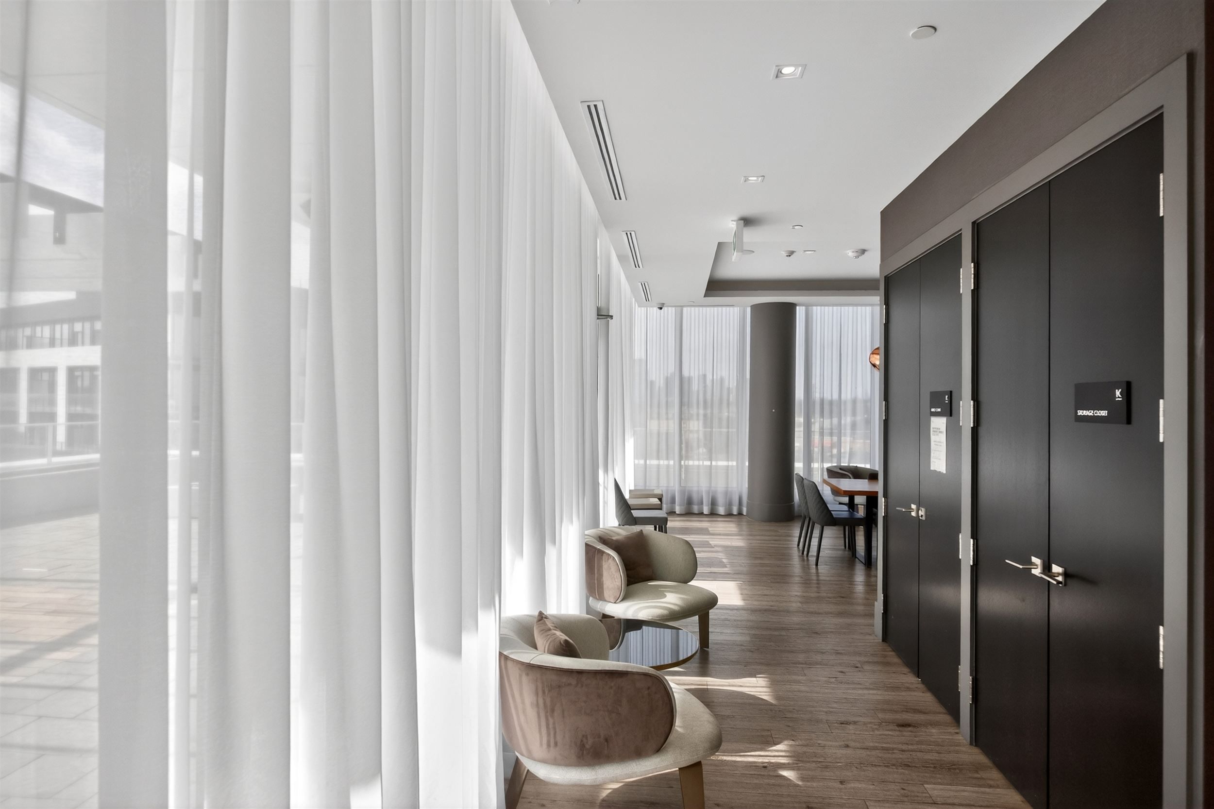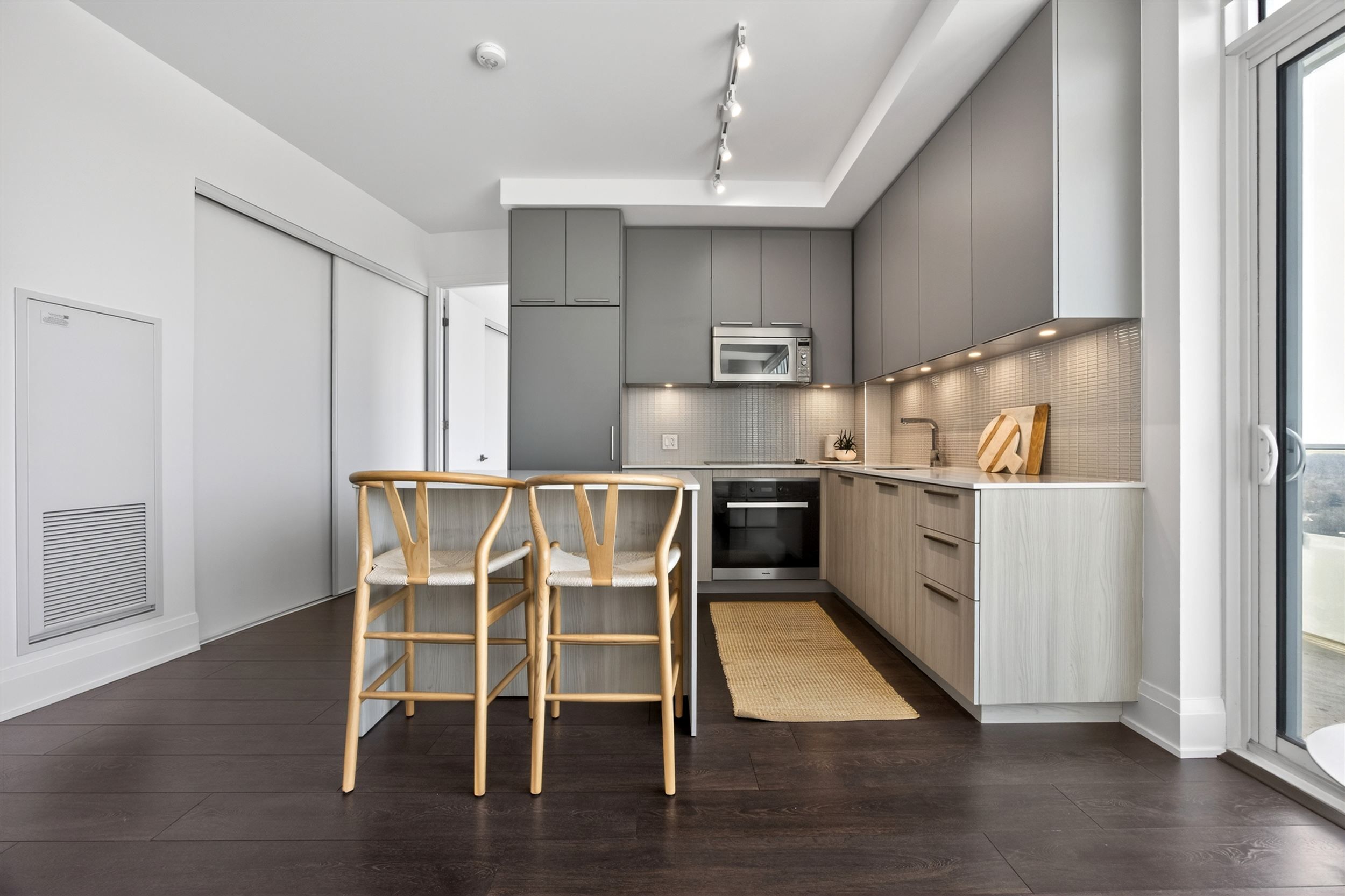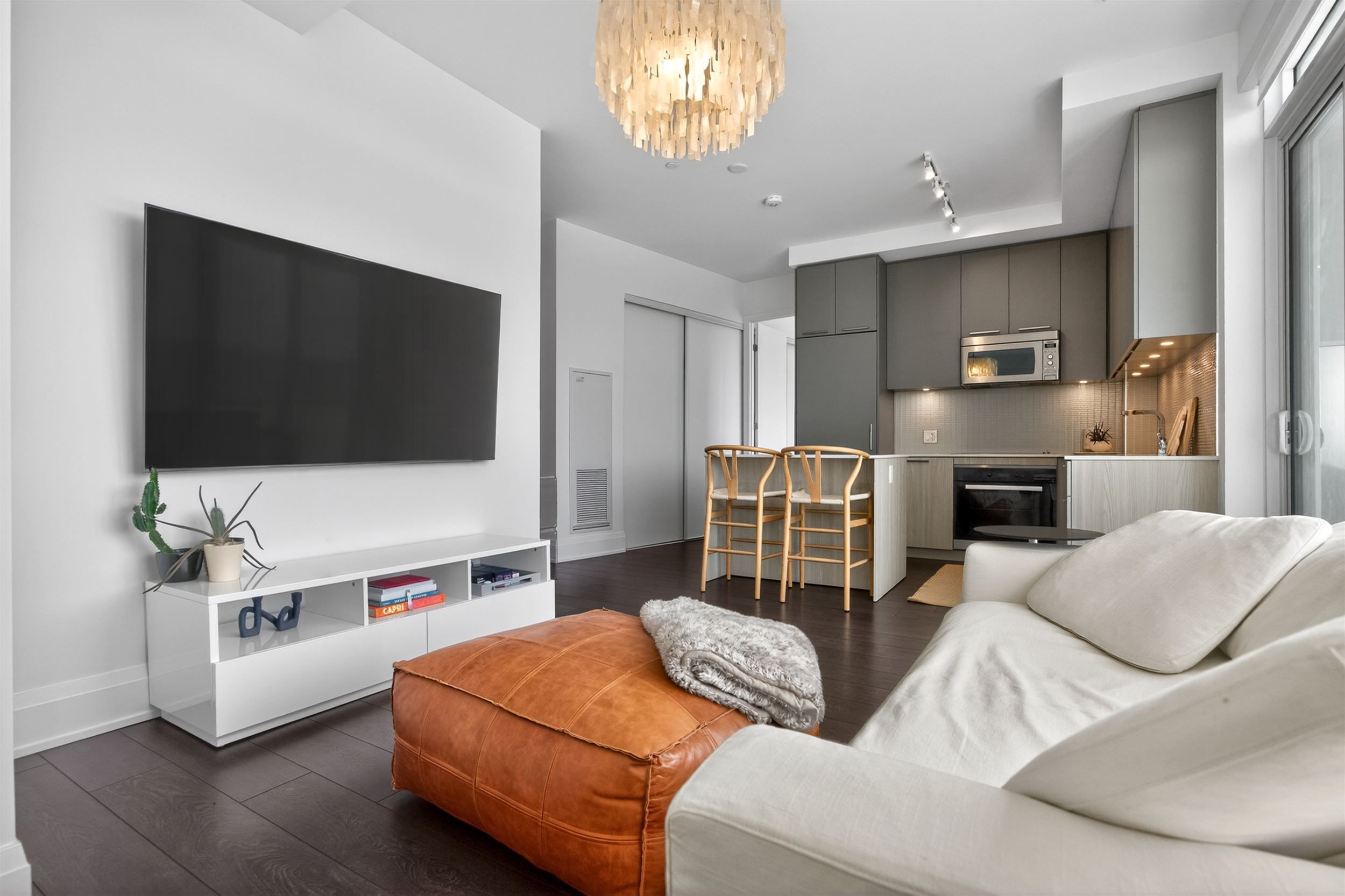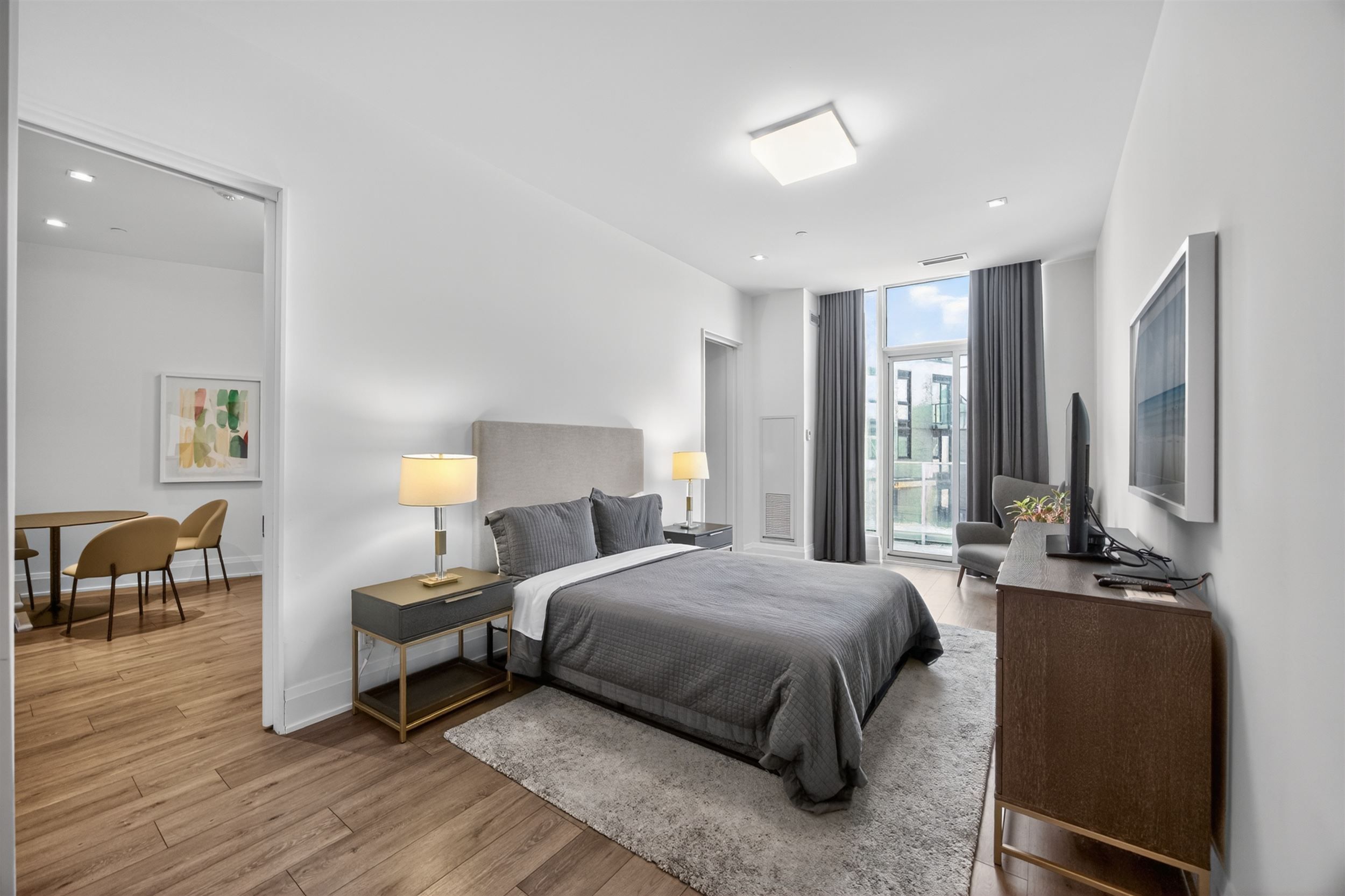 Spectacular sub-penthouse condo flooded with natural light, featuring soaring 10-foot ceilings and expansive southwest views. Enjoy seamless indoor outdoor living with an impressive 30-foot-wide private balcony spanning the entire width of the suite. Complete with a gas line- perfect for evening bbqs while taking in the stunning sunsets. The thoughtfully designed l-shaped kitchen offers an ideal workspace for home cooks and entertainers alike, featuring extended cabinetry for ample storage, a functional island for prep and gathering, and integrated miele appliances including a sleek induction cooktop. This spacious bedroom includes a large closet and a blackout window covering for added comfort. An open concept den flows effortlessly off the living area, creating a versatile space ideal for a home office or fitness nook not to mention high speed internet is included! Additional features include upgraded lighting, a generous entryway, a bathroom medicine cabinet for added storage, and modern light toned finishes that create a clean, organic aesthetic throughout. Complete with one parking space and one locker. This is a rare opportunity to lease a bright, well appointed sub-penthouse in a highly desirable setting.