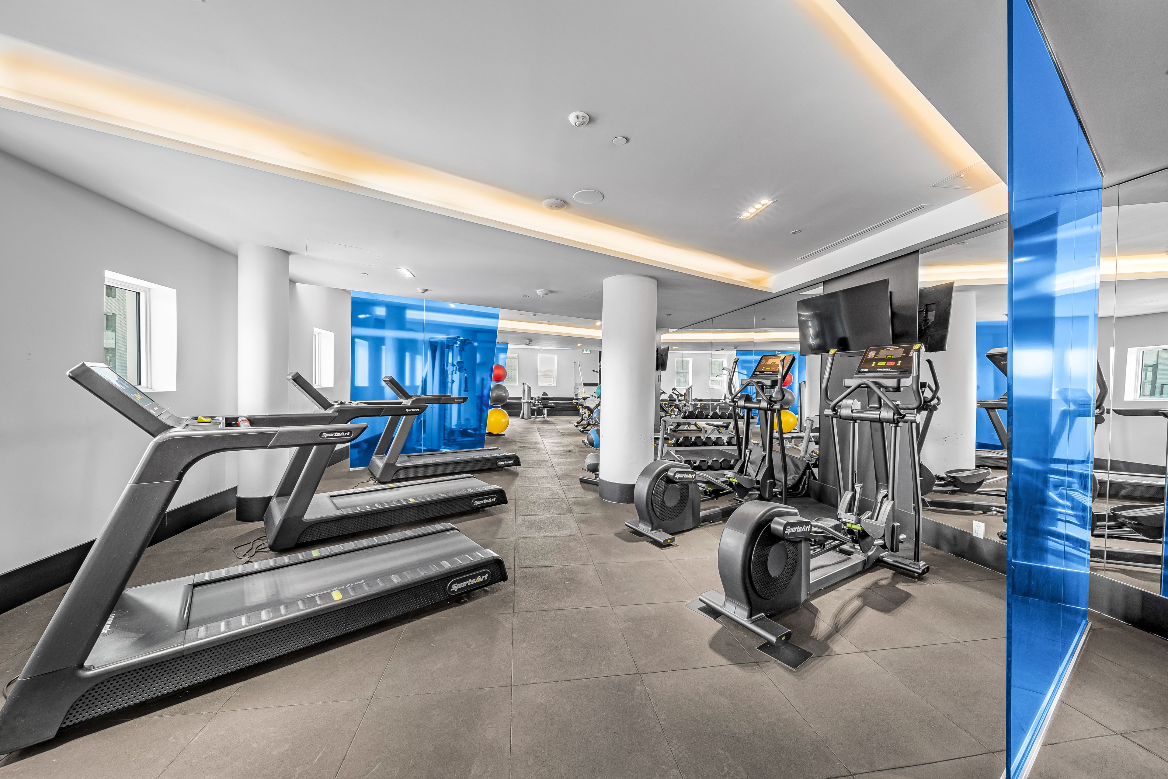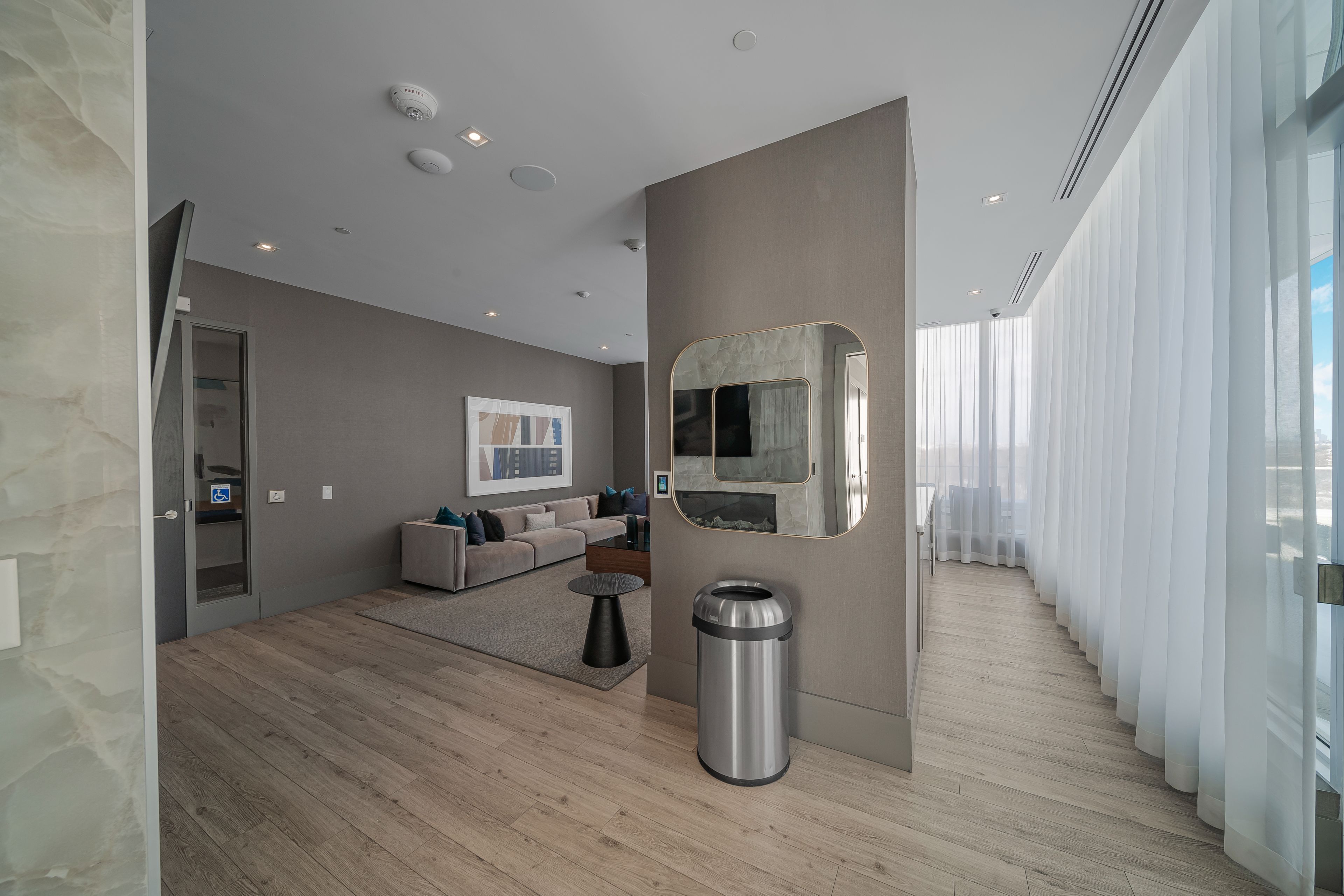 • Open concept design with tall ceilings and floor-to-ceiling windows.