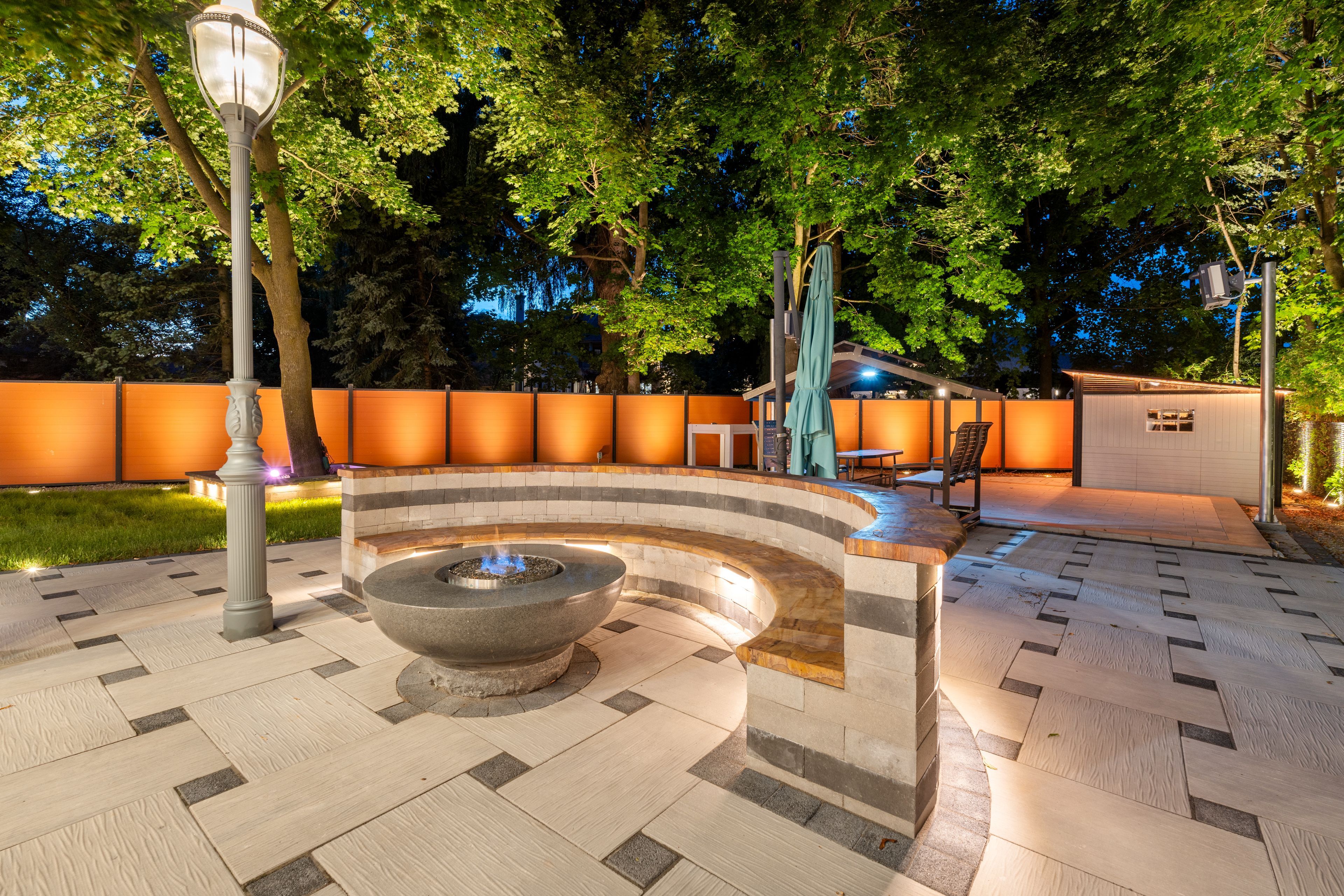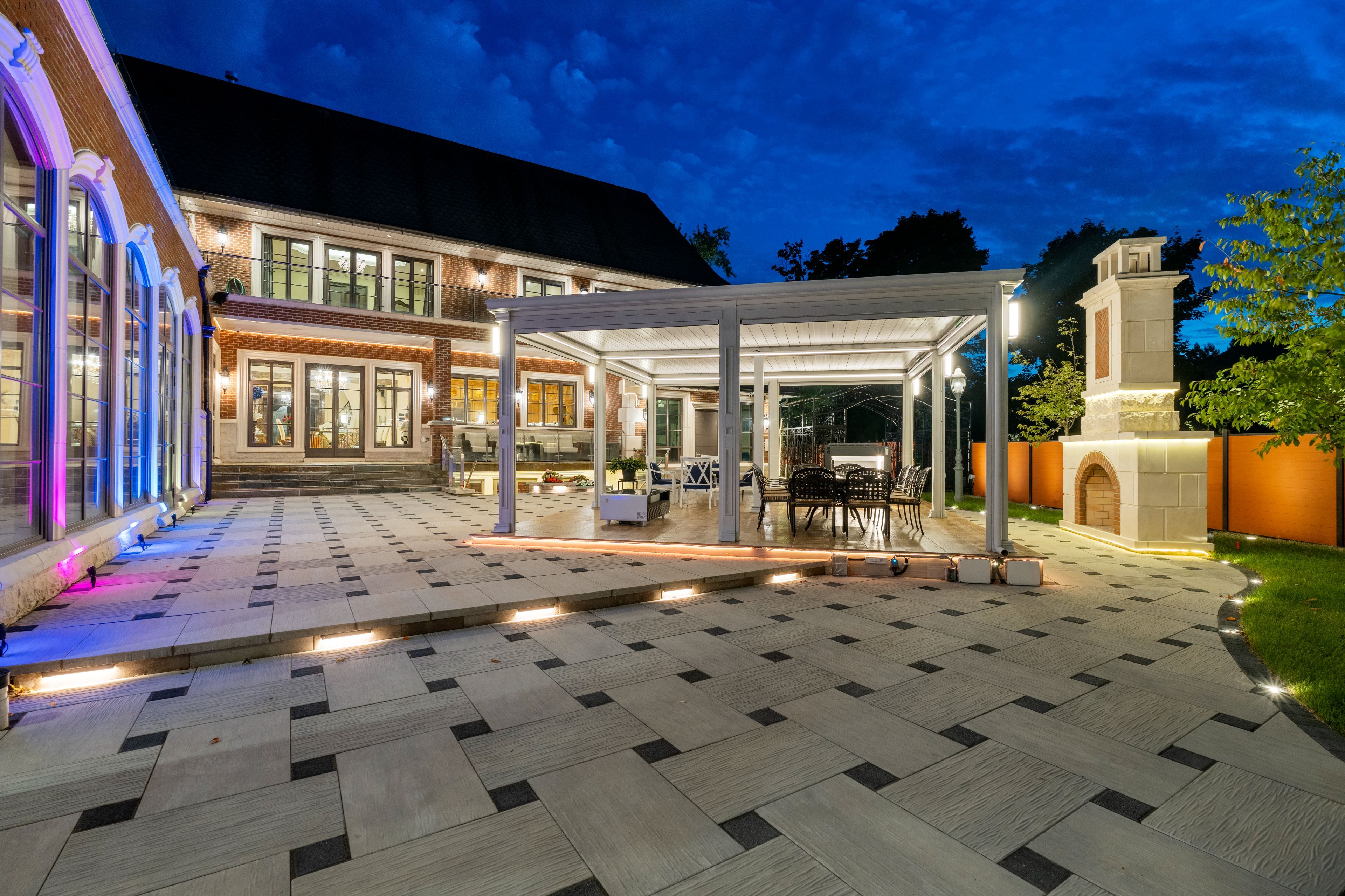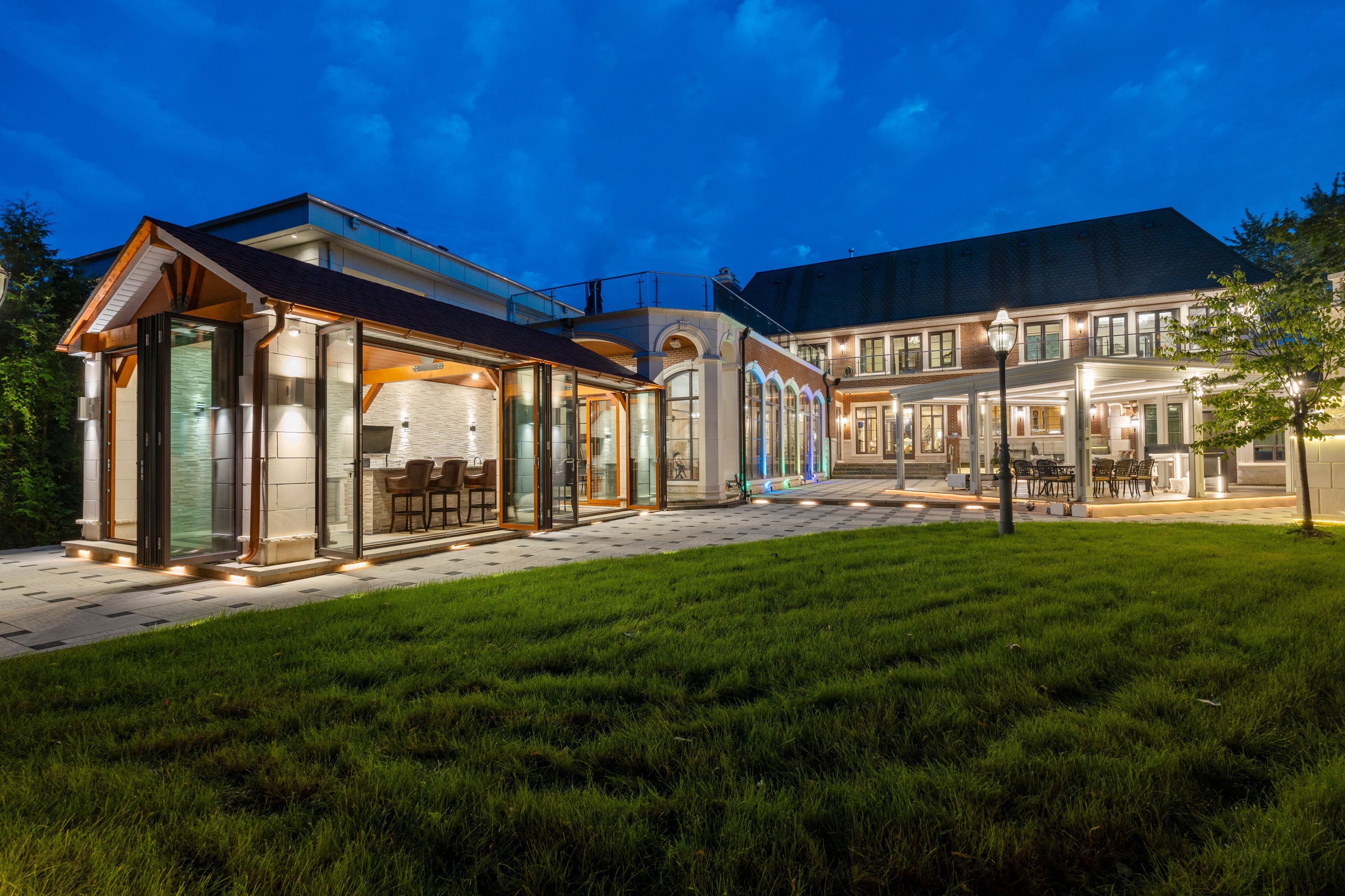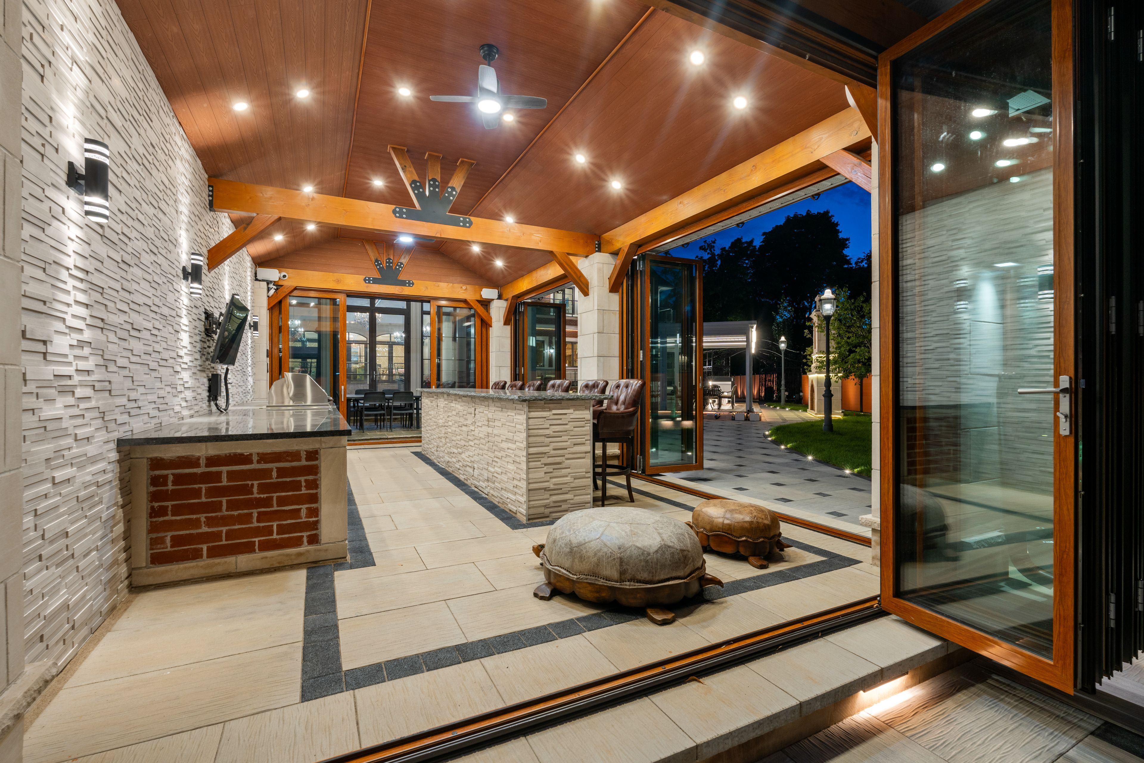 • Backyard features a covered veranda, outdoor kitchen, and entertainment area.