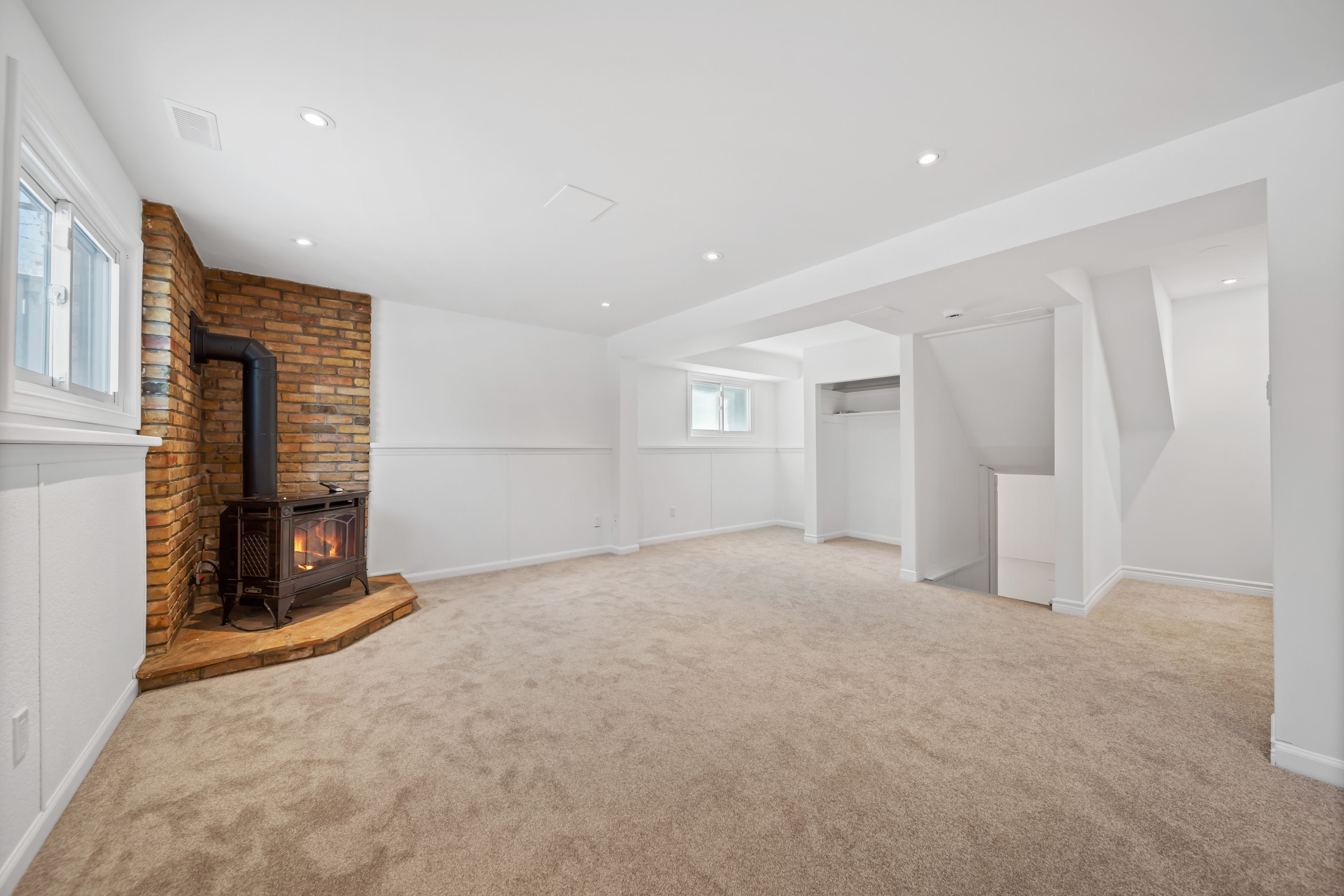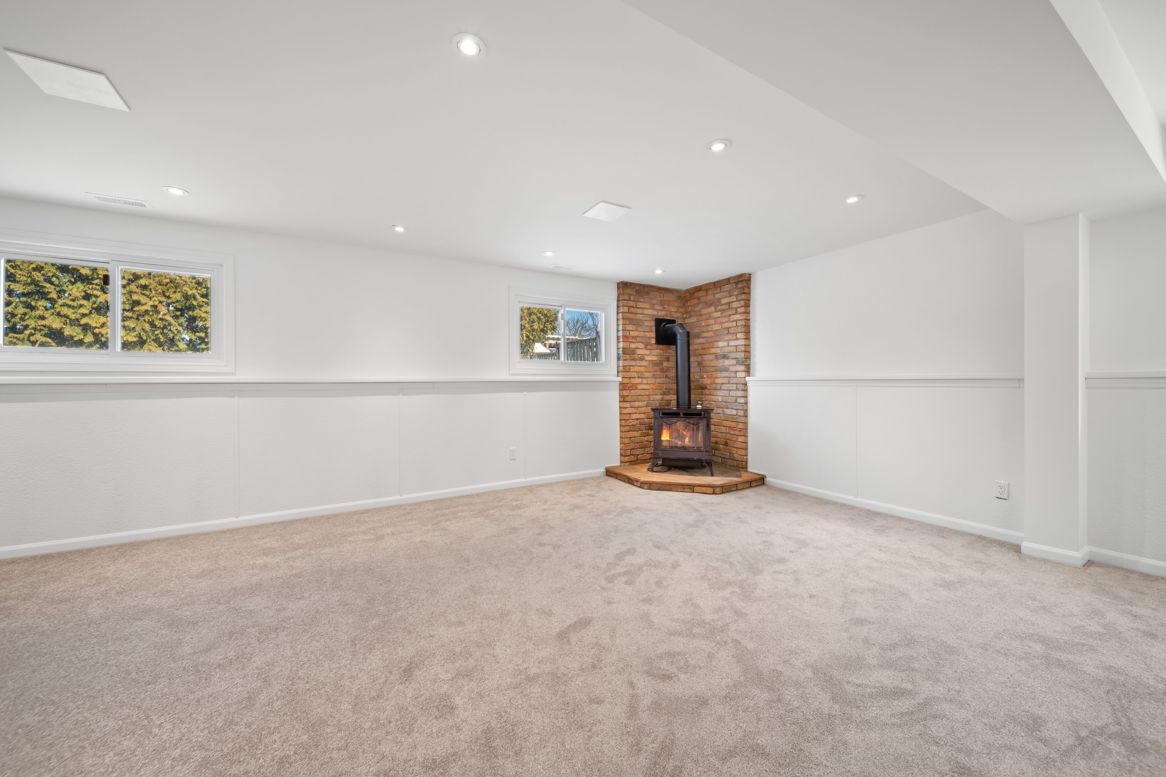 • Cozy lower-level family room with a gas fireplace and new carpeting.