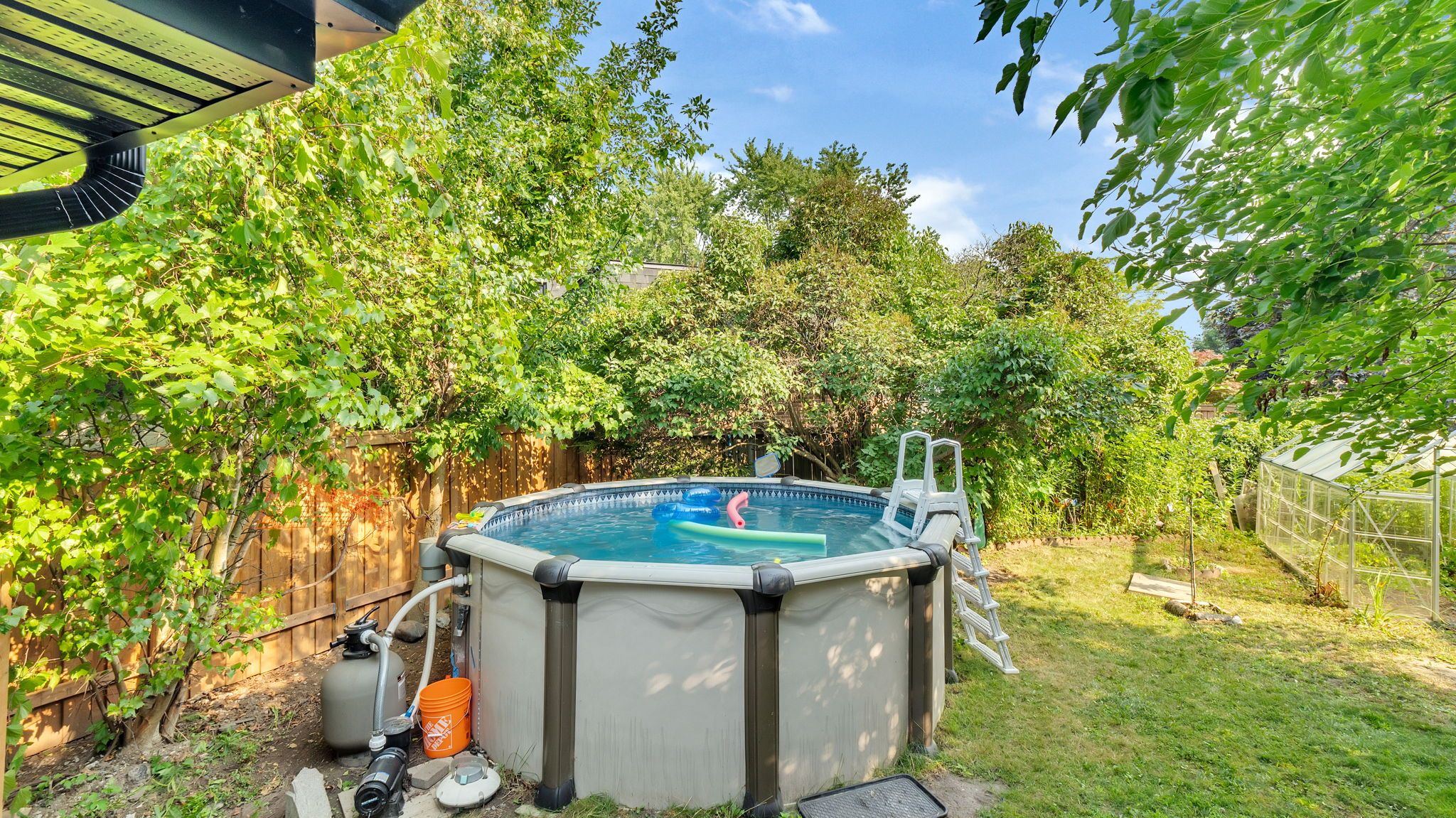 • Private backyard features a deck, above ground pool, and fruit trees.