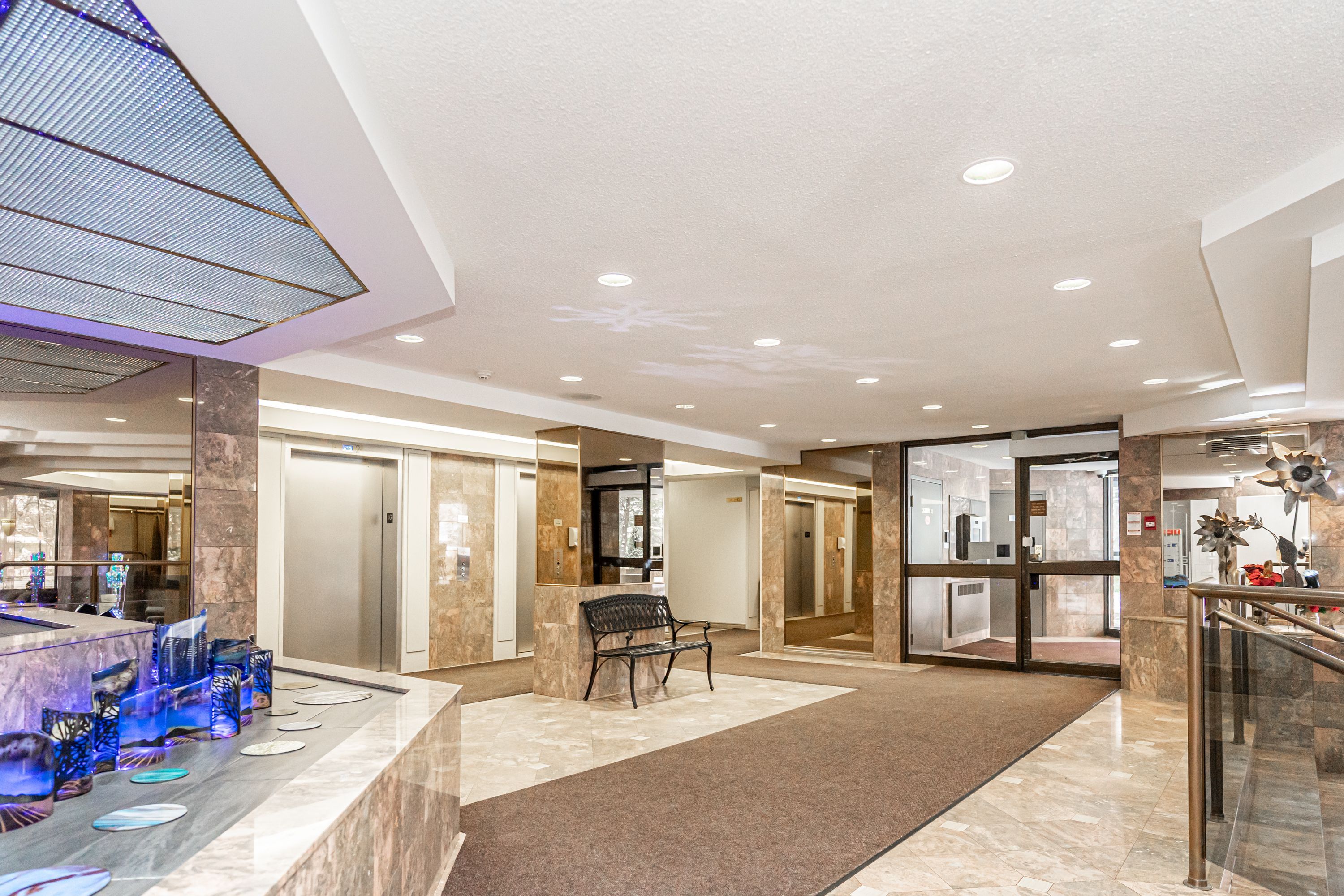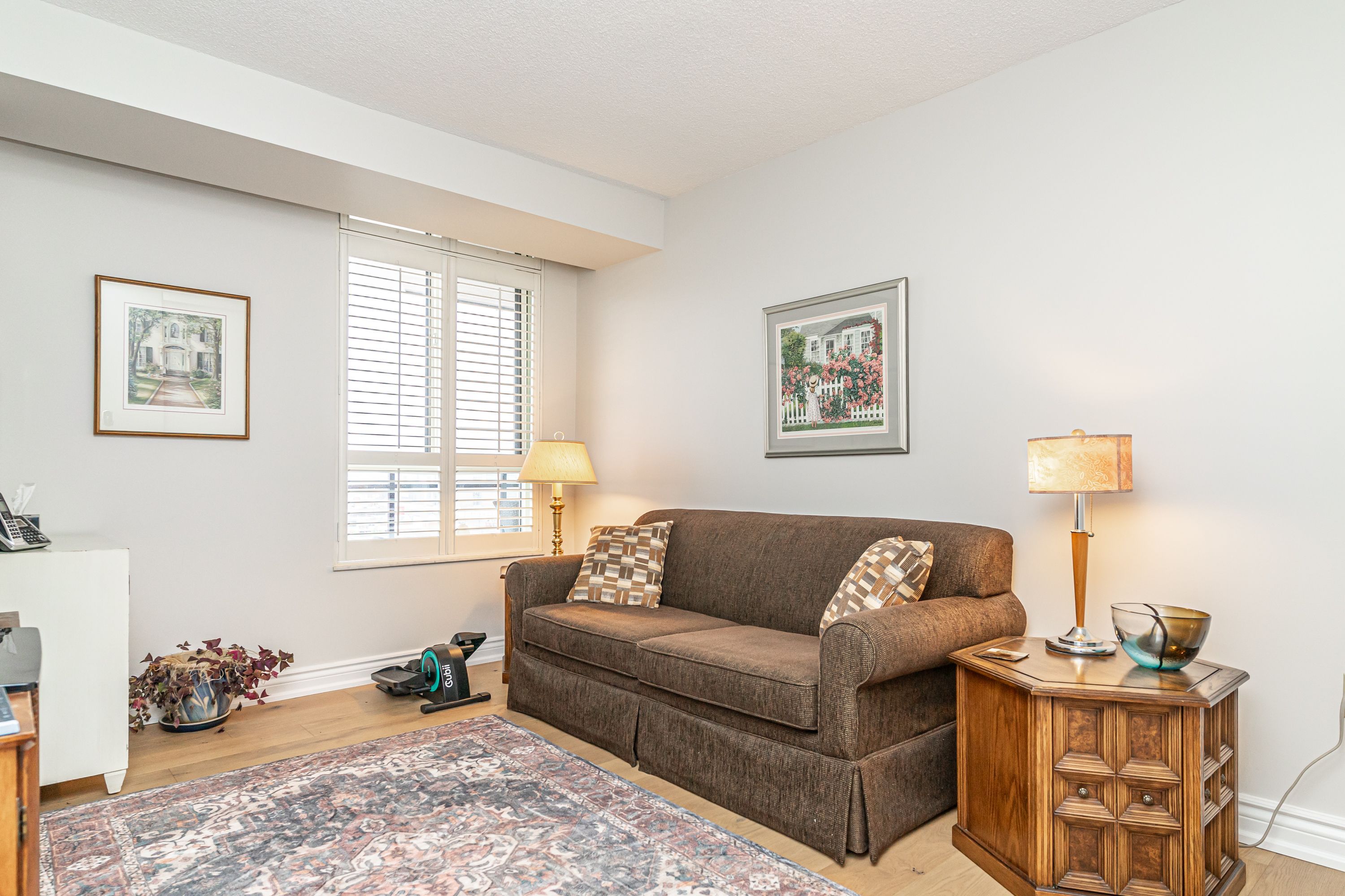 Condo living at it's finest! Exclusive, secure and well maintained residential building with many amenities & upgrades. Beautiful & bright open concept main living area. Large 1537 sq ft, 2 bed, 2 bath with den (potential 3rd bdrm), solarium and walk out to private open balcony with garden & sunset views. Welcoming polished tile floor entry w/ dbl. Coat closet & lg window views. Open living & dining rm area w/ floor to ceiling balcony door & windows, california shutters, modern engineered hardwood floors & crown molding throughout. Lovely eat in kitchen w/ amazing city views, quartz counter & plenty of cupboard space. Primary bedroom with walk in closet & 3pc ensuite bath w/ lg walk in tile & glass shower. Separate main 4pc bath with tiled bathtub/shower. Sun drenched solarium overlooking the manicured & landscaped grounds with pool, racket courts, putting green, gazebo bbq picnic area, benches & walking paths. Clean & inviting indoor common areas, gym, squash court, sauna, hot tub, party room w/ kitchen, pool table & reading room. Close proximity to elevator & parking space. Walk or quick drive to shopping, dining, entertainment, schools, parks & public transit. Mostly owned units in building, only a few rentals. Many condo upgrades - 2 new heating units 2024, new quartz counter, backsplash, refrigerator, dishwasher, faucet and undercounter lighting. New hardwood floor. New counters & toilets in both baths. New washer & dryer. New upright freezer and painted throughout.
