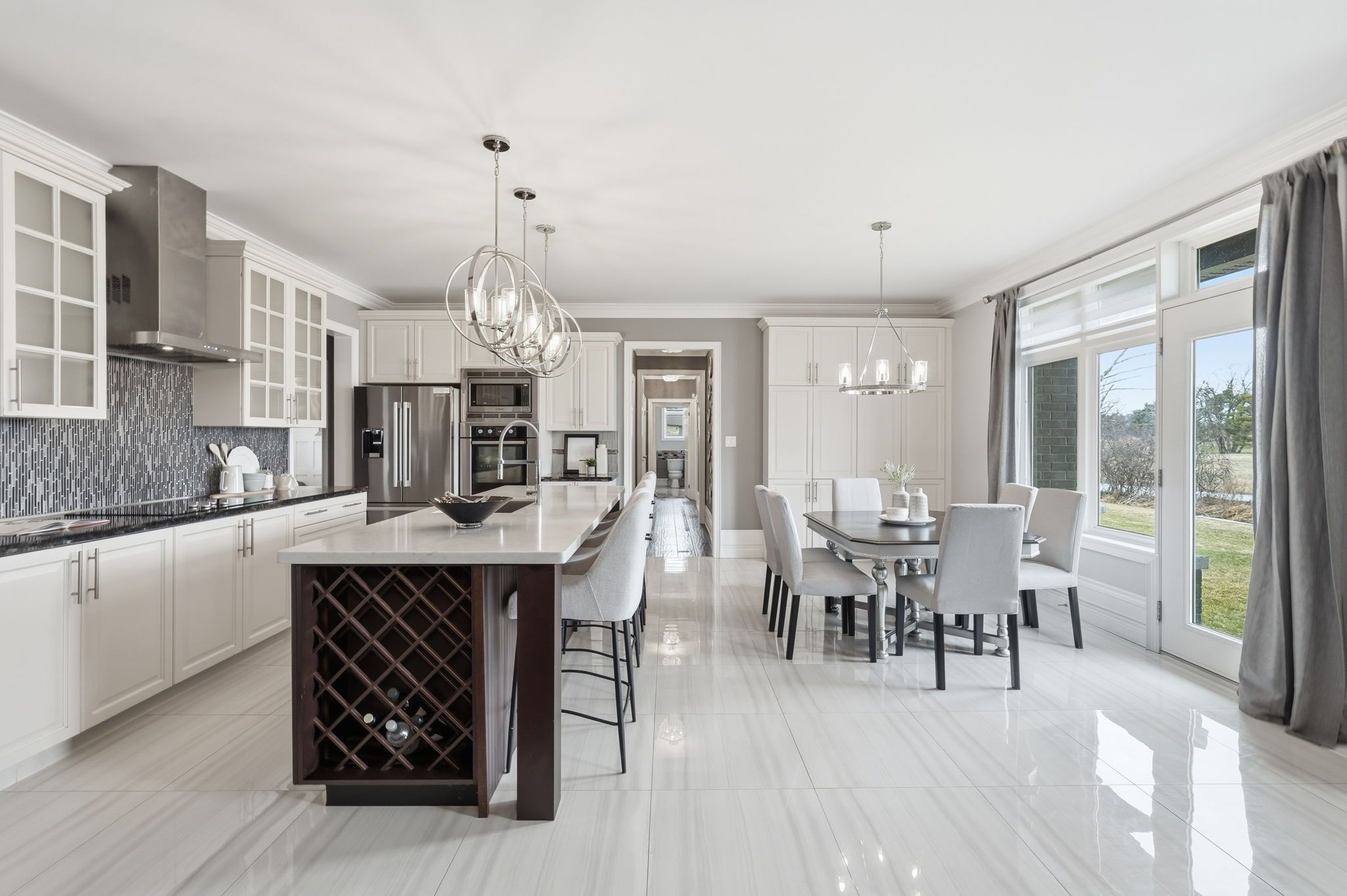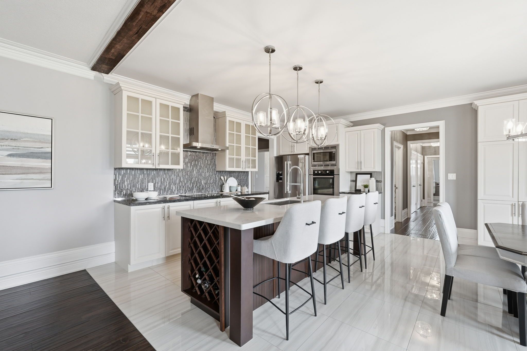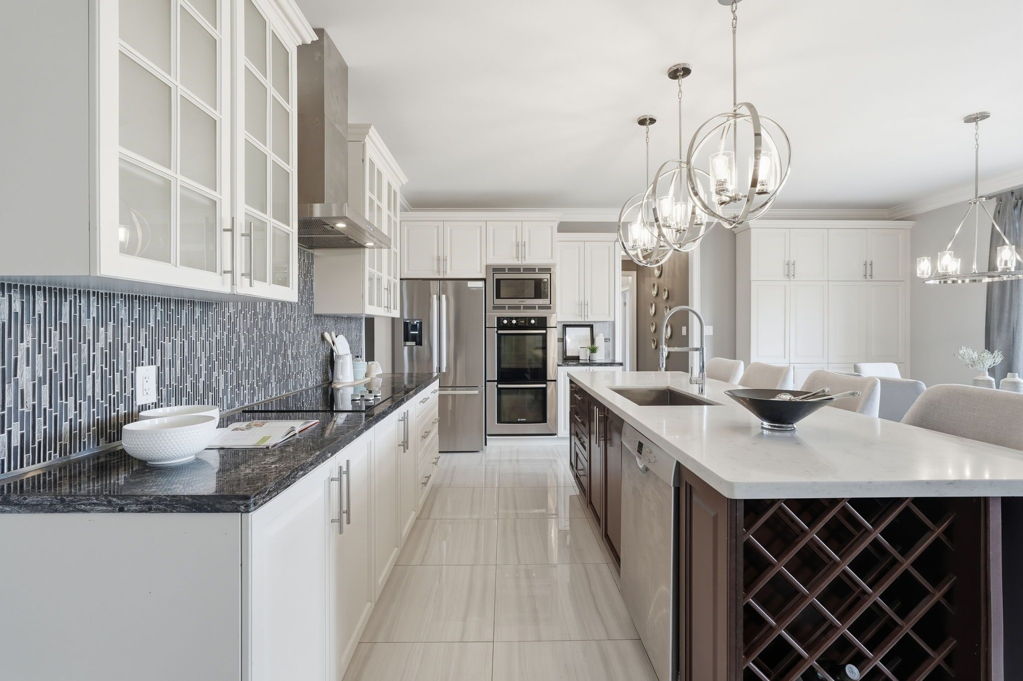 • Gourmet kitchen with granite countertops and a built-in wine rack.