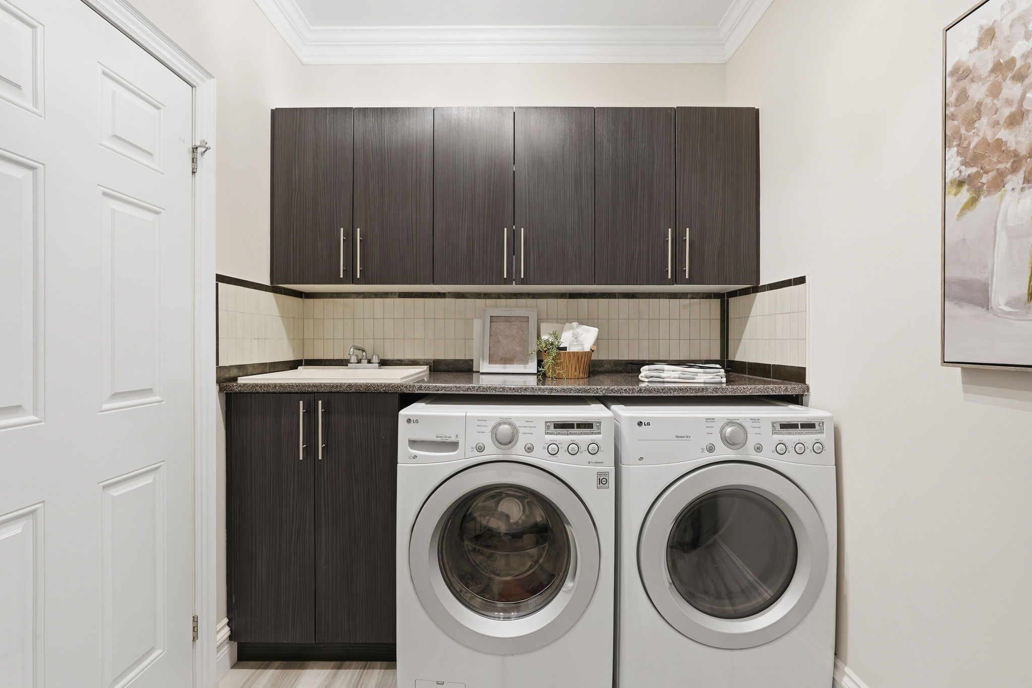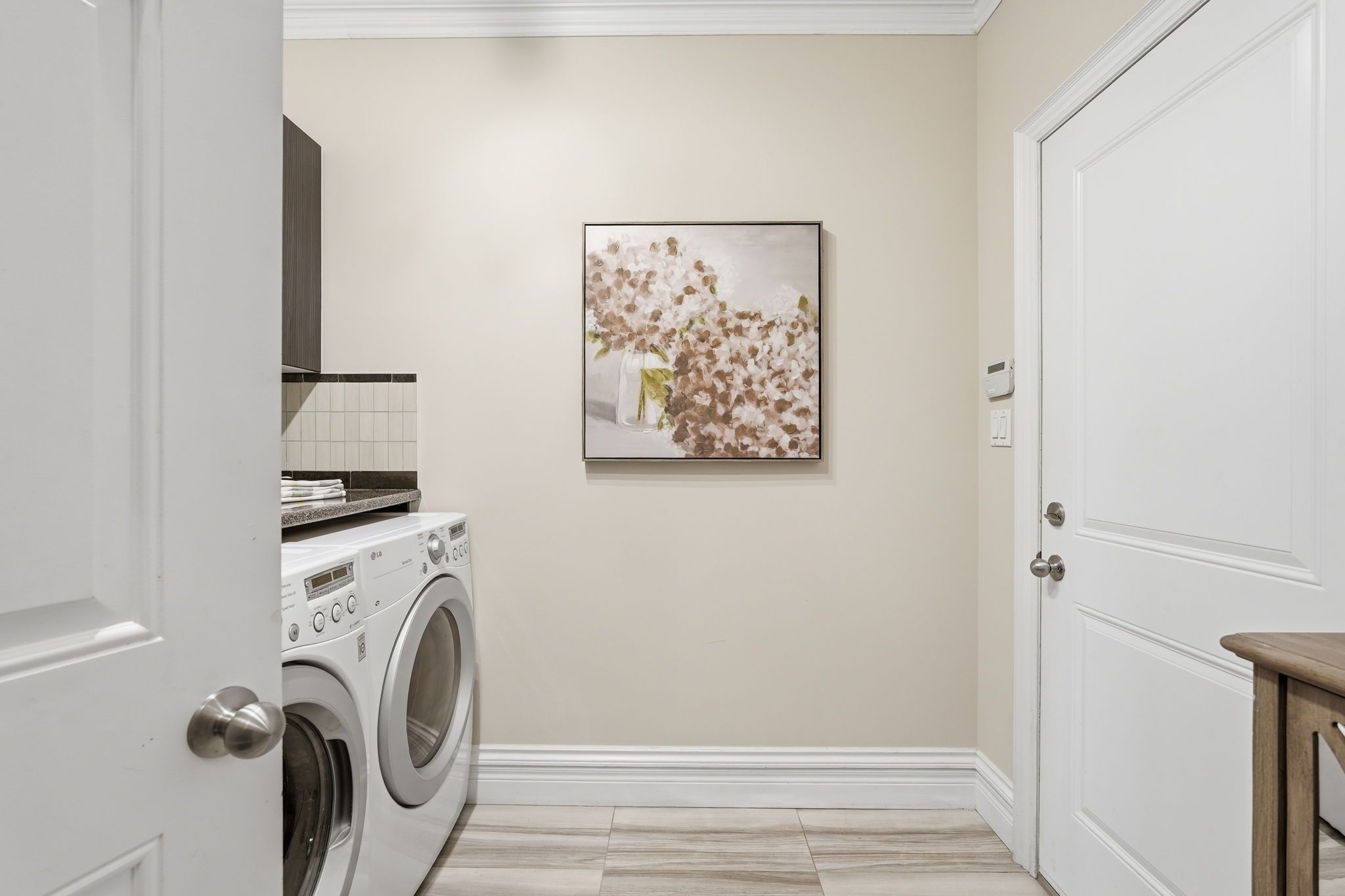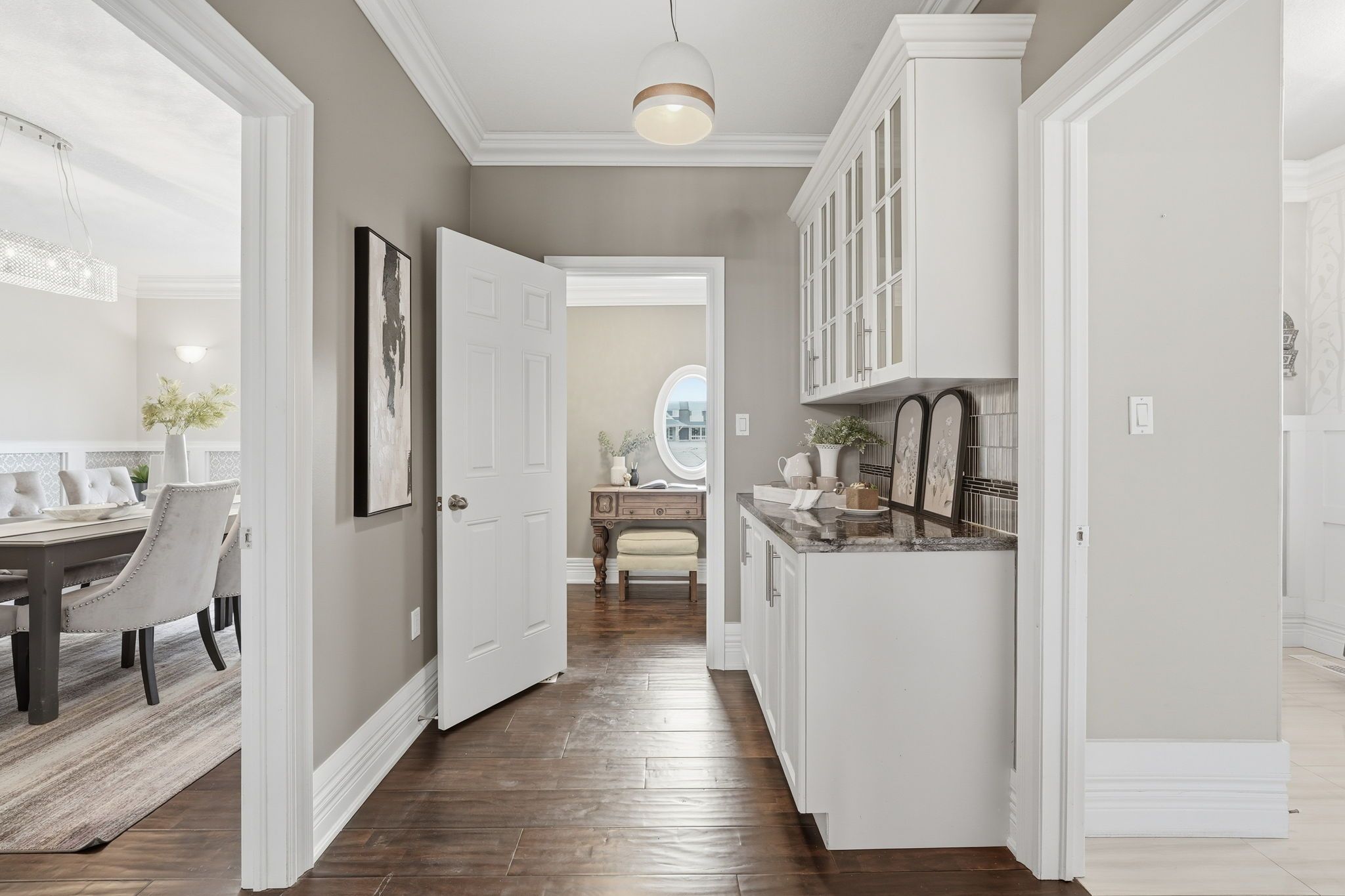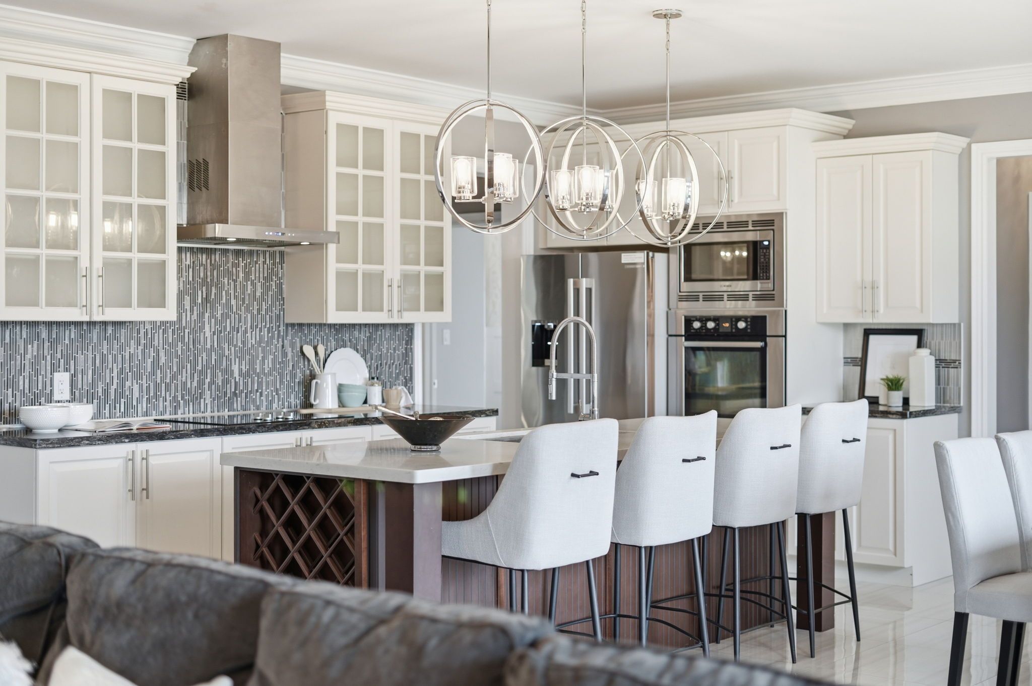 • Gourmet kitchen with granite countertops and a built-in wine rack.