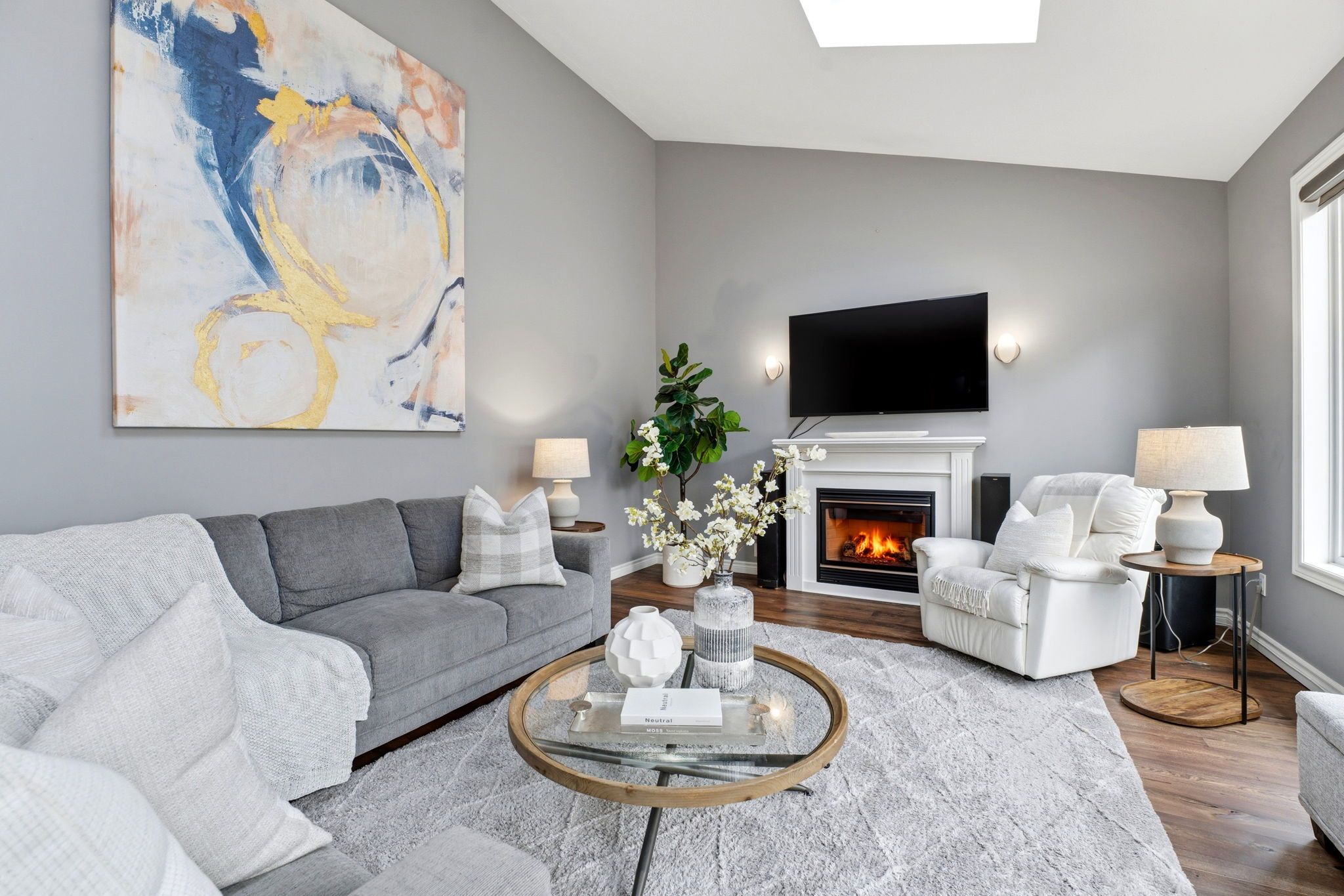 • Bright main floor with vaulted ceilings, skylights, and a gas fireplace.