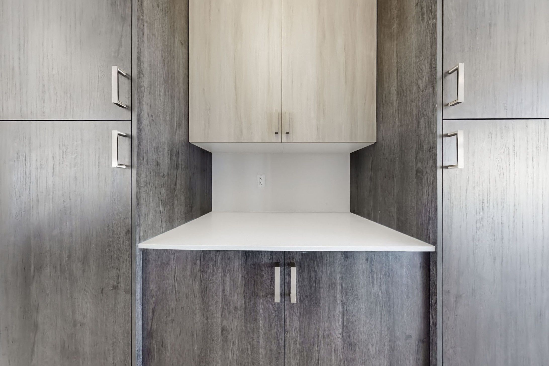 • Chef-inspired kitchen featuring quartz island and stainless steel appliances.