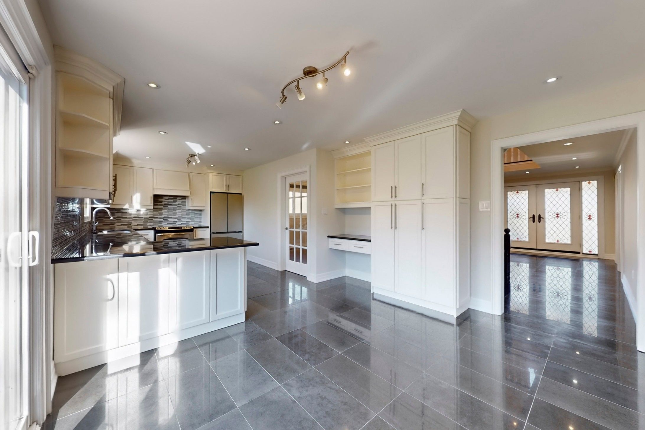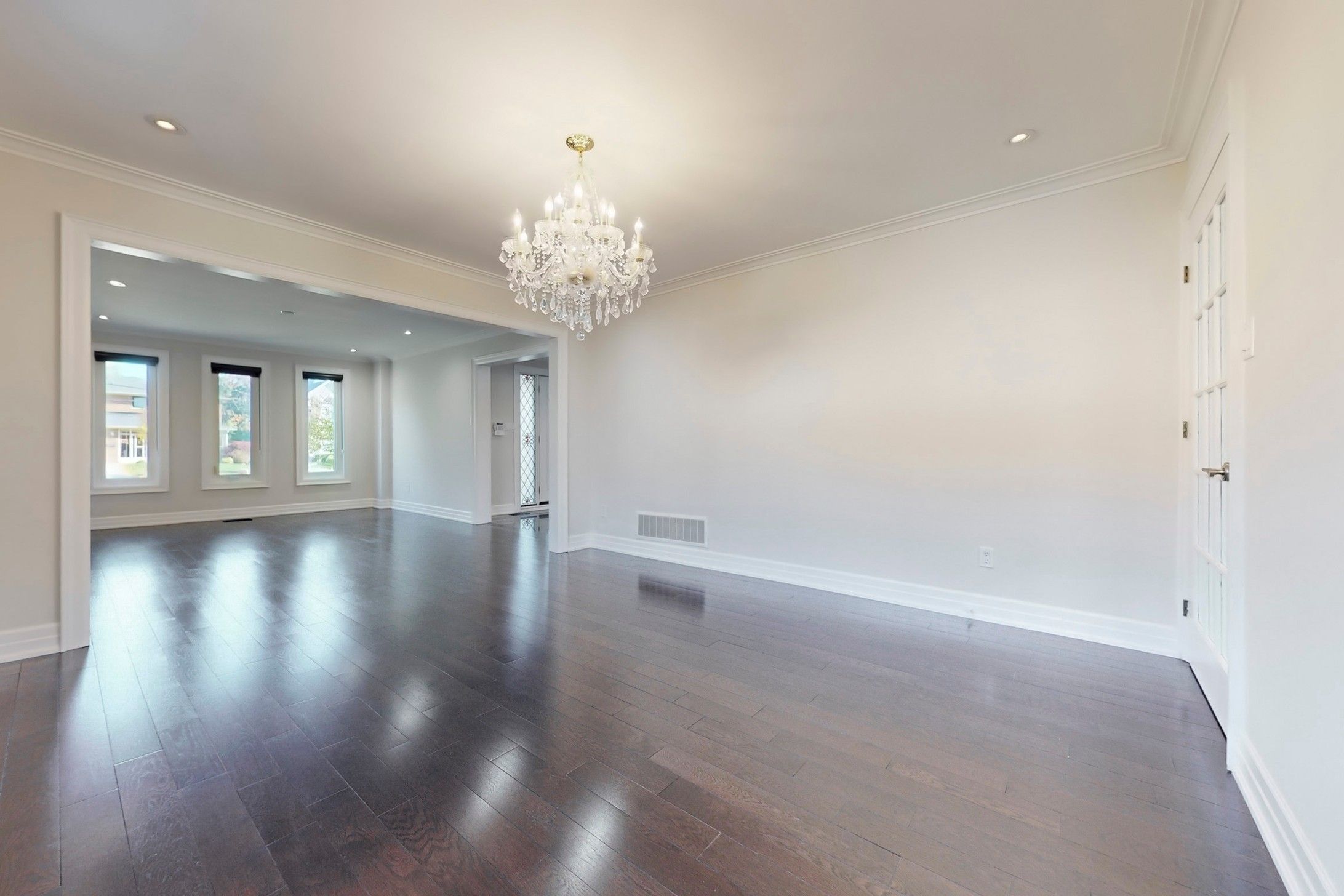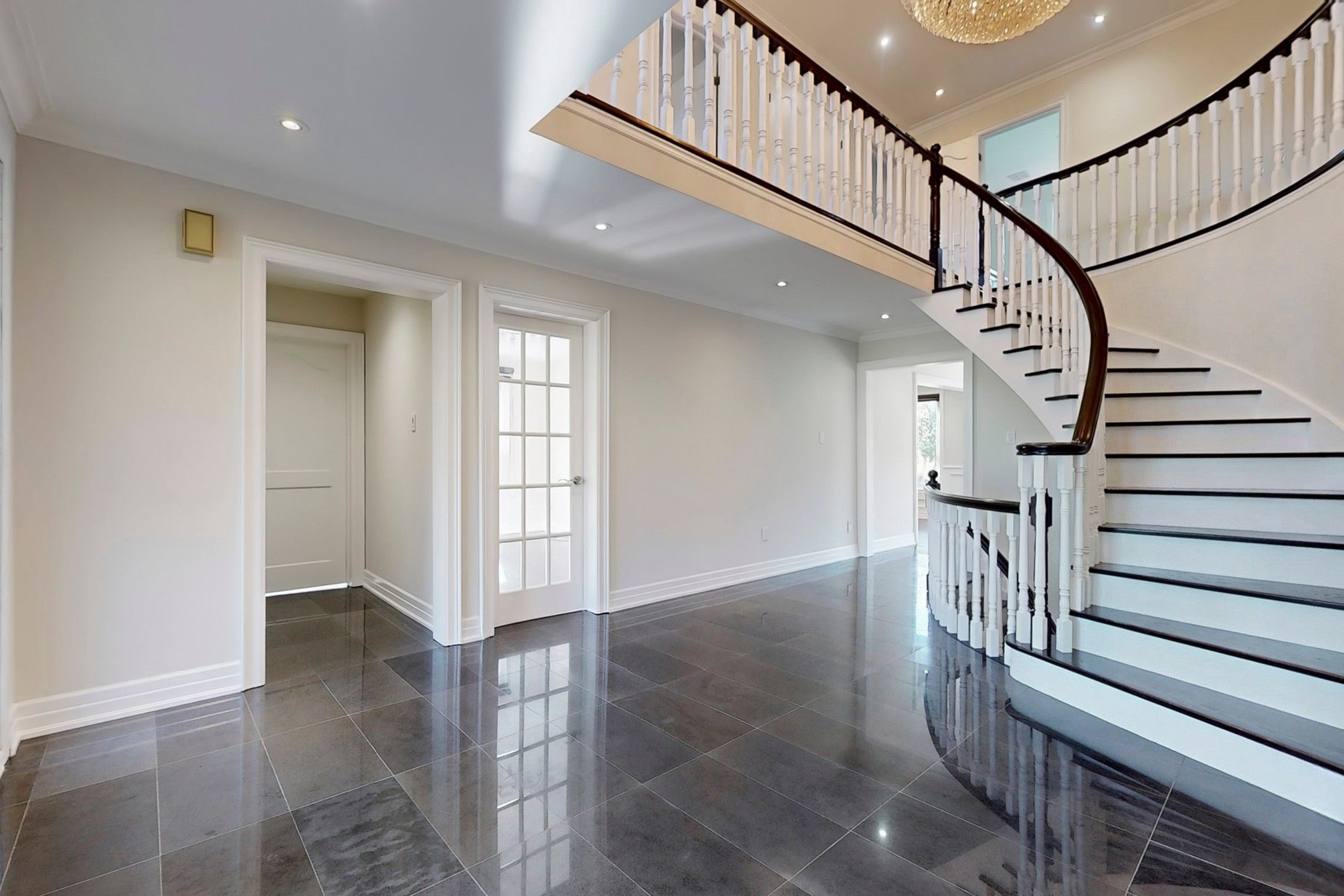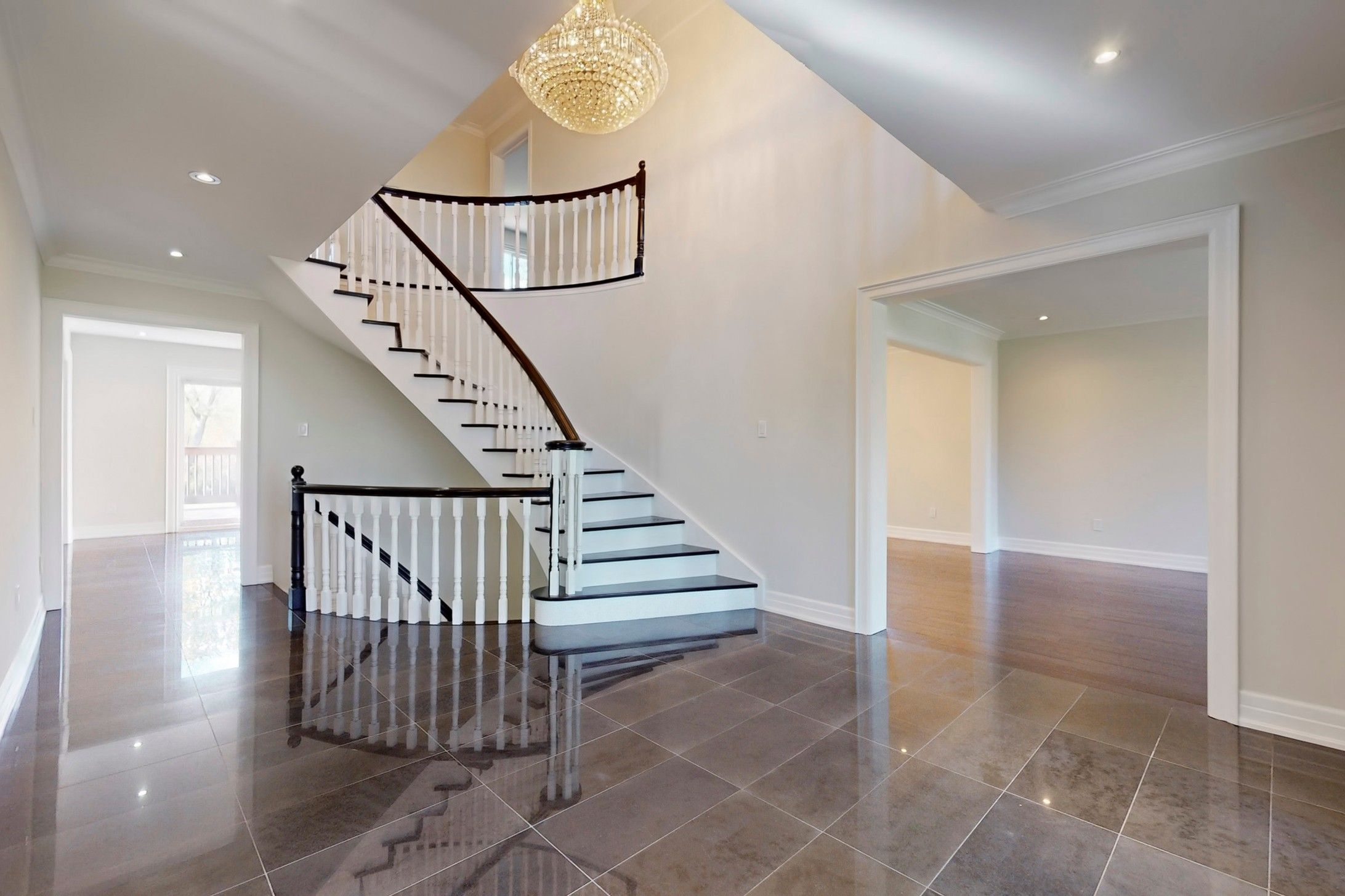• Grand foyer with elegant chandelier and gleaming hardwood floors.