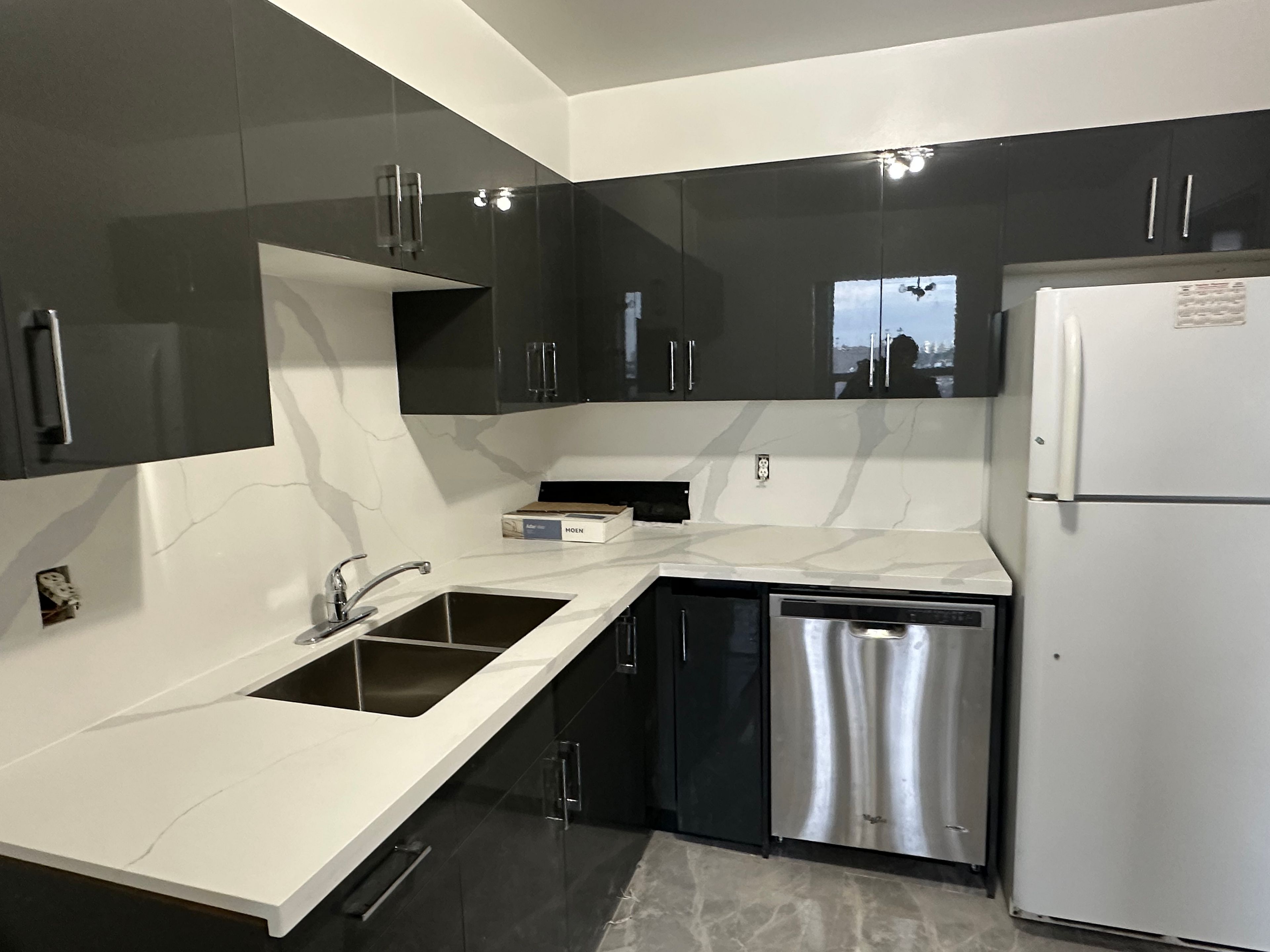 • Recently renovated with modern glossy kitchen cabinets and quartz countertops.