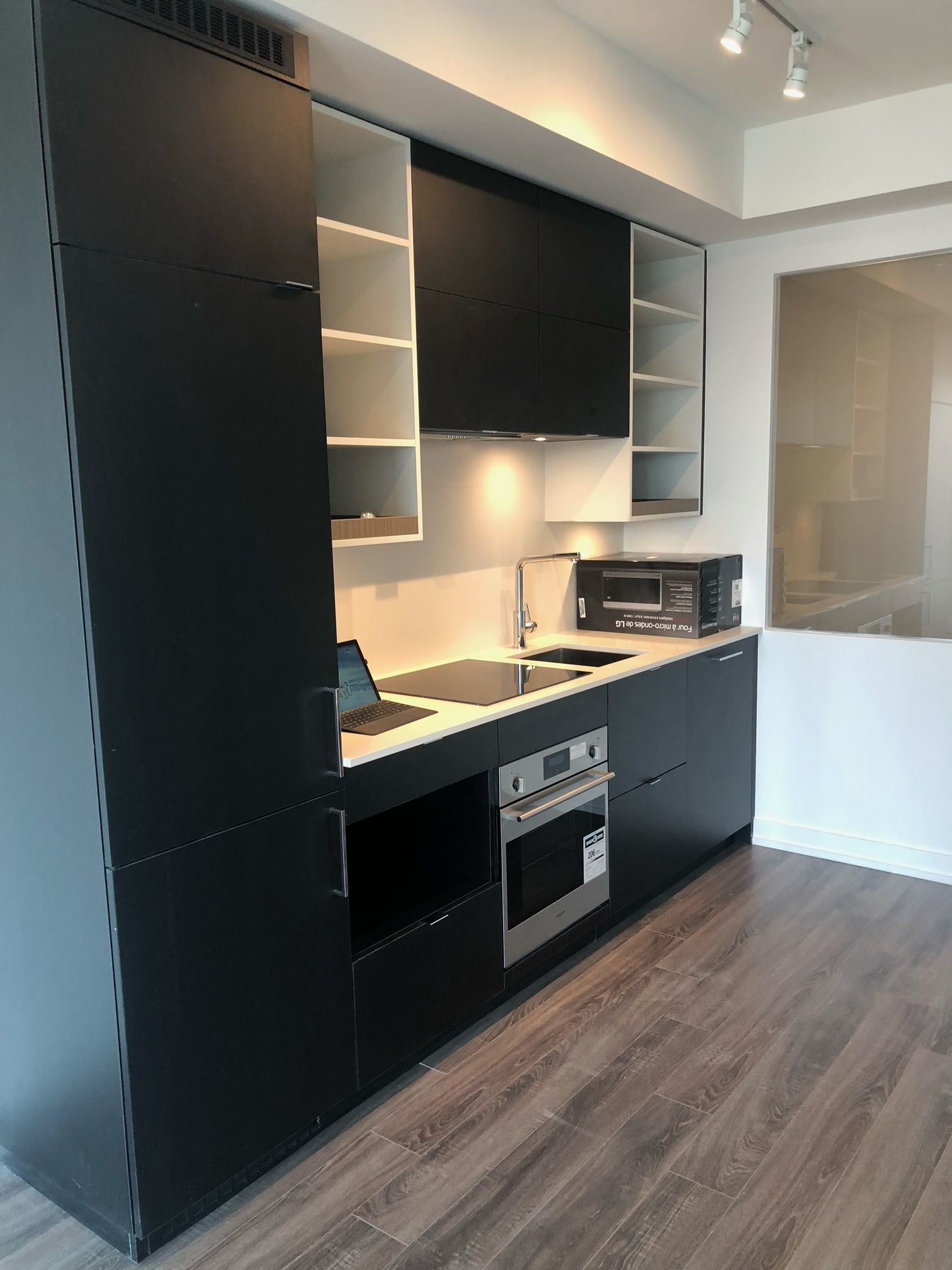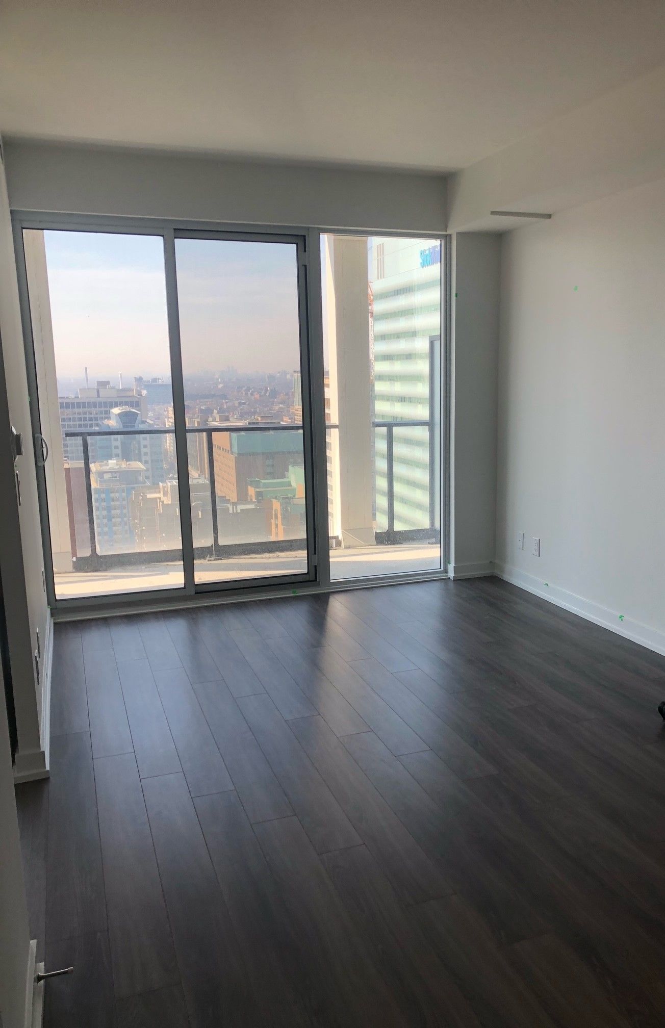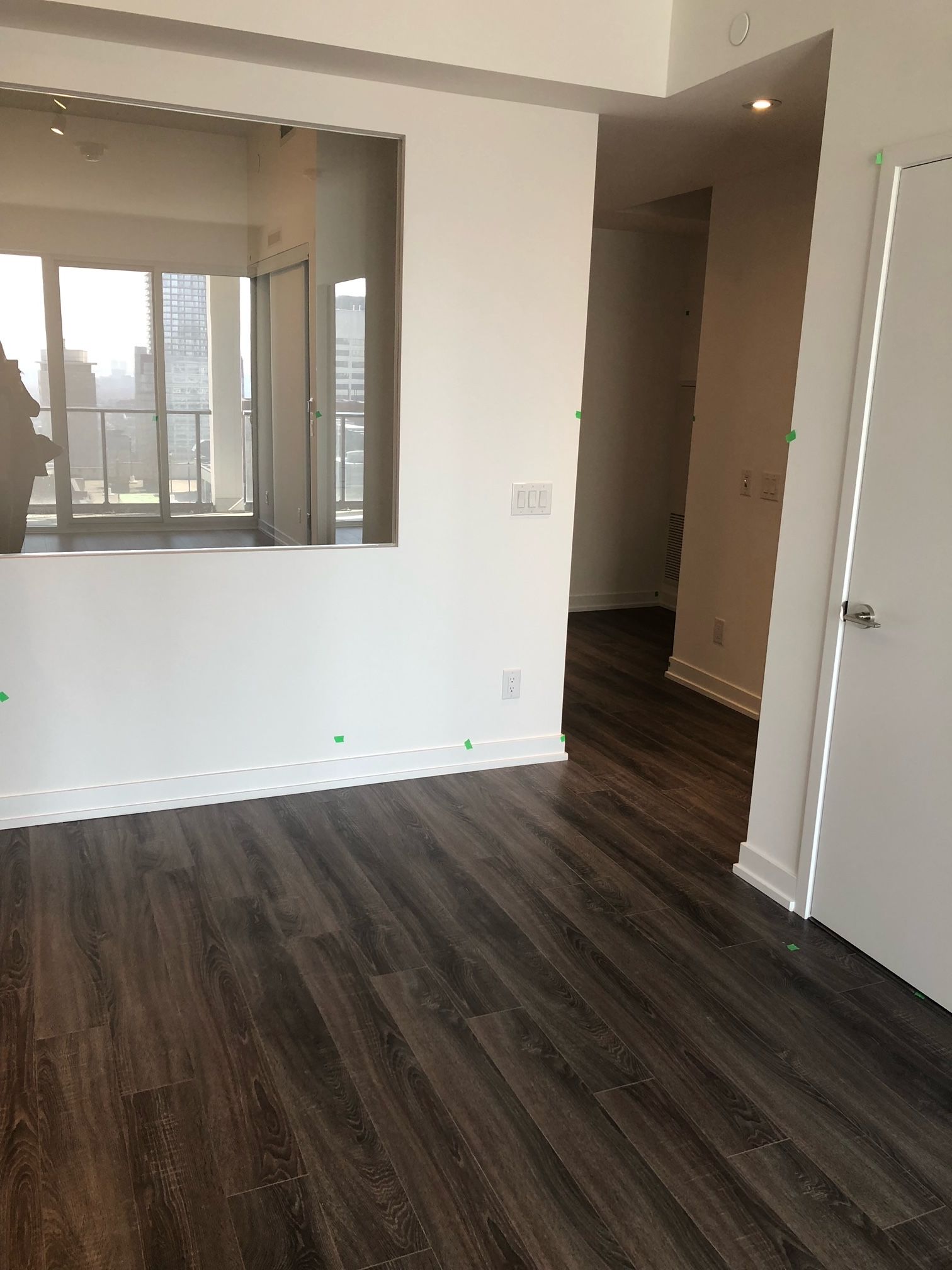 • Bright interior with floor-to-ceiling windows and laminate flooring.
