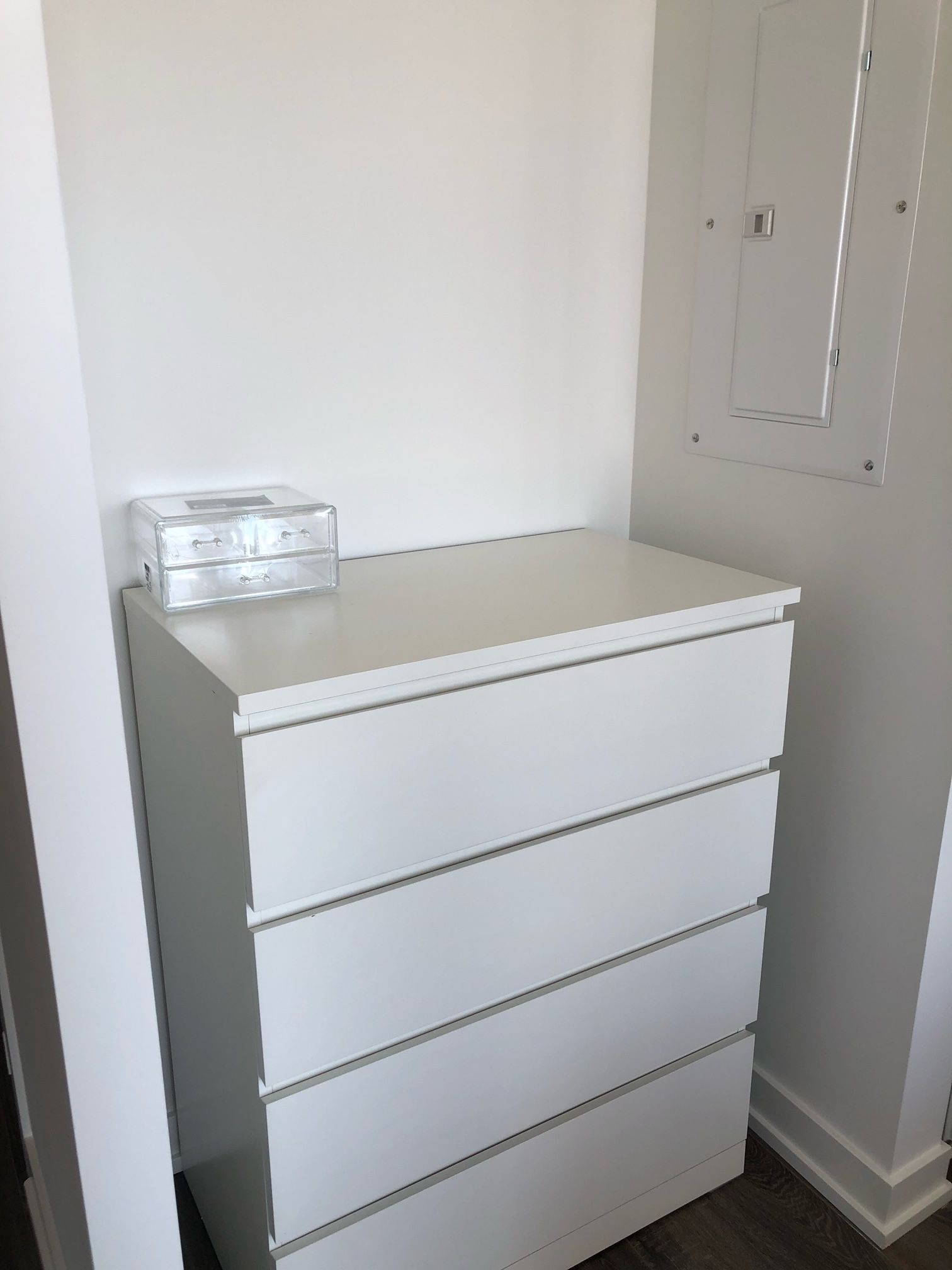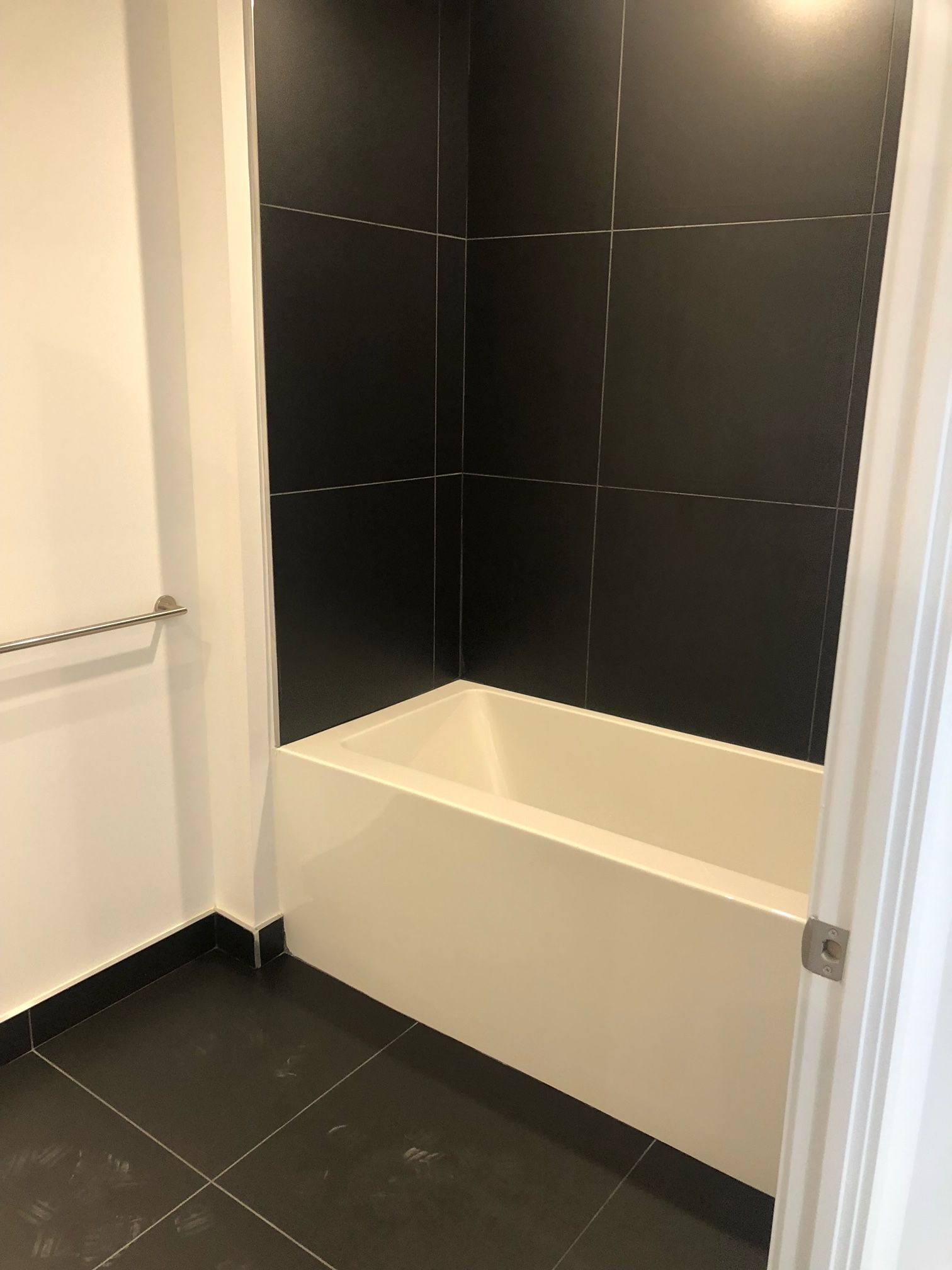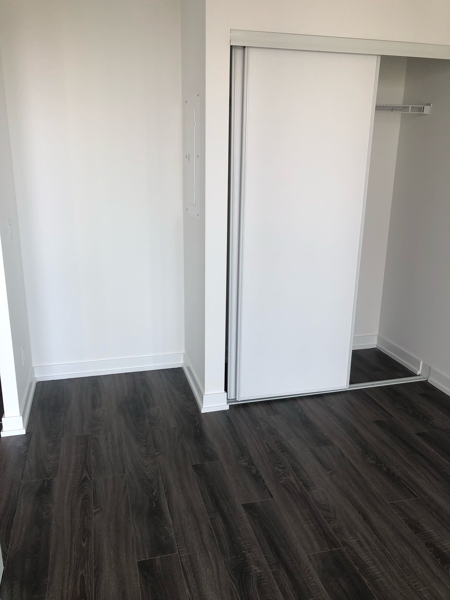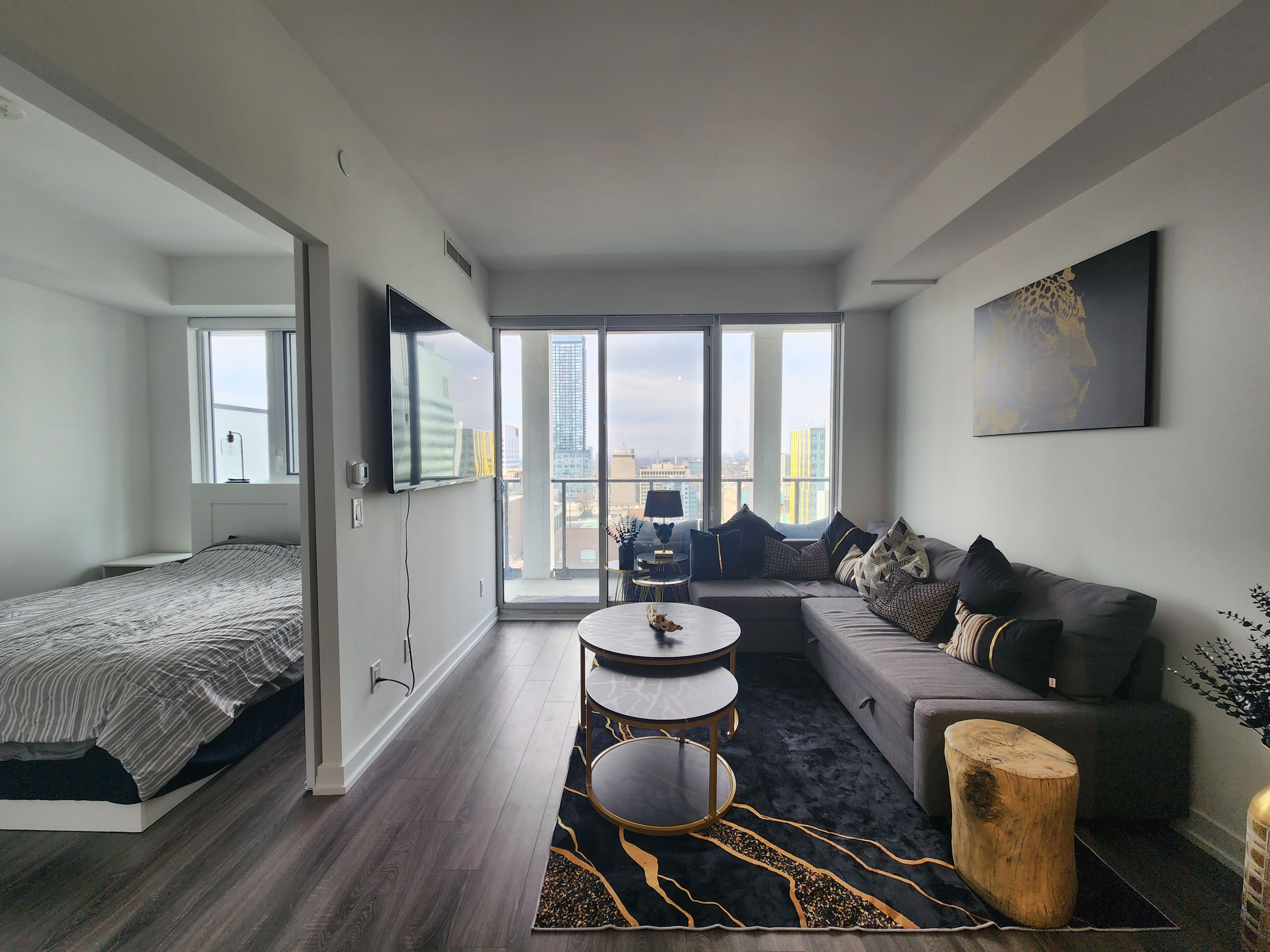 • Bright interior with floor-to-ceiling windows and laminate flooring.