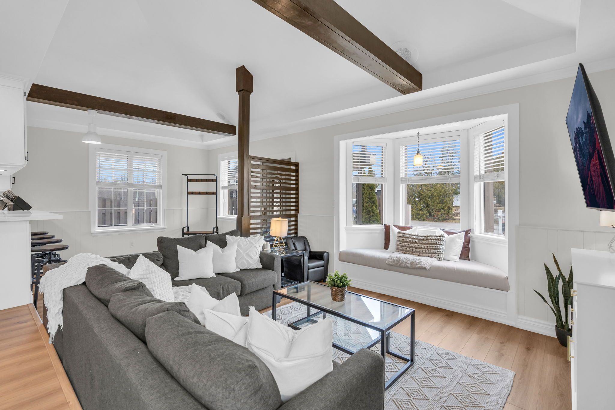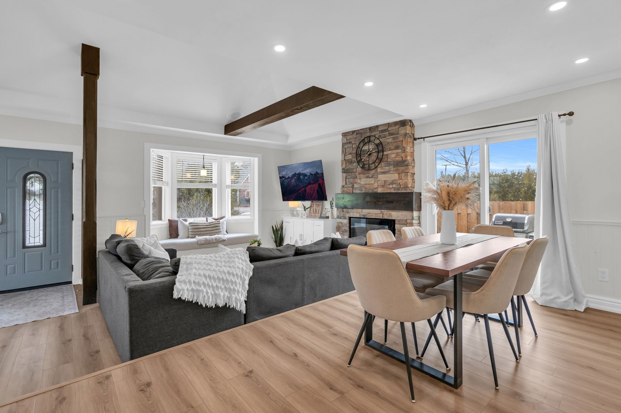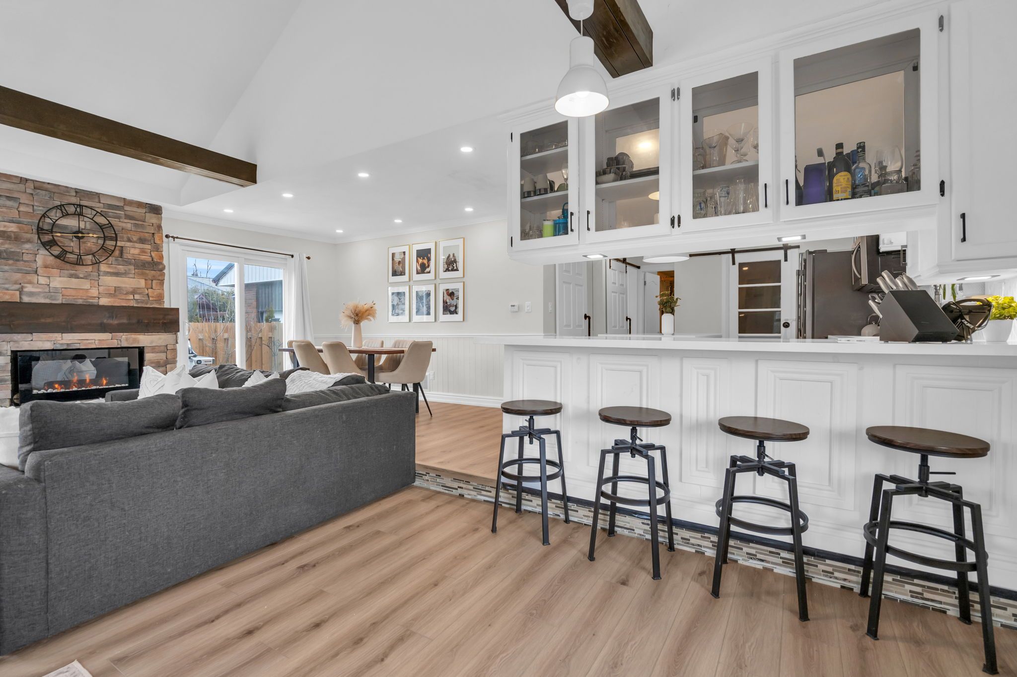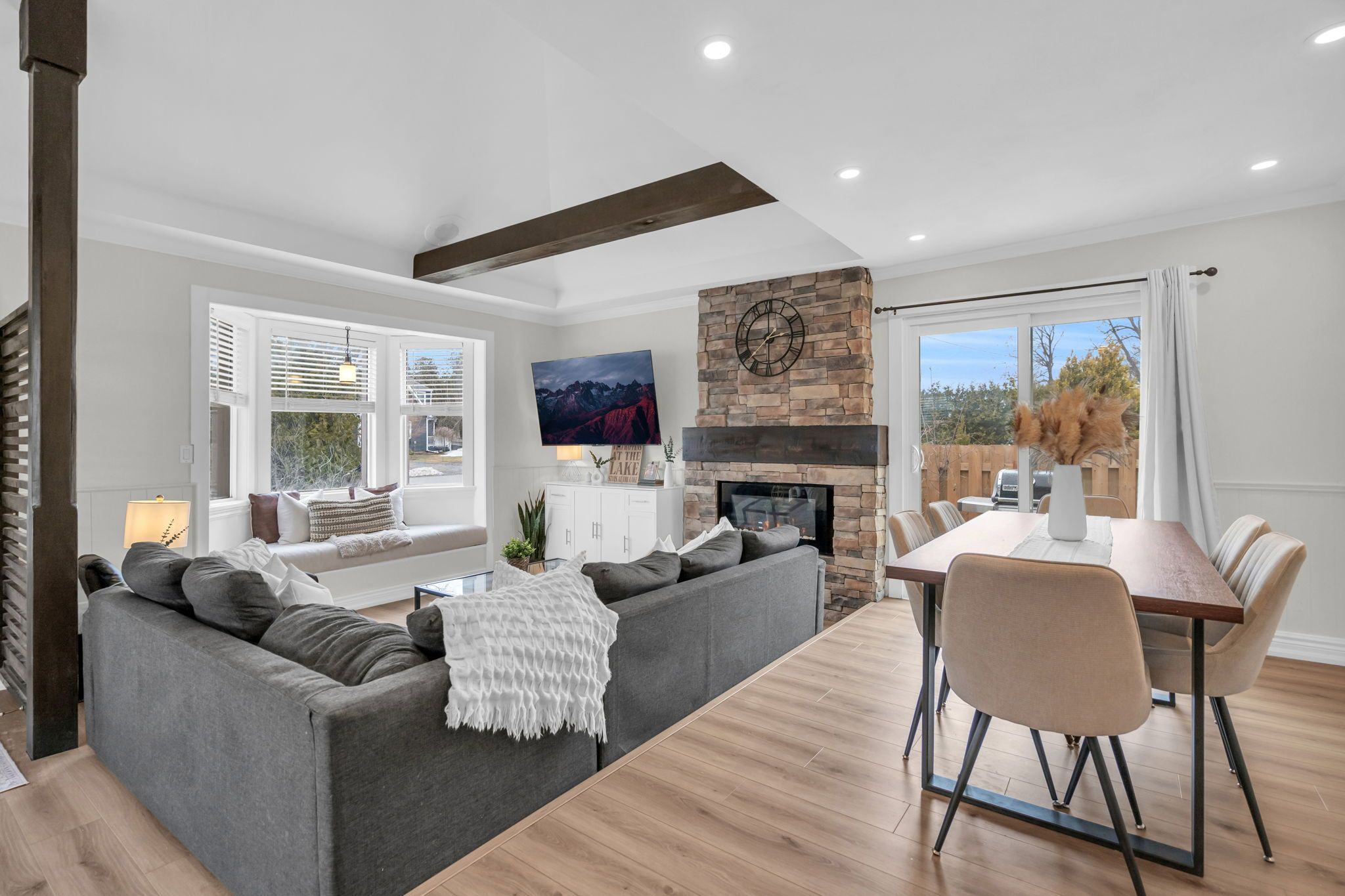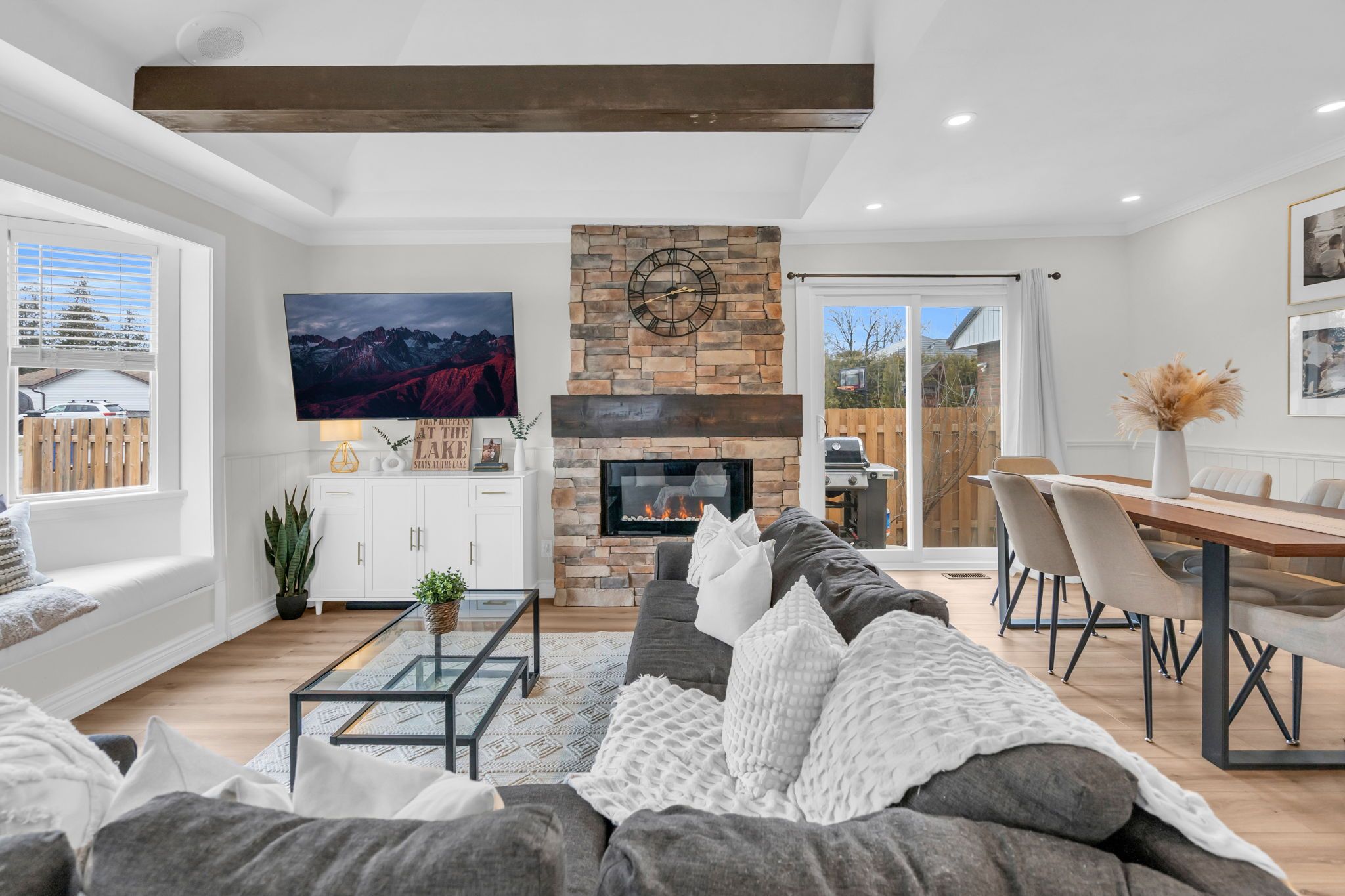 Just steps from lake simcoe with exclusive residents only lake access, this well maintained home features a bright updated kitchen with quartz countertops, new flooring throughout the main floor, fresh paint, and plenty of natural light. The sunken living room is full of character with cathedral ceilings, wooden beams, a cozy bow window nook, and a beautiful new fireplace feature. The spacious primary suite offers a private ensuite and walkout to a balcony perfect for peaceful mornings. Sliding doors off the dining room lead to a fully fenced, beautifully landscaped backyard with a spacious driveway that leads right to the back, a shed for extra storage and a large detached garage with heat & hydro. Located in a sought after lakeside community, this home is perfect for relaxed living near the water.