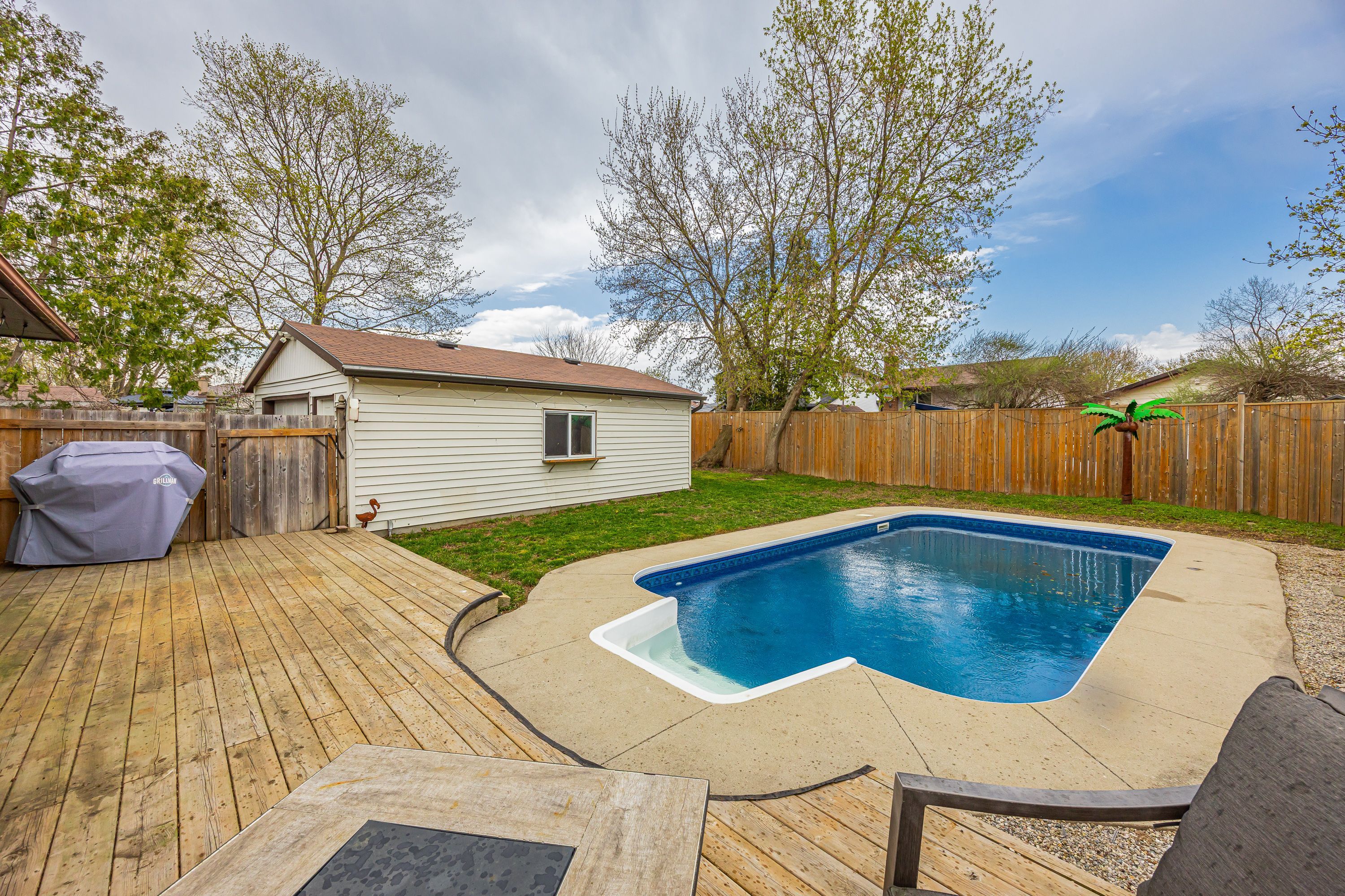 • Private backyard with patio, deck, and inviting in-ground pool.
