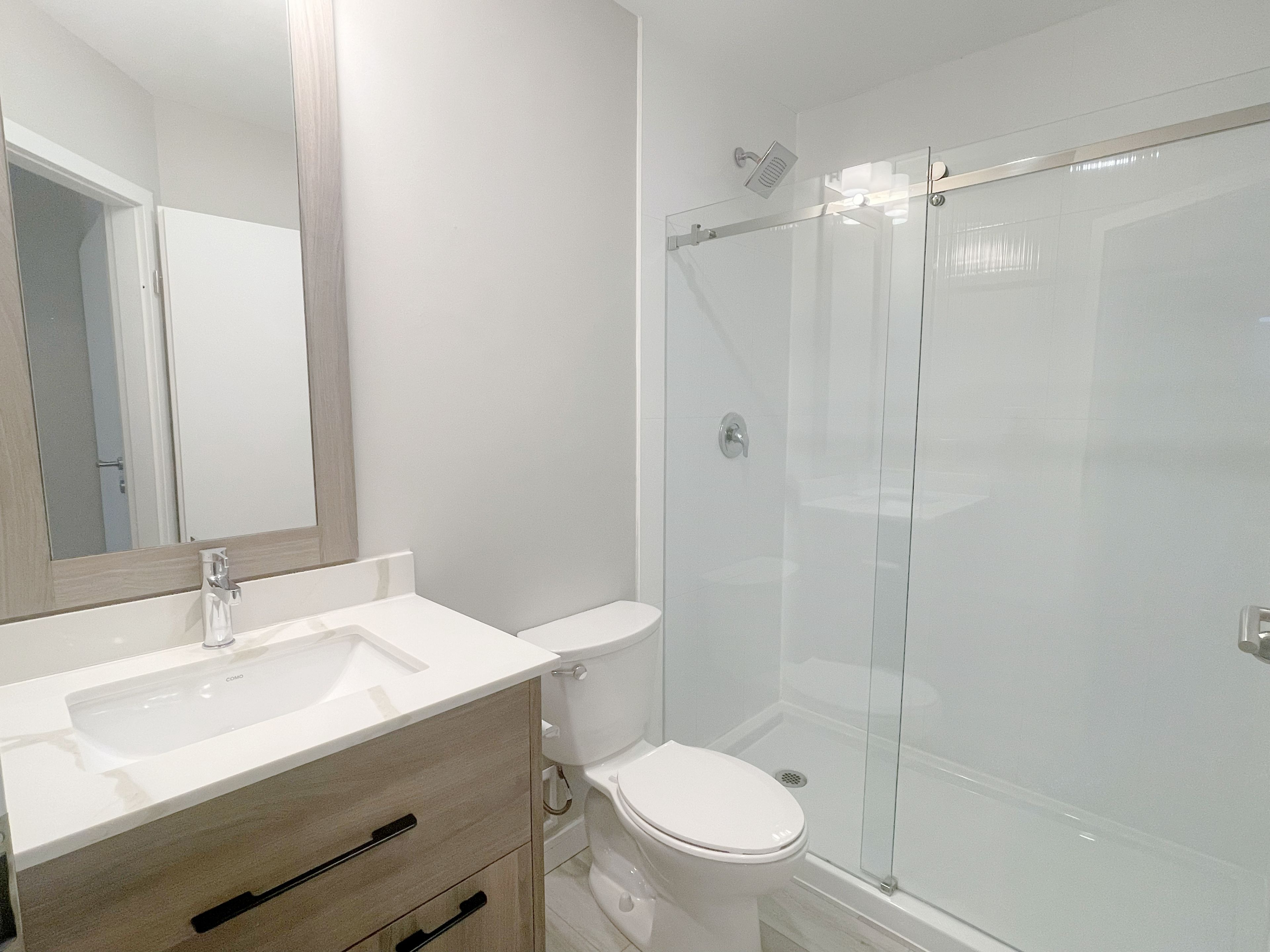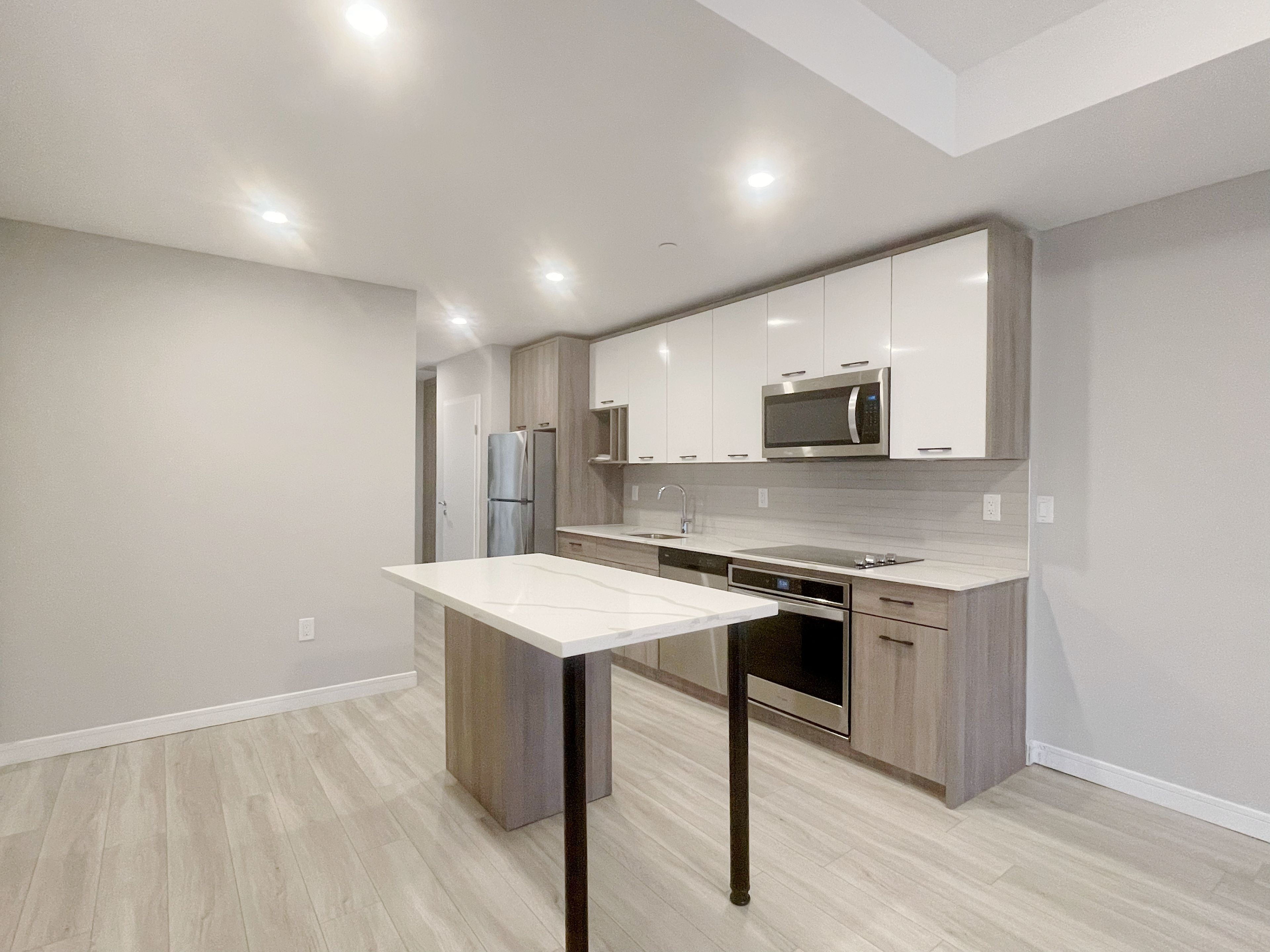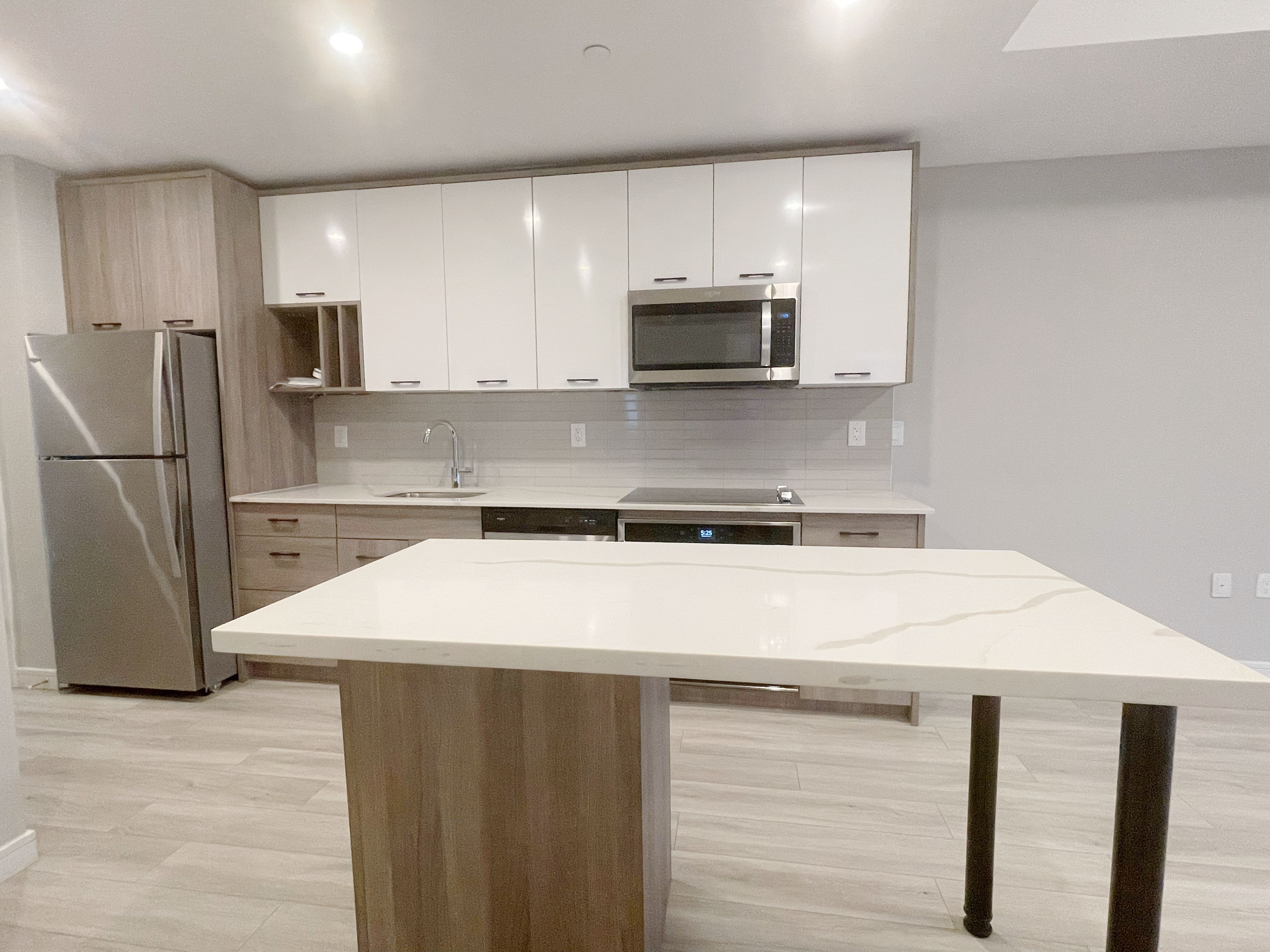 • Modern kitchen with quartz countertops and stainless-steel appliances.