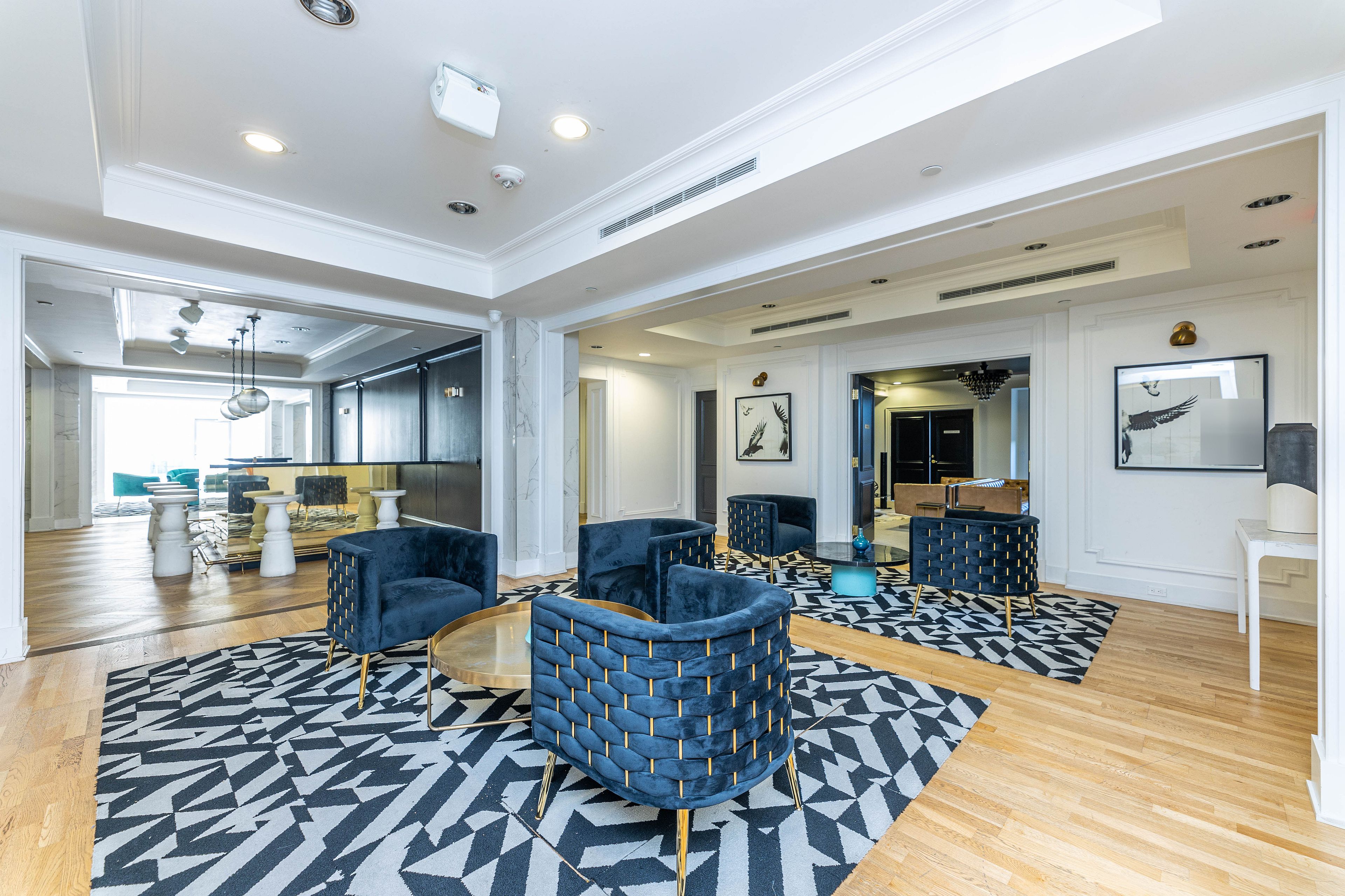 • Open-concept layout with 9-foot ceilings and floor-to-ceiling windows.