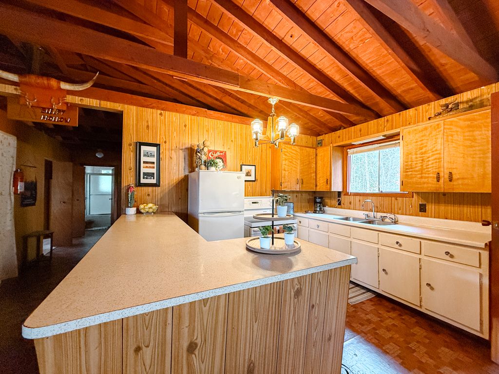 • Open concept kitchen and family room with a cozy stone fireplace.