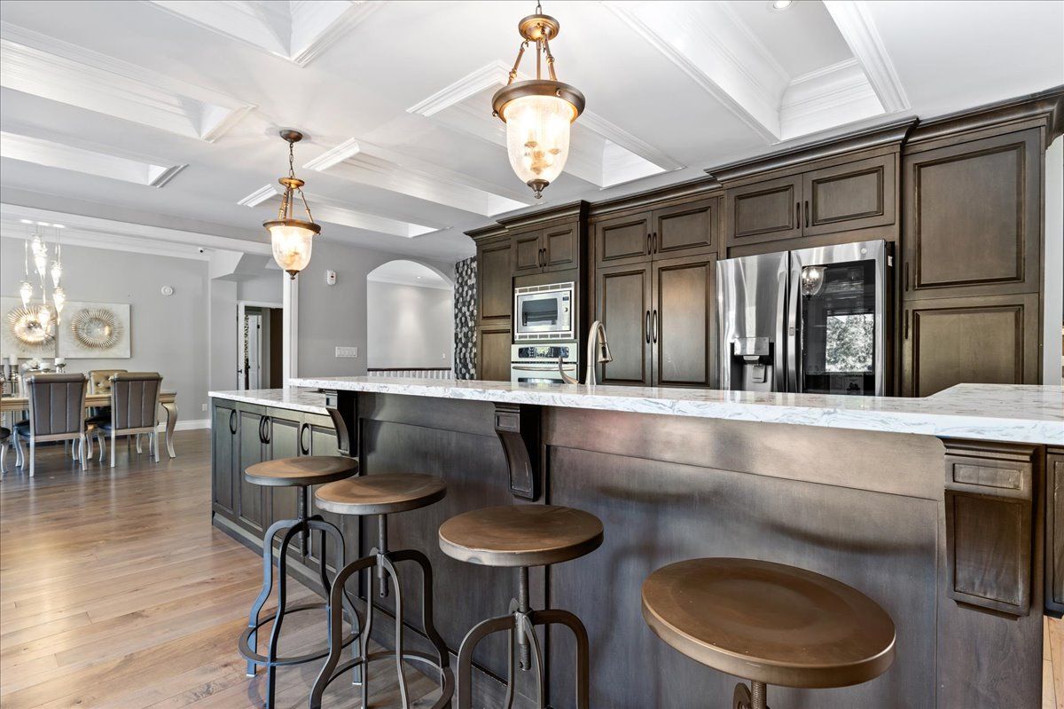 • Elegant maple kitchen with an oversized quartz countertop and gas cooktop.