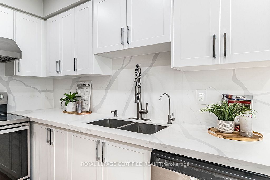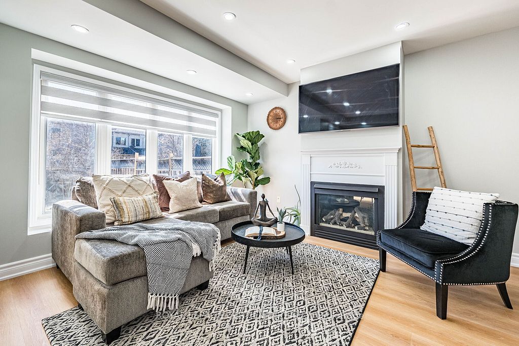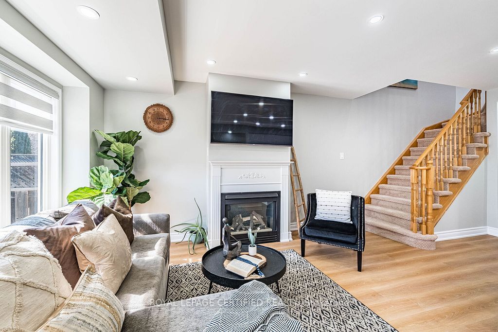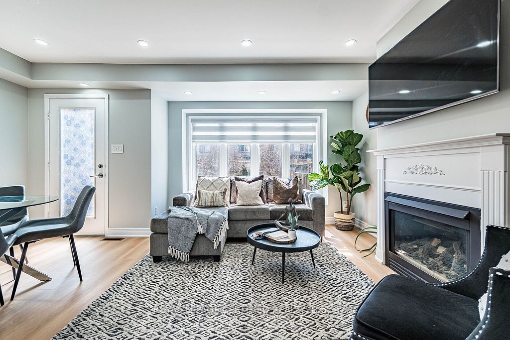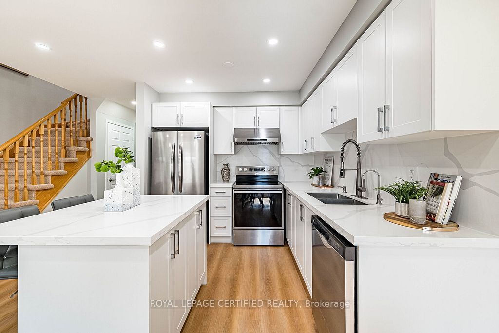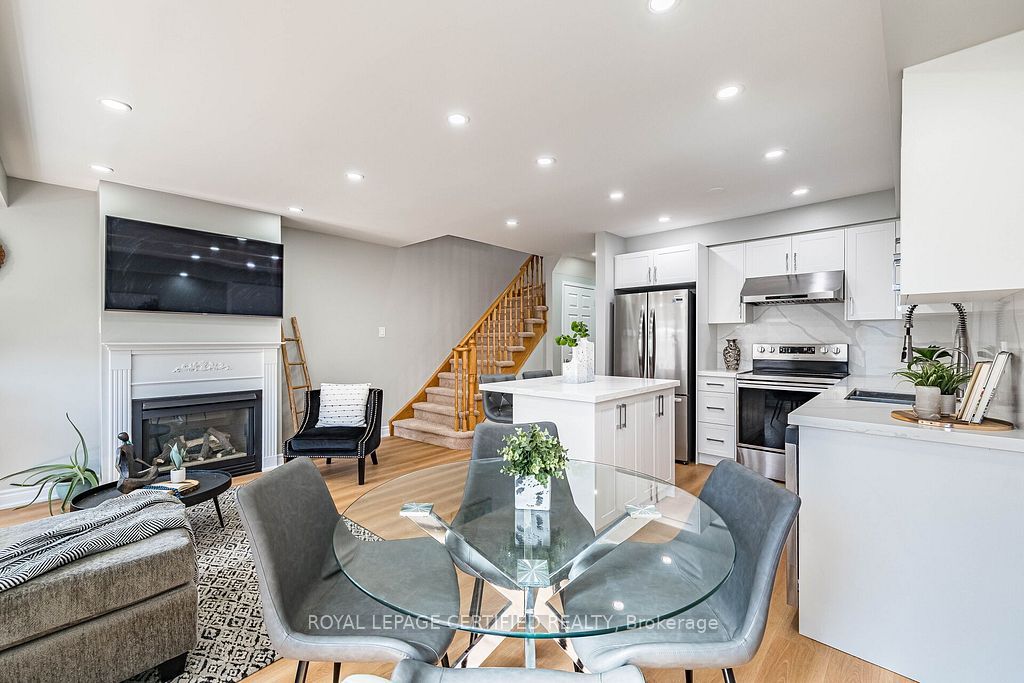 Welcome to this beautifully maintained freehold townhome (no condo or potl fees) in georgetown's sought-after dominion gardens-offering stylish, move-in-ready living with extensive recent upgrades throughout. The open-concept main foor features new flooring (2026), a cozy natural gas fireplace, and a fully renovated kitchen(2026) with modern cabinetry, quartz countertops & backsplash, and new stainless steel appliances. Pot lights on all three levels provide a bright, modern ambiance throughout the home. Upstairs, the spacious primary bedroom offers semi-ensuite access to an updated main bathroom, complemented by two additional well-sized bedrooms, including one with a walkout to affront balcony. Custom zebra blinds add a sleek, contemporary finish. The finished basement adds valuable living space-ideal for a family room, home office, or gym + additional storage space. Enjoy a fully fences backyard with mature landscaping, plus a private driveway for two cars plus single-car garage with no side walk. Extensive upgrades include: ac (2024), furnace (2025), renovated kitchen & appliances fridge (2026),dishwasher (2026), main floor flooring (2026), staircase carpet (2026), clothes washer (2026), water softener & reverse osmosis system (2024)owned, and pot lights throughout all three levels. Located within walking distance to parks, splash pad, trails, shopping, restaurants, outlet mall, and go train. Close to excellent schools in a family-friendly neighbourhood-an exceptional opportunity to own a turnkey freehold home. Freehold townhome - no condo fees. Fully renovated kitchen (2026)+ cabinets+quartz countertop & backsplash + island. Pot lights on all 3 levels. New flooring main (2026) + stair carpet(2026). Finished basement (family room/ofce/gym). Ac(2024) & furnace(2025). Water softener +reverse osmosis(2024). Private driveway(2 cars) + garage. No sidewalk. Fully fences backyard with mature trees. Walking distance to go train, parks, trails, shopping & schools.