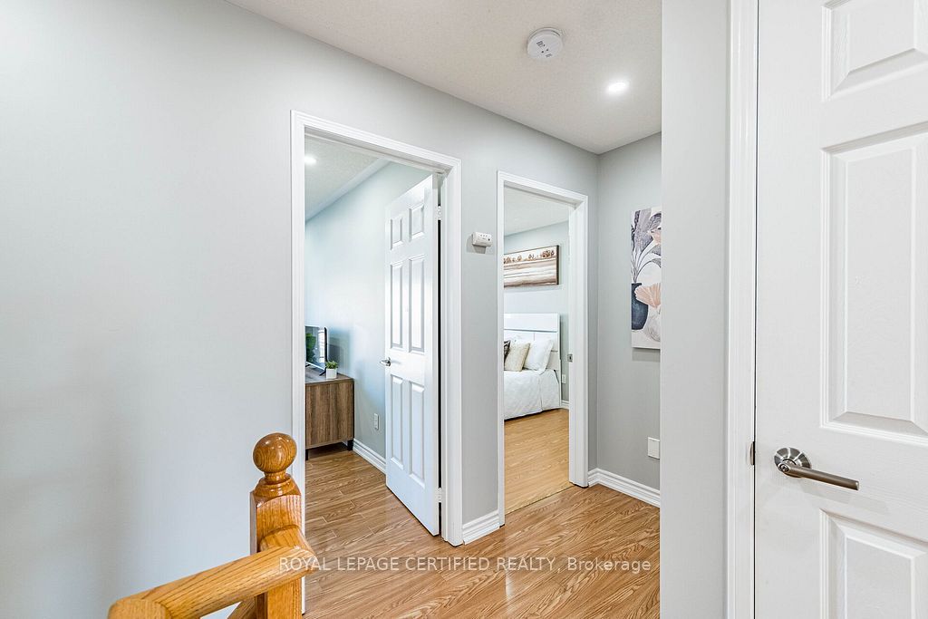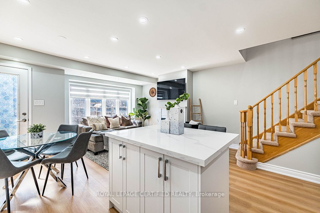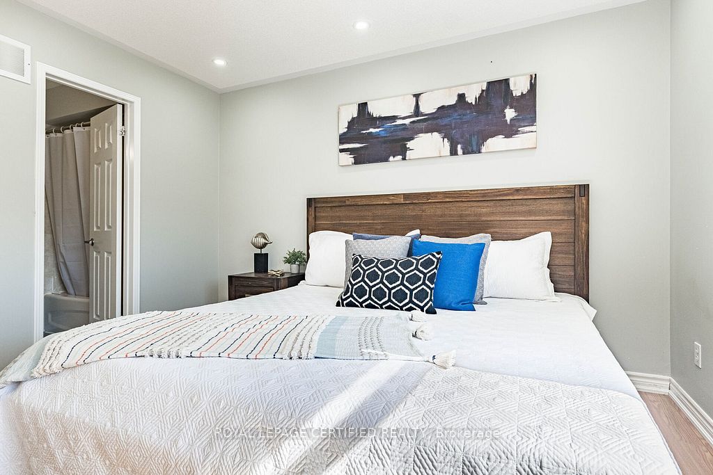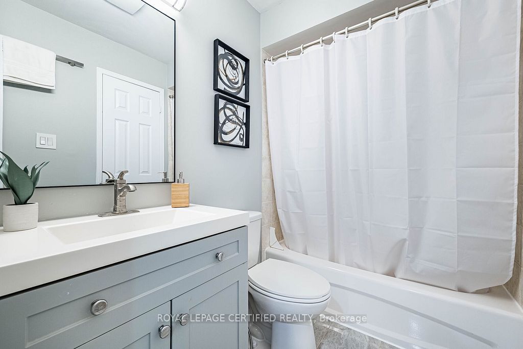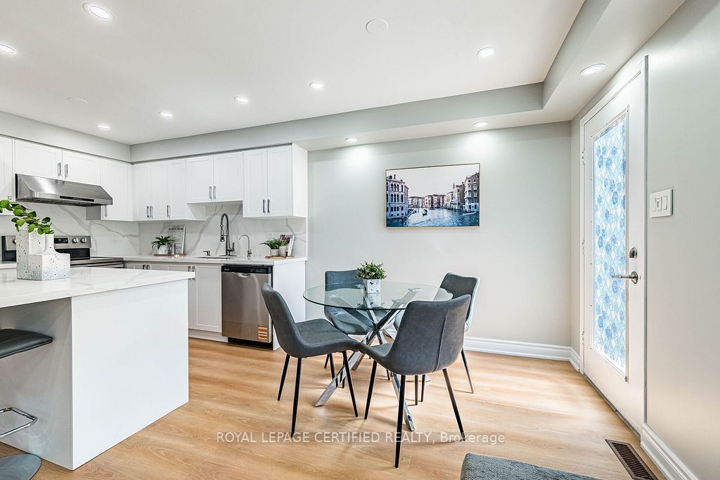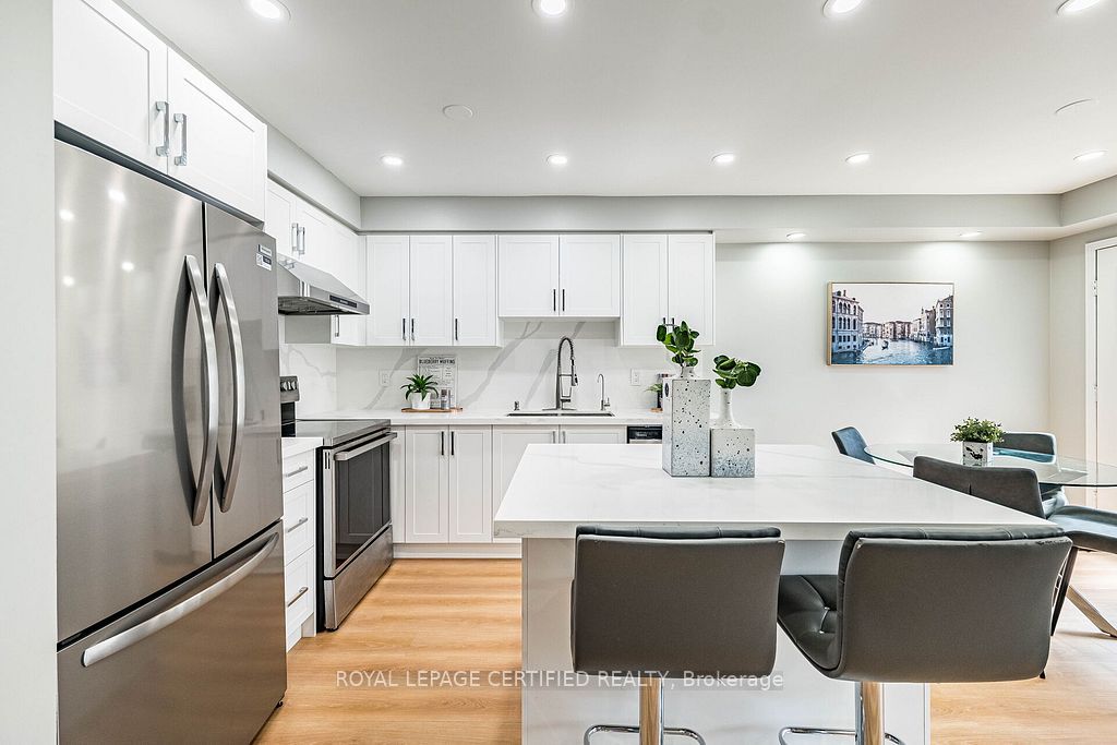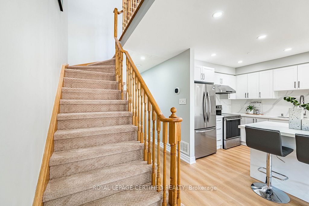 Welcome to this beautifully maintained freehold townhome (no condo or potl fees) in georgetown's sought-after dominion gardens-offering stylish, move-in-ready living with extensive recent upgrades throughout. The open-concept main foor features new flooring (2026), a cozy natural gas fireplace, and a fully renovated kitchen(2026) with modern cabinetry, quartz countertops & backsplash, and new stainless steel appliances. Pot lights on all three levels provide a bright, modern ambiance throughout the home. Upstairs, the spacious primary bedroom offers semi-ensuite access to an updated main bathroom, complemented by two additional well-sized bedrooms, including one with a walkout to affront balcony. Custom zebra blinds add a sleek, contemporary finish. The finished basement adds valuable living space-ideal for a family room, home office, or gym + additional storage space. Enjoy a fully fences backyard with mature landscaping, plus a private driveway for two cars plus single-car garage with no side walk. Extensive upgrades include: ac (2024), furnace (2025), renovated kitchen & appliances fridge (2026),dishwasher (2026), main floor flooring (2026), staircase carpet (2026), clothes washer (2026), water softener & reverse osmosis system (2024)owned, and pot lights throughout all three levels. Located within walking distance to parks, splash pad, trails, shopping, restaurants, outlet mall, and go train. Close to excellent schools in a family-friendly neighbourhood-an exceptional opportunity to own a turnkey freehold home. Freehold townhome - no condo fees. Fully renovated kitchen (2026)+ cabinets+quartz countertop & backsplash + island. Pot lights on all 3 levels. New flooring main (2026) + stair carpet(2026). Finished basement (family room/ofce/gym). Ac(2024) & furnace(2025). Water softener +reverse osmosis(2024). Private driveway(2 cars) + garage. No sidewalk. Fully fences backyard with mature trees. Walking distance to go train, parks, trails, shopping & schools.