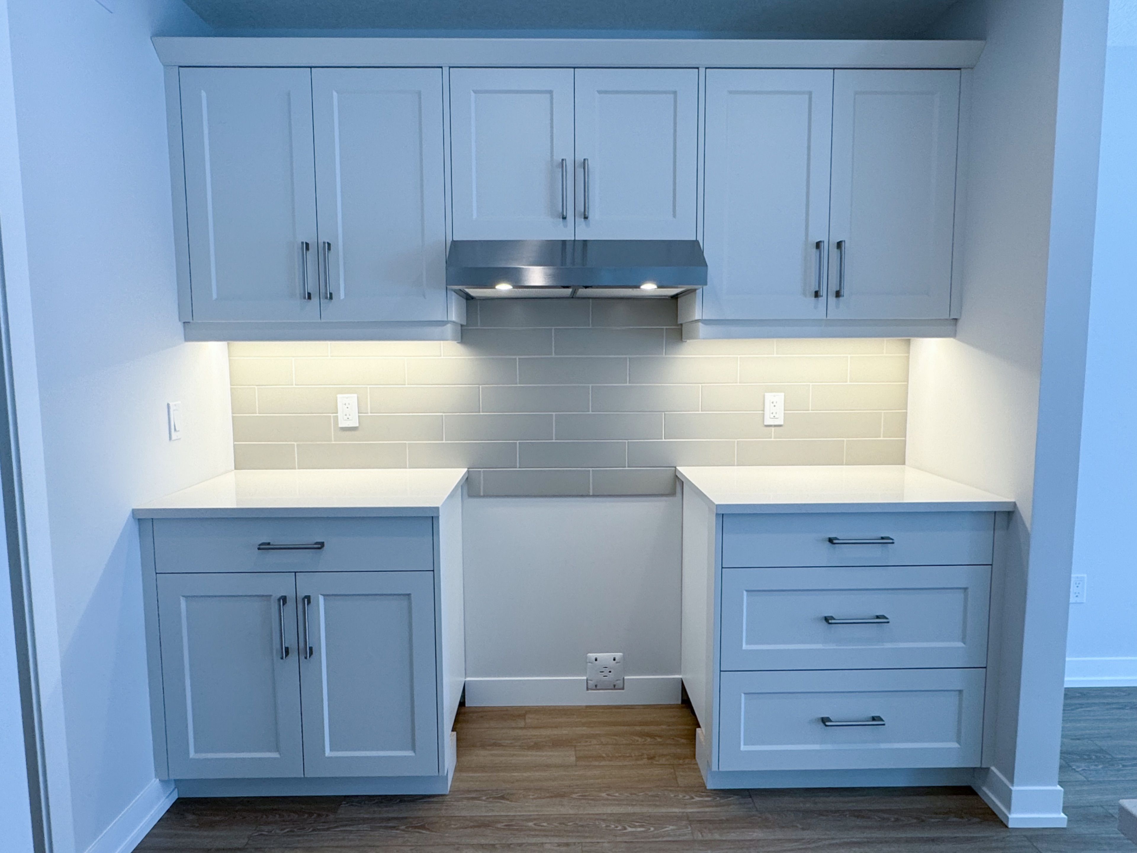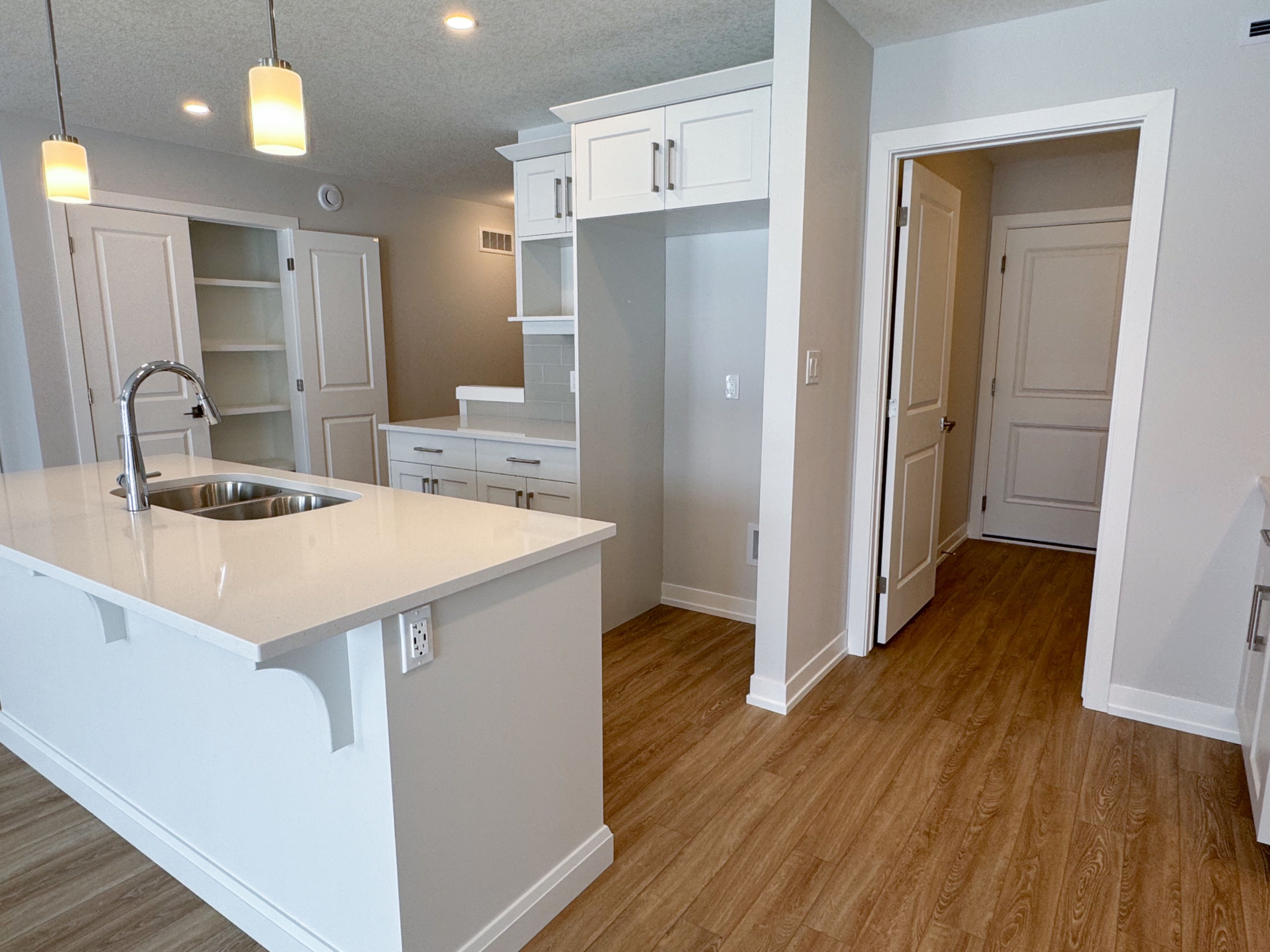 • Open-concept kitchen with a quartz island and large pantry.