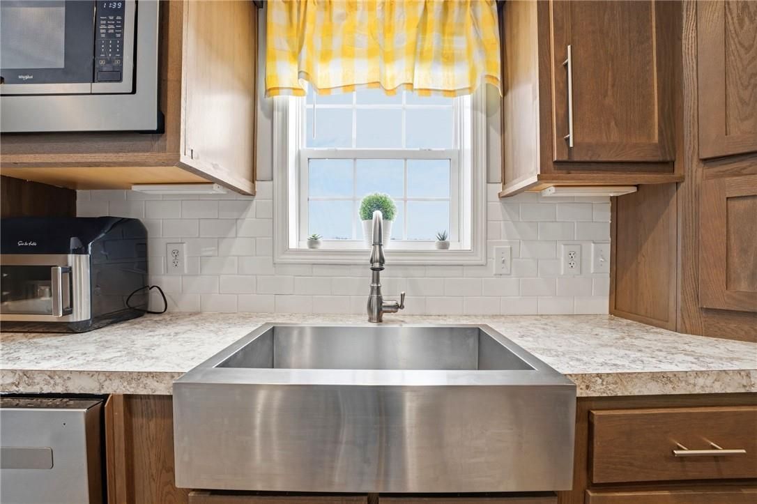 • Gourmet kitchen with island, pot filler, and garburator for convenience.