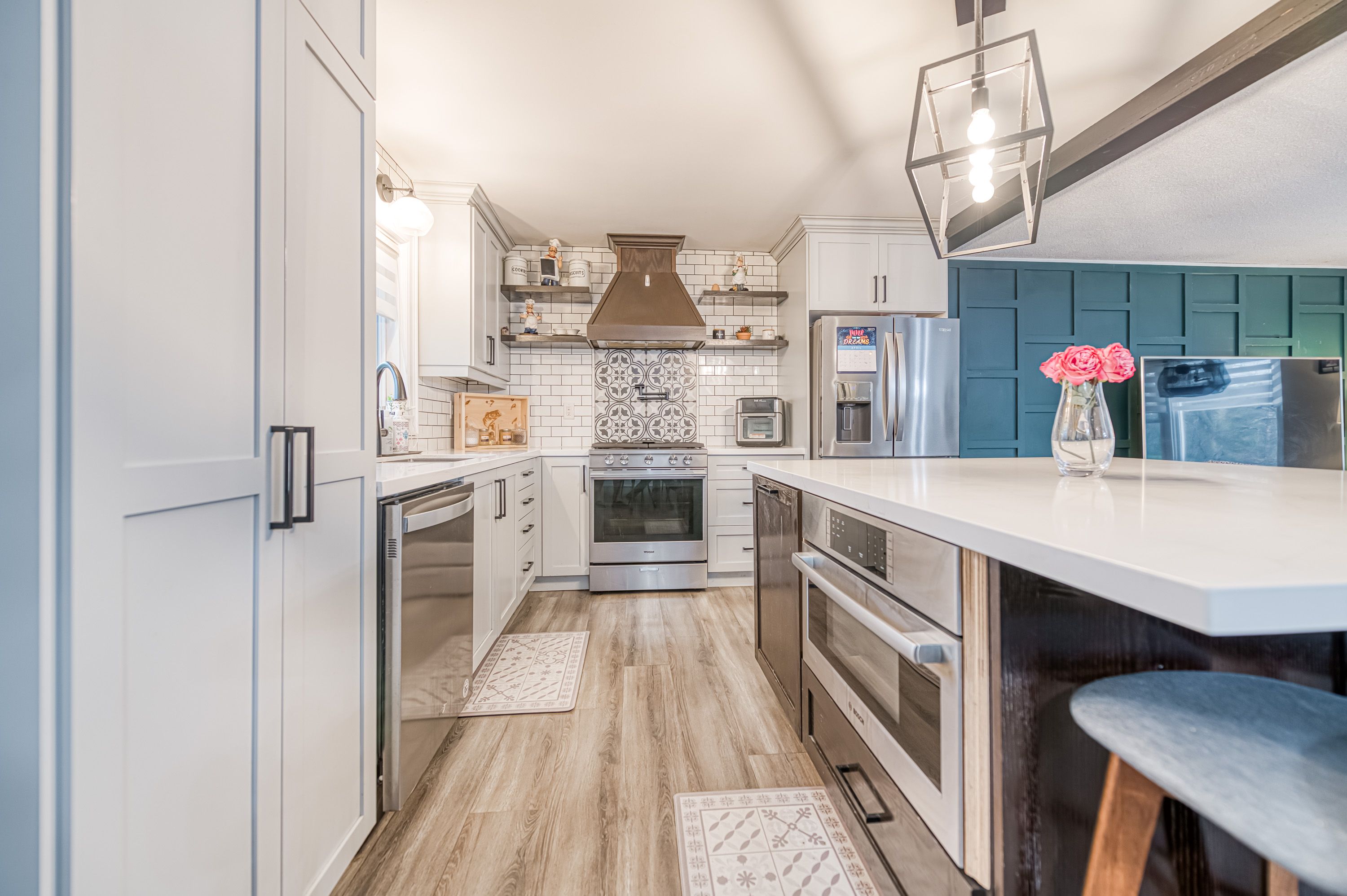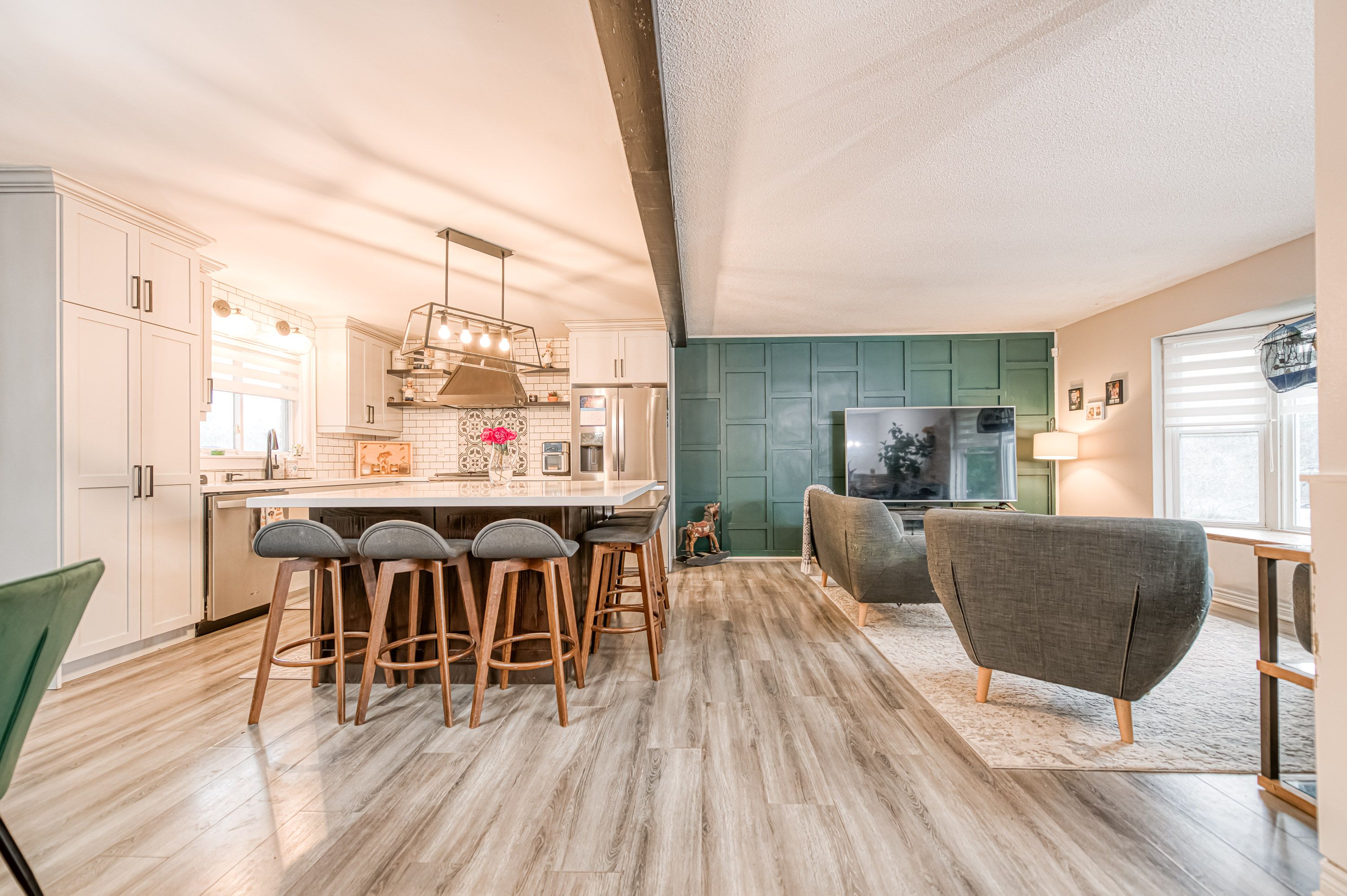 • Newly renovated kitchen with quartz countertops and a large island for entertaining.