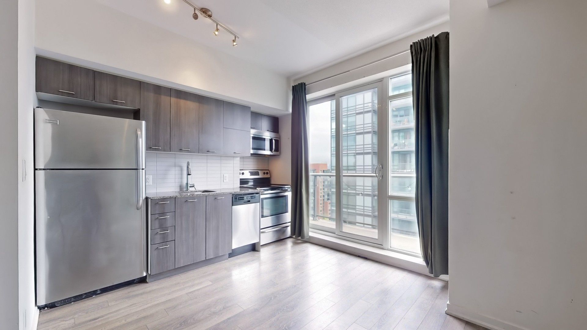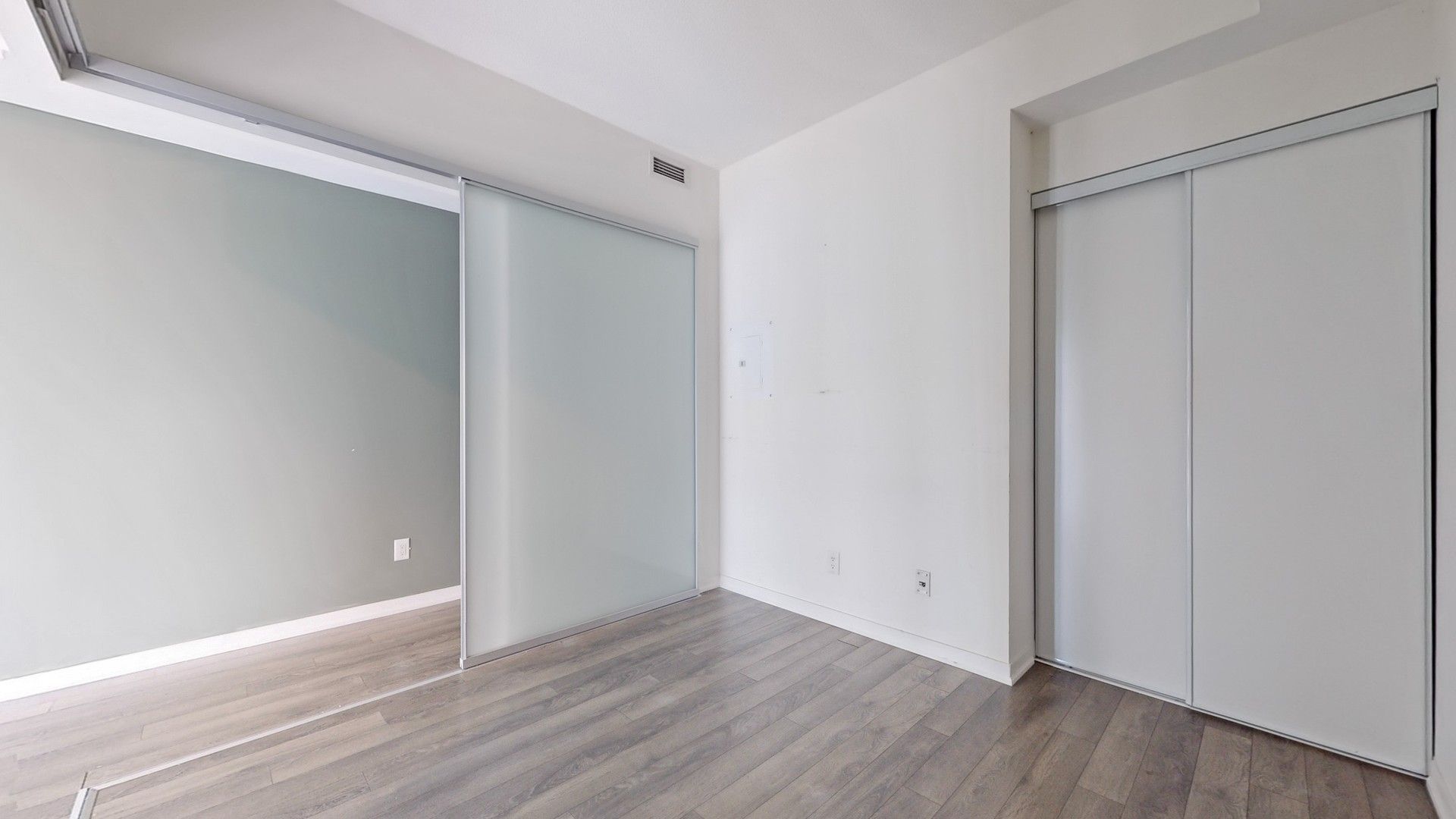 Penthouse 1 bedroom condo with stunning city and lake views. Laminate flooring throughout, frosted sliding glass doors to bedroom. This 415 sq foot unit is priced very well for king west village. The penthouse has 9ft ceilings (only floor with 9ft ceilings).