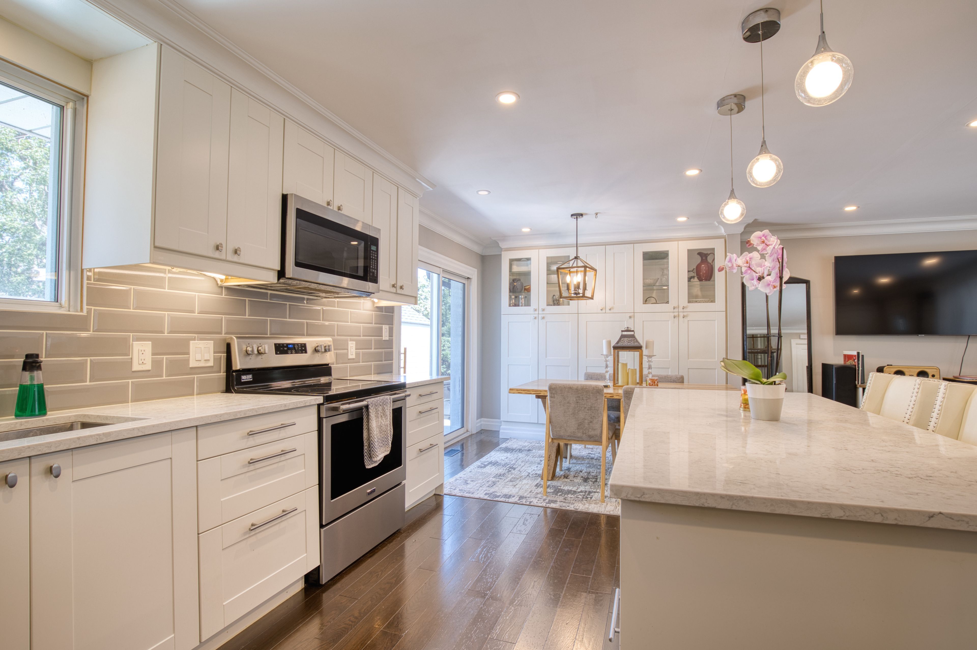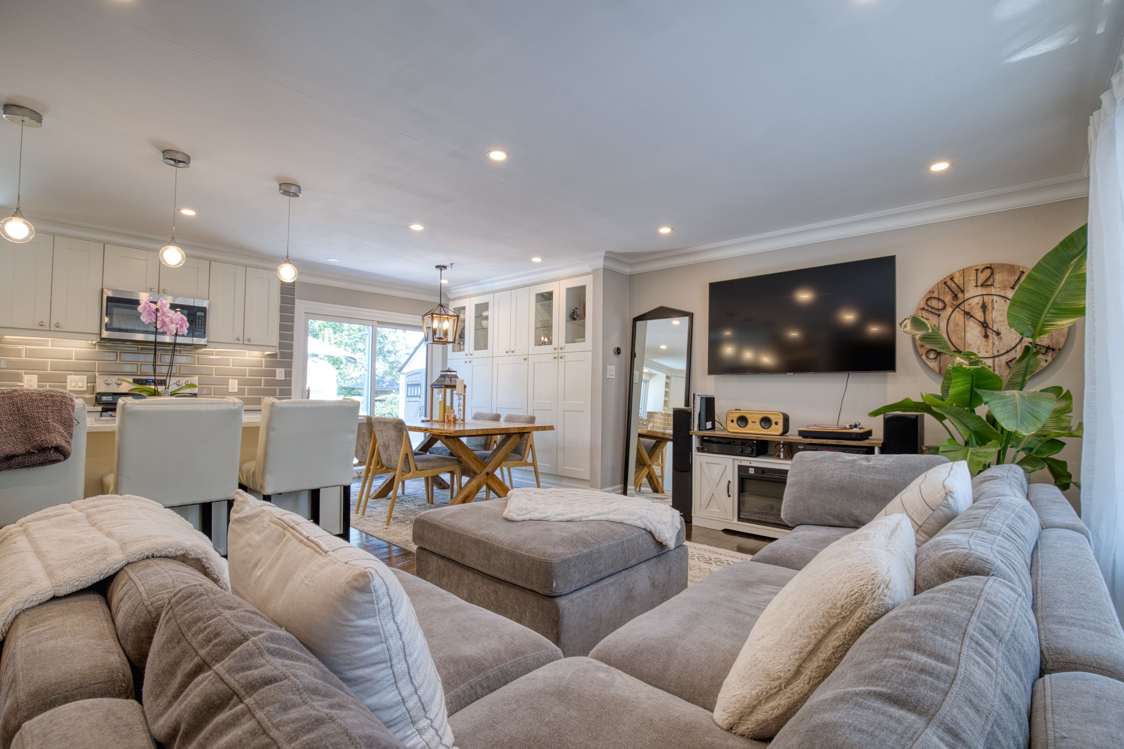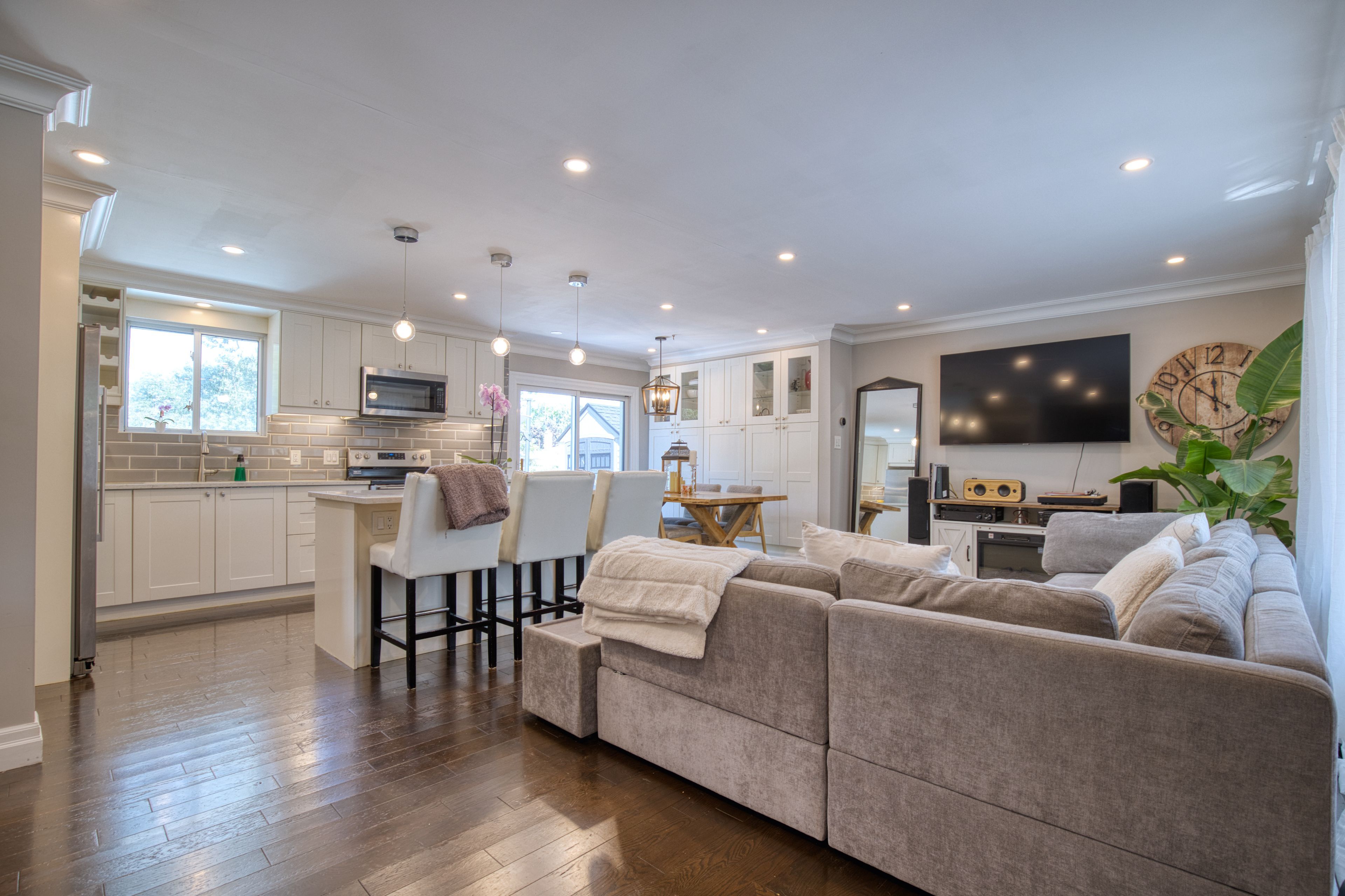 • Updated open-concept kitchen with quartz countertops and breakfast bar.