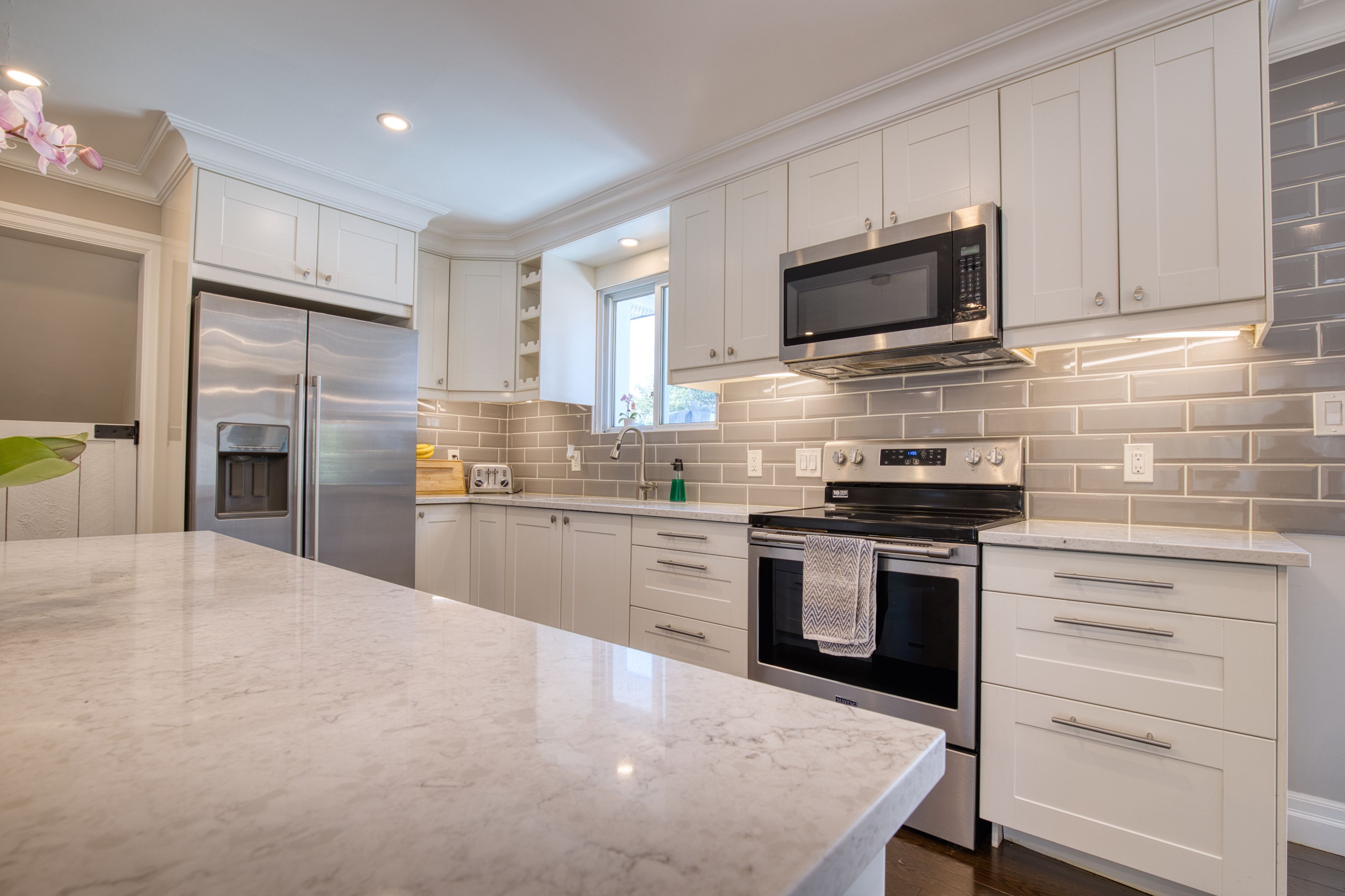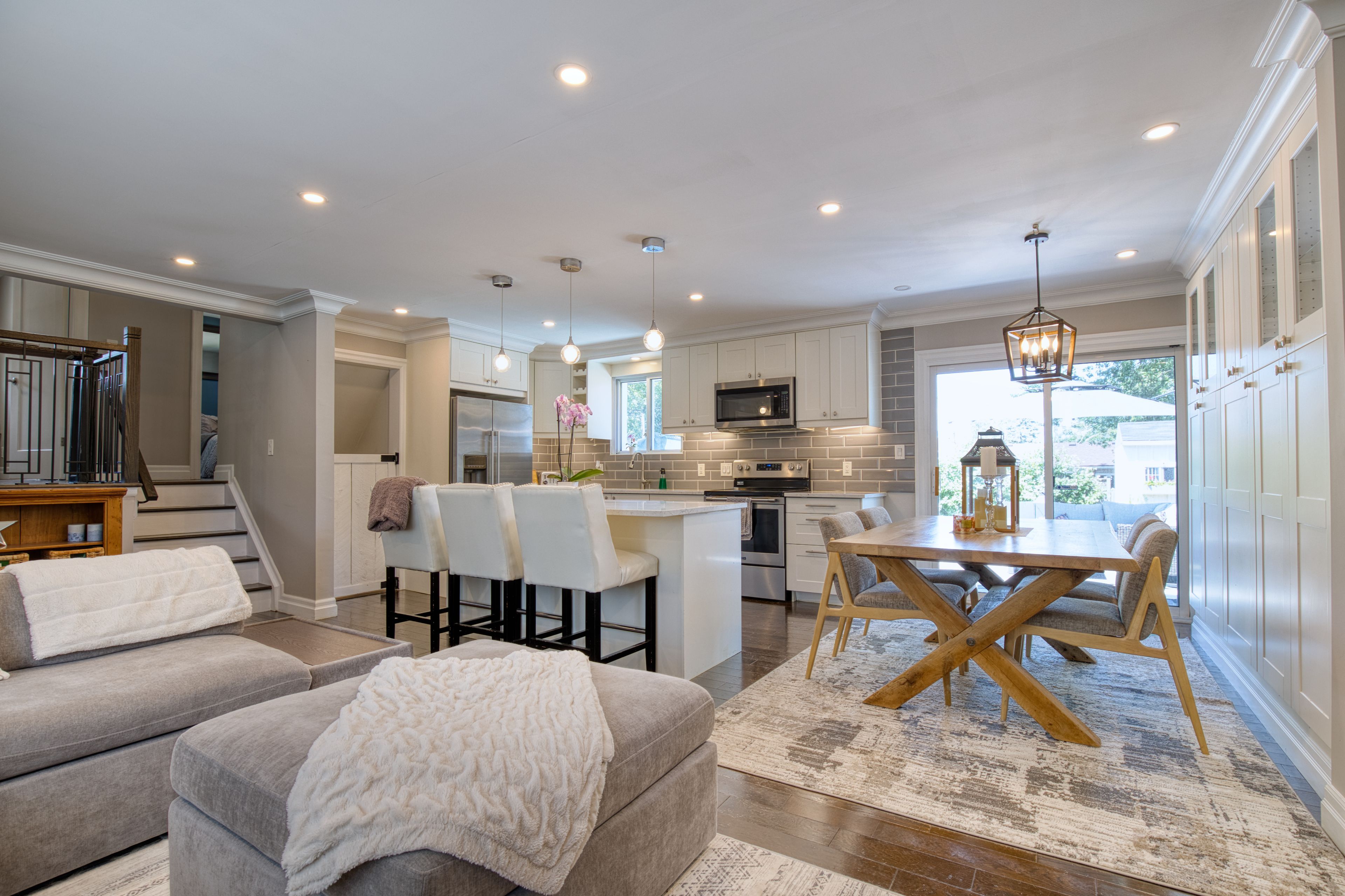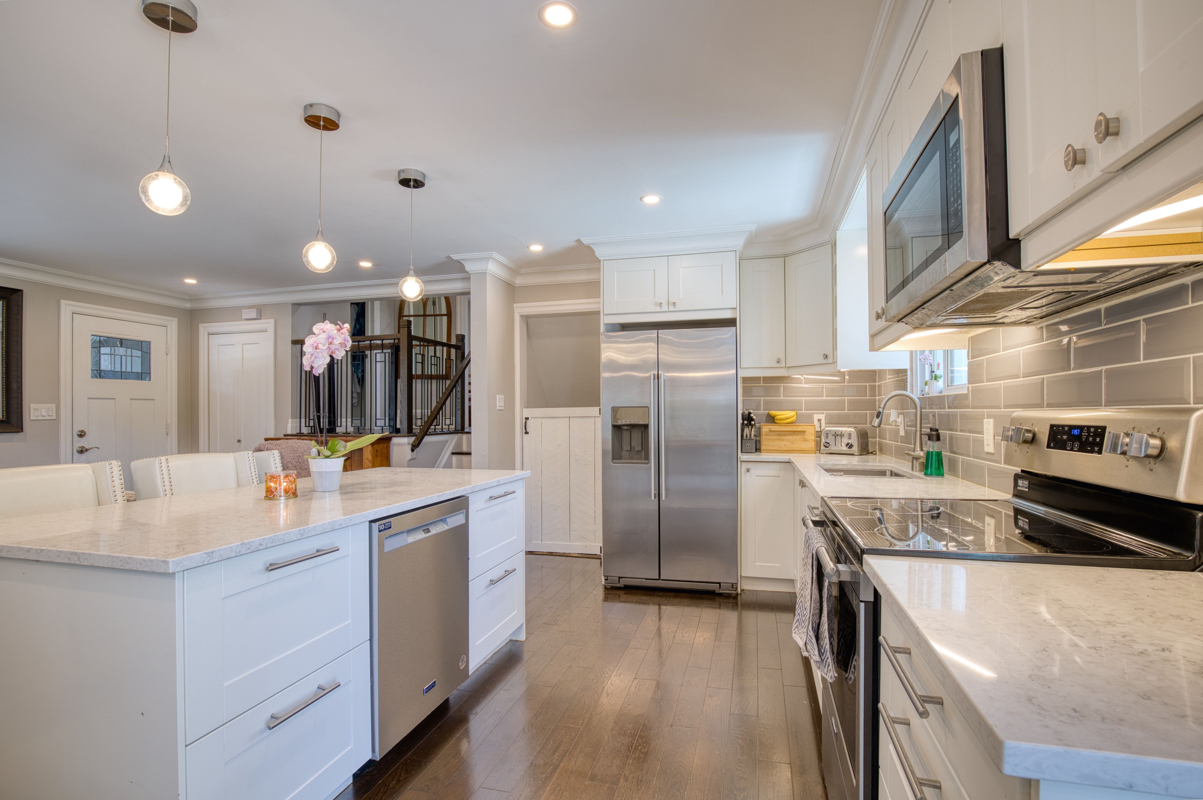 • Updated open-concept kitchen with quartz countertops and breakfast bar.
