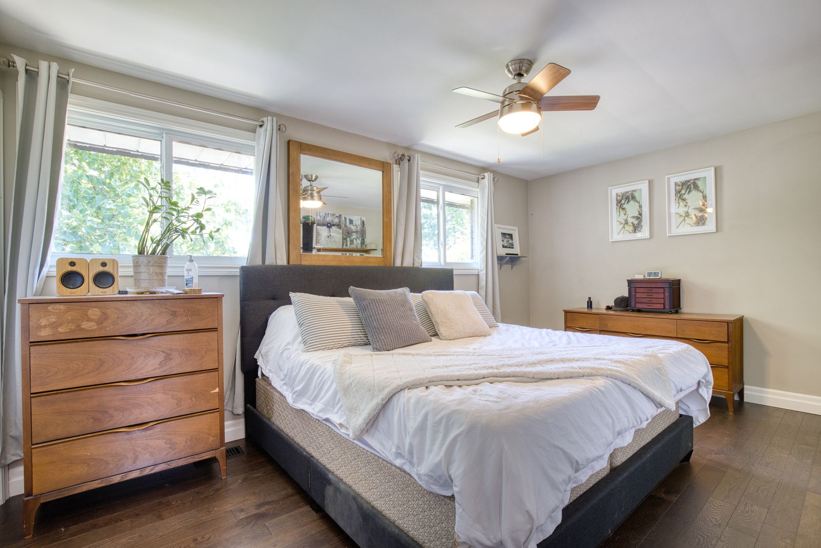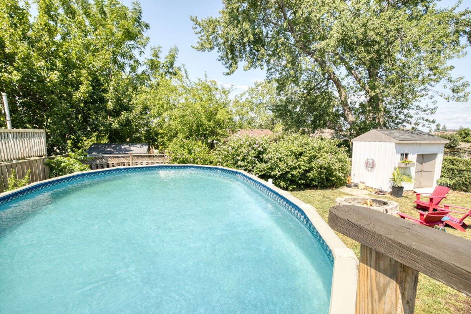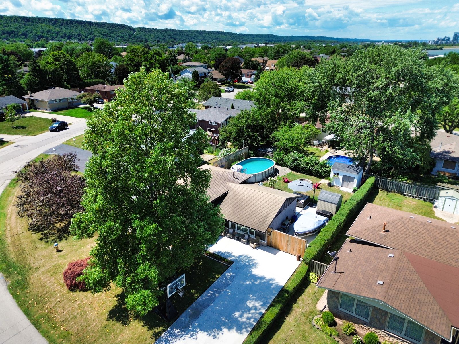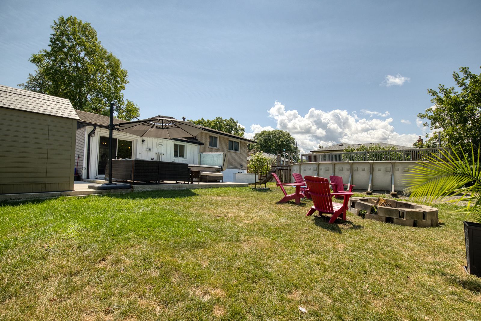 A brand new roof installed in december 2025, complete with a 25-year transferable warranty on both materials and workmanship, gives buyers outstanding peace of mind. Walking distance to the lake, this fully finished 3 bedroom, 2 bath, 3 level side split has been extensively updated and is truly move-in ready. Sitting on a 60 x 112 ft landscaped lot in one of the area's most sought-after lakeside neighbourhoods, it offers the perfect blend of modern style and family-focused comfort. The open-concept main floor showcases a newly renovated eat-in kitchen with quartz countertops, a centre island with breakfast bar, and custom cabinetry. Garden doors from the dining area extend your living space outdoors to a private patio, ideal for seamless indoor/outdoor entertaining. Rich 3/4" oak hardwood flooring carries through the main and upper levels, leading to three generous bedrooms and a beautifully upgraded 4-piece bathroom. The lower level provides exceptional versatility with a cozy family room featuring a wood burning fireplace, an updated 3-piece bath, a rec room, laundry area, and a separate side entrance. A large crawl space ensures plenty of storage. Outside, the fully fenced backyard creates a true at home retreat with a hot tub and above ground pool, ready for summer enjoyment and weekend relaxation. Recent updates include: roof (2025), concrete driveway & patio (2024), siding/eaves/downspouts (2024), tankless water heater (2019), dishwasher (2024), hot tub & pool (2020), and sand filter (2025). A standout turnkey opportunity in an established lakeside community.