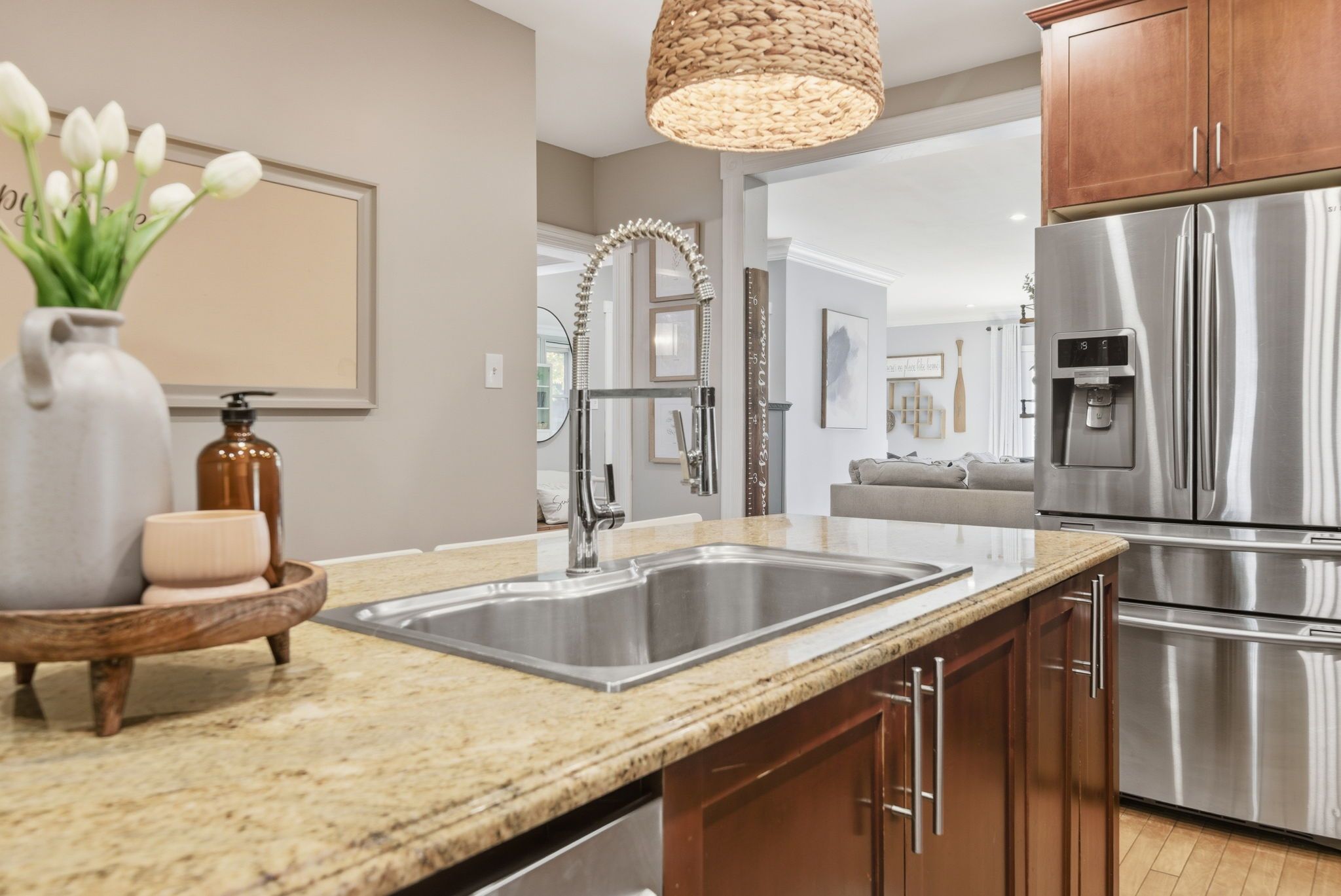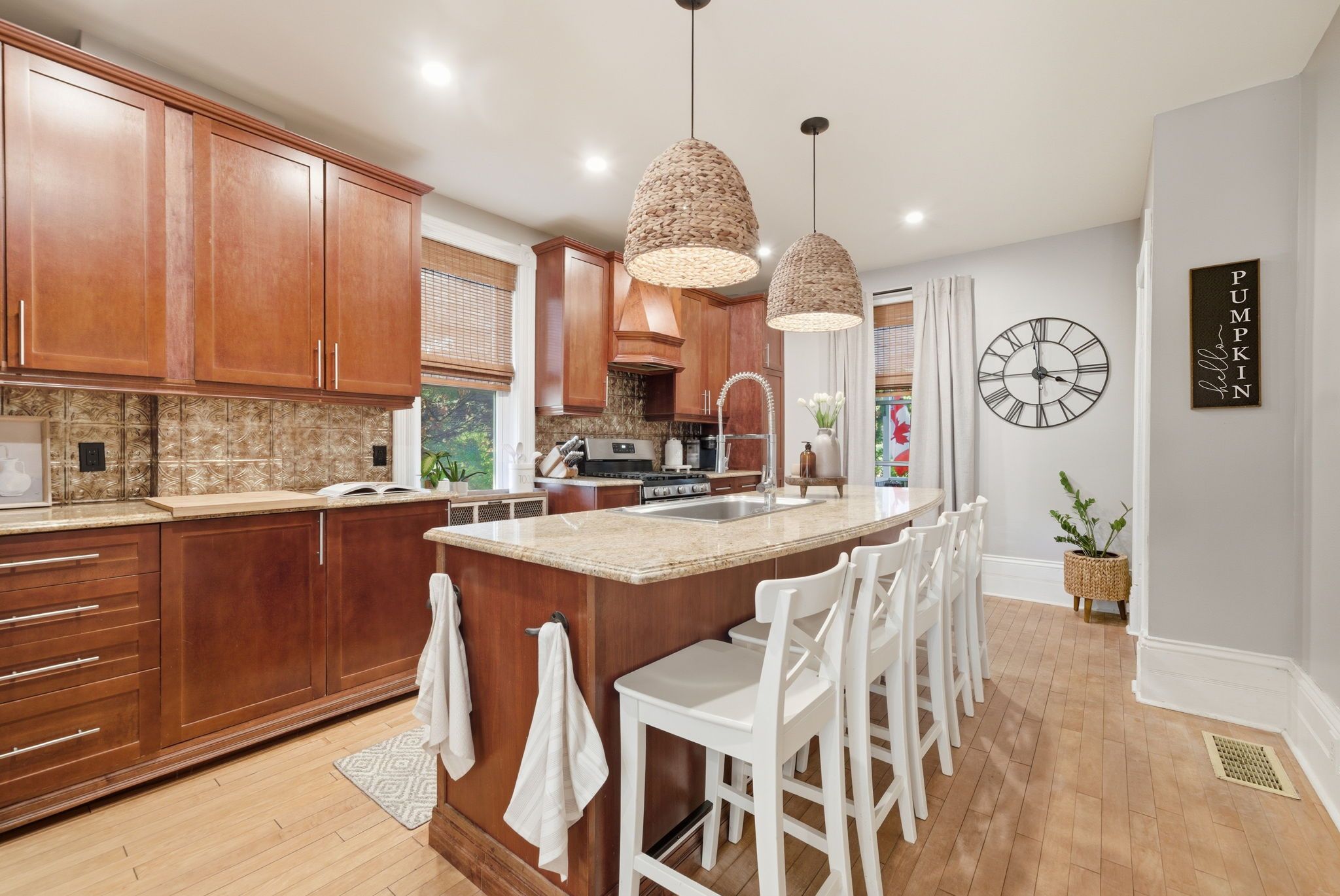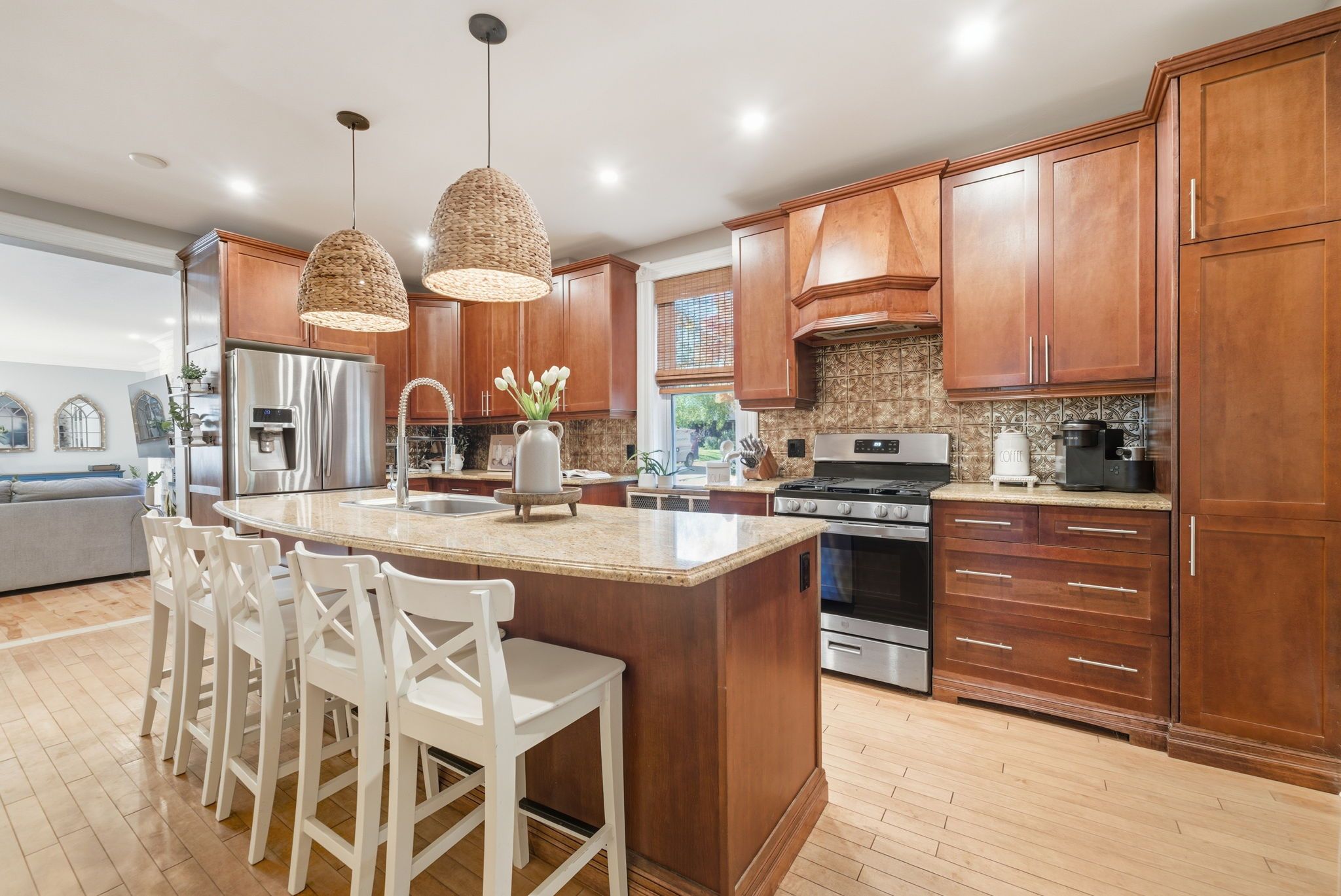 • Spacious country kitchen features granite counters and a large island.