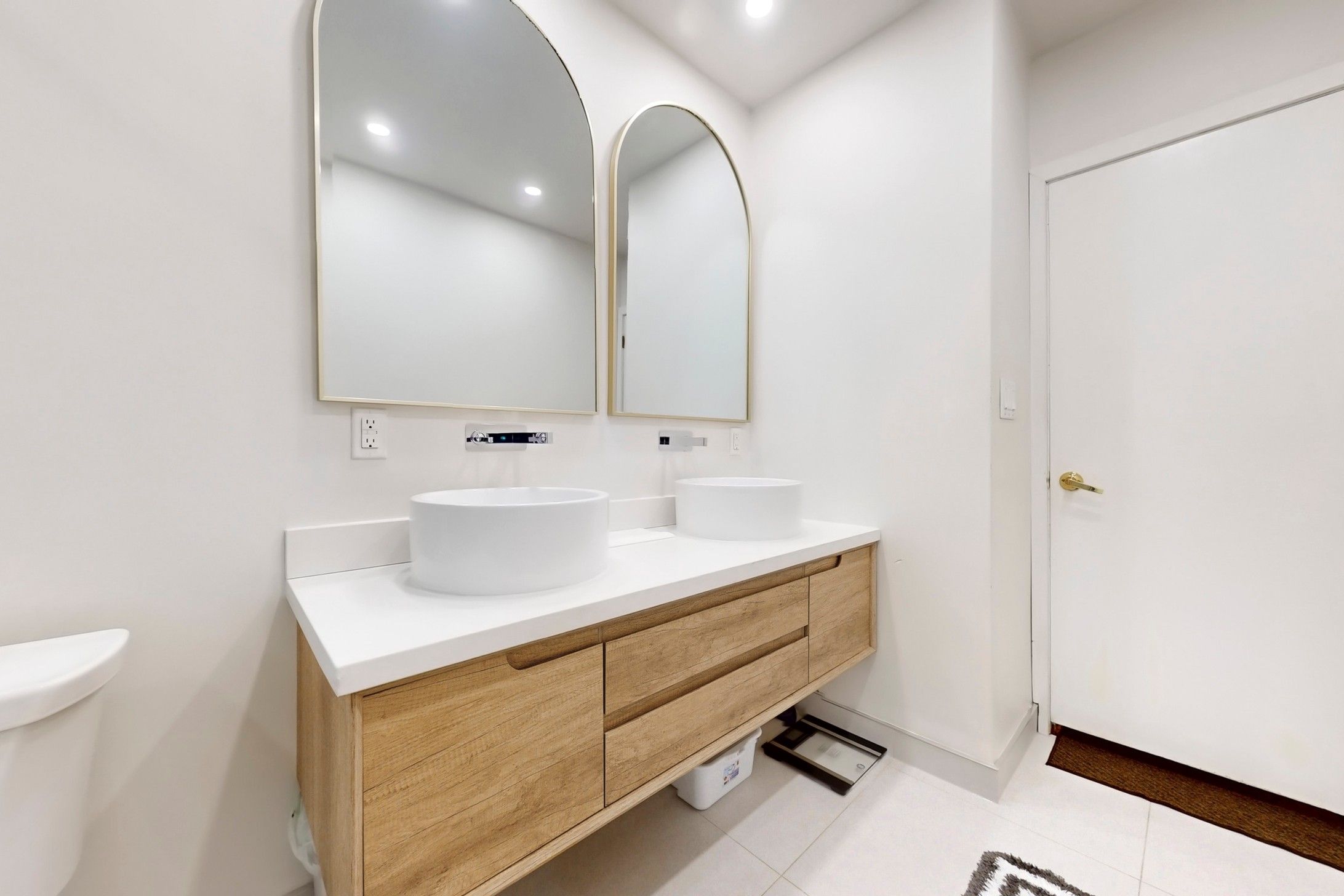 • Custom shared bathroom with double vanity and stylish fixtures.