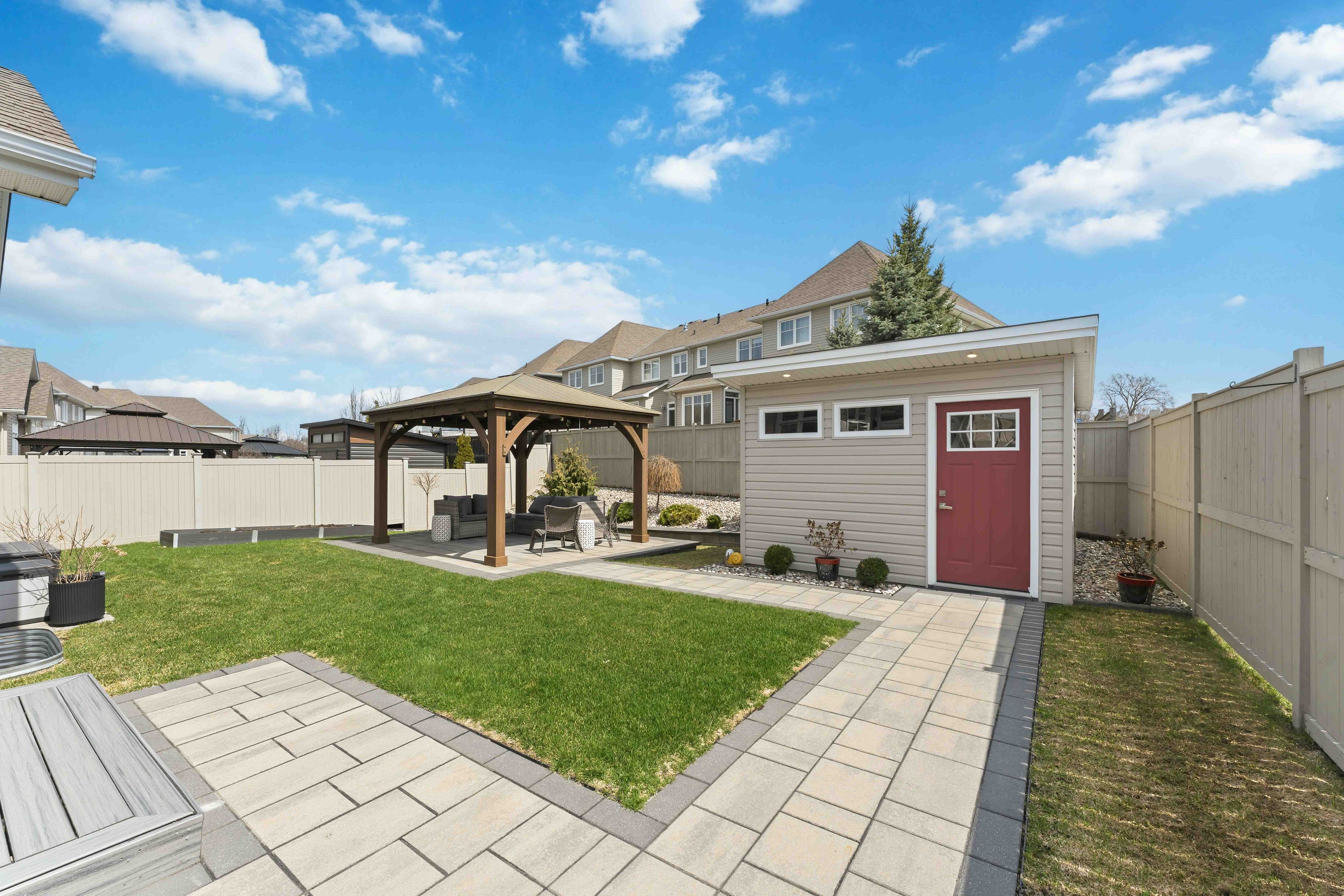 • Private fenced backyard with deck, gazebo, and garden shed for outdoor enjoyment.