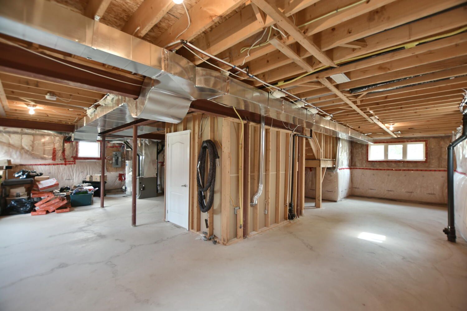 • Unfinished basement with large windows, offering potential for extra space.