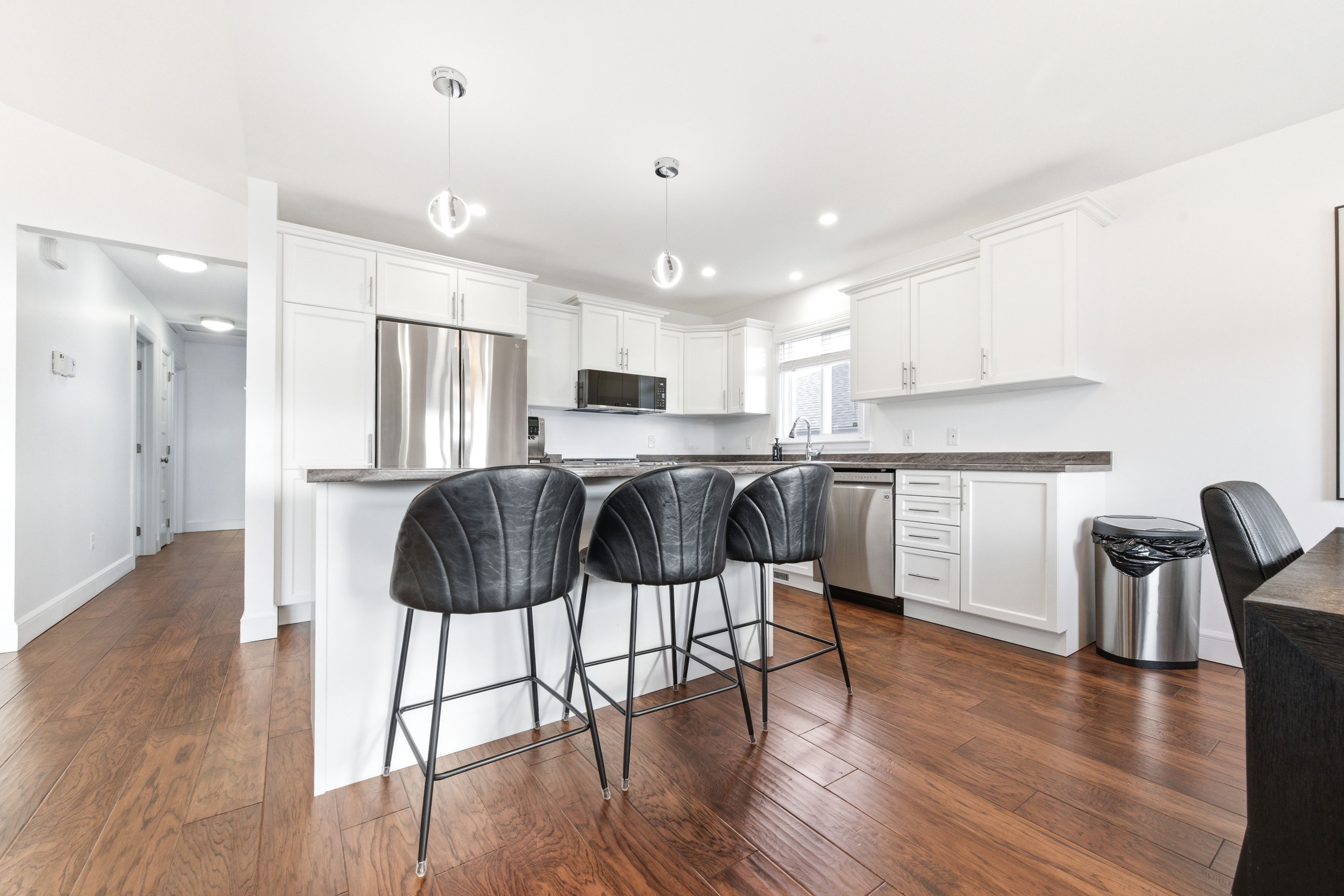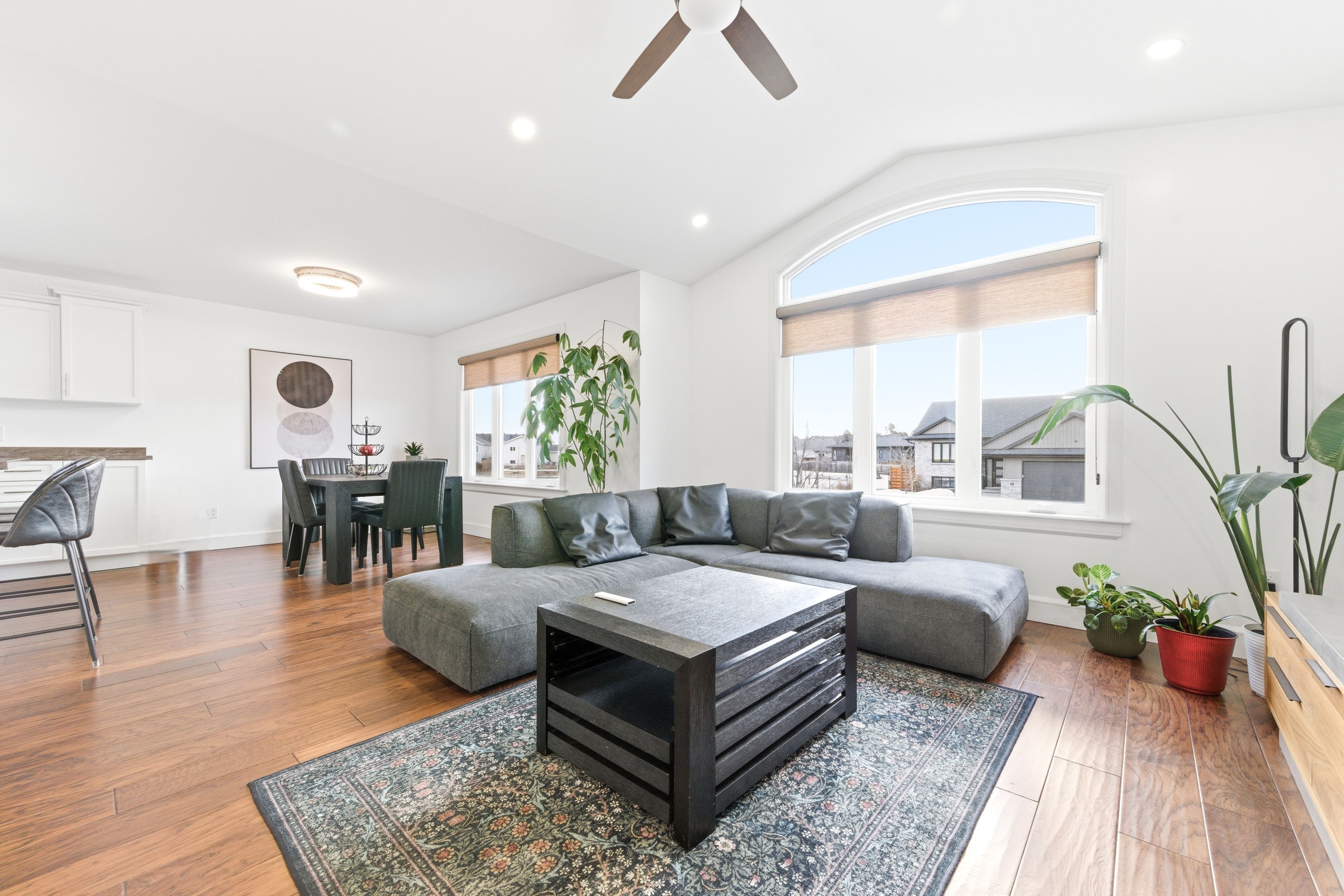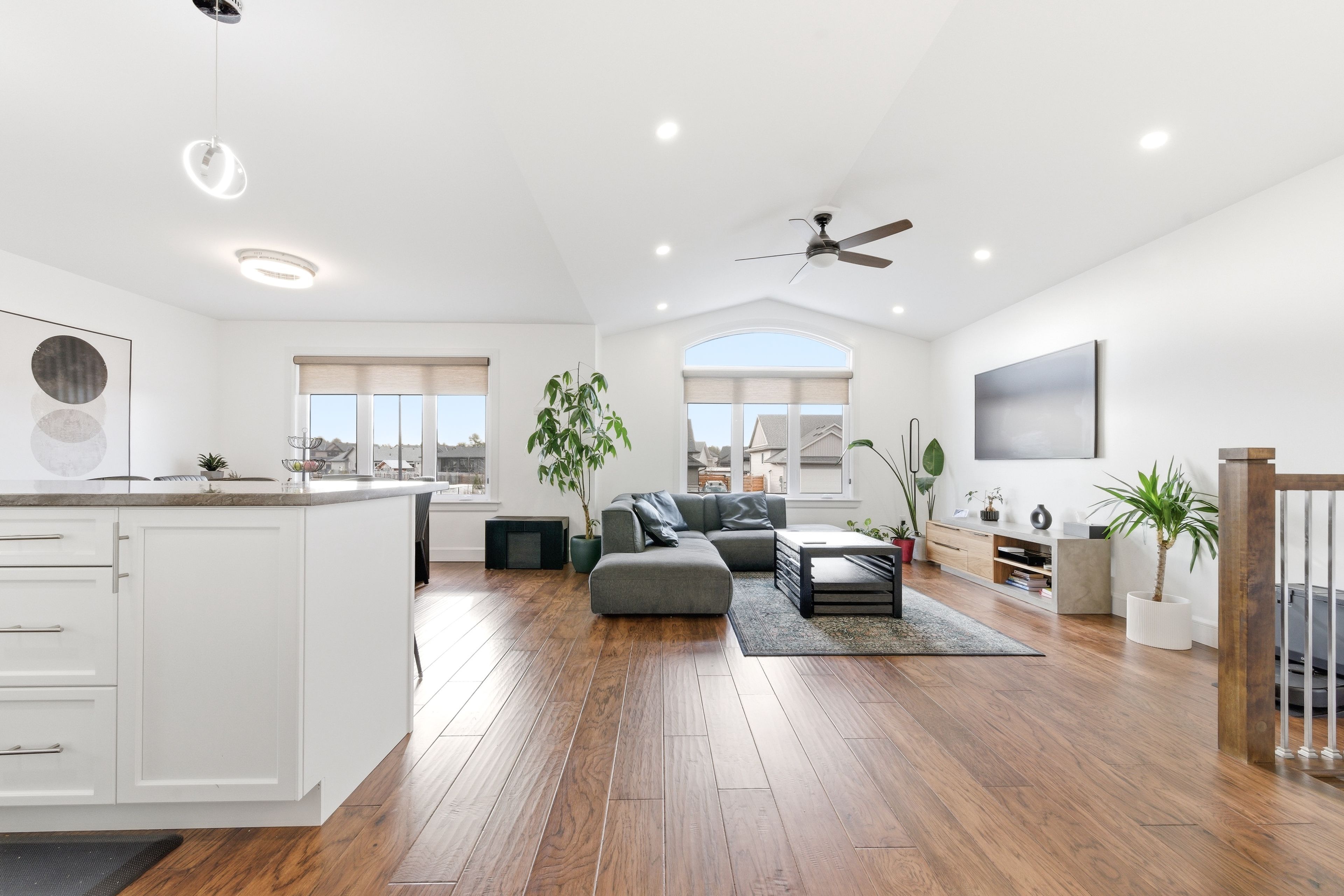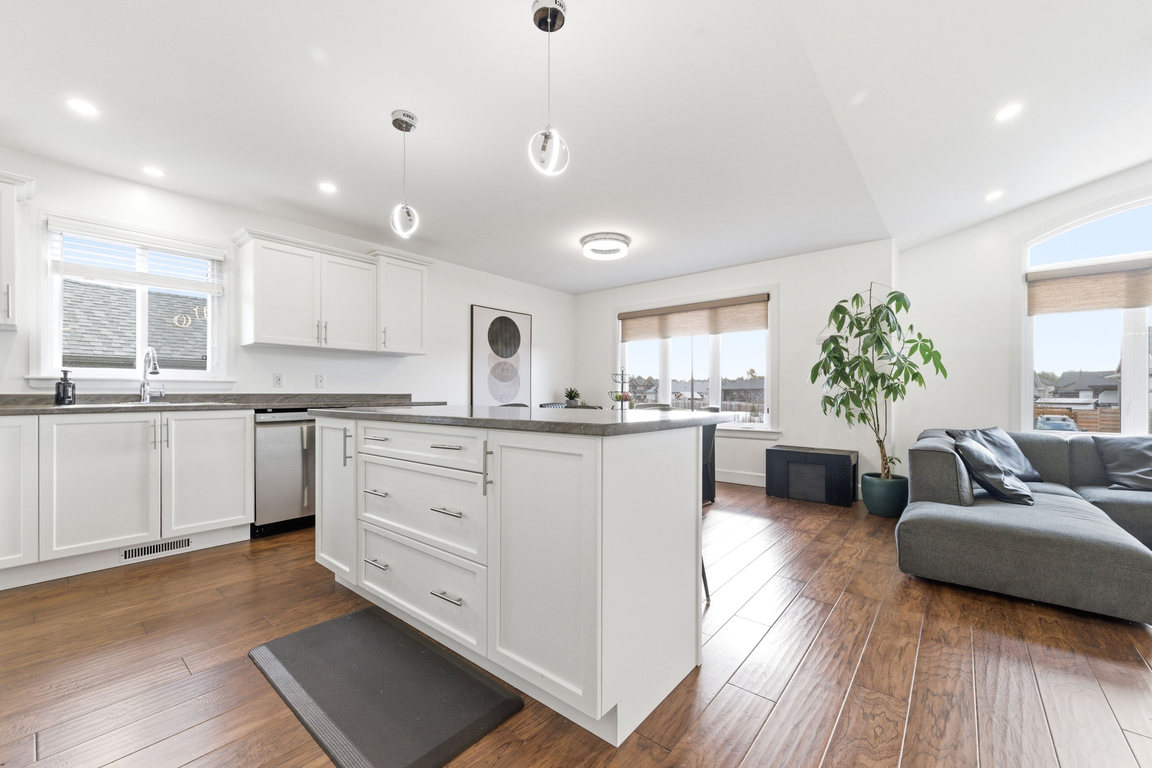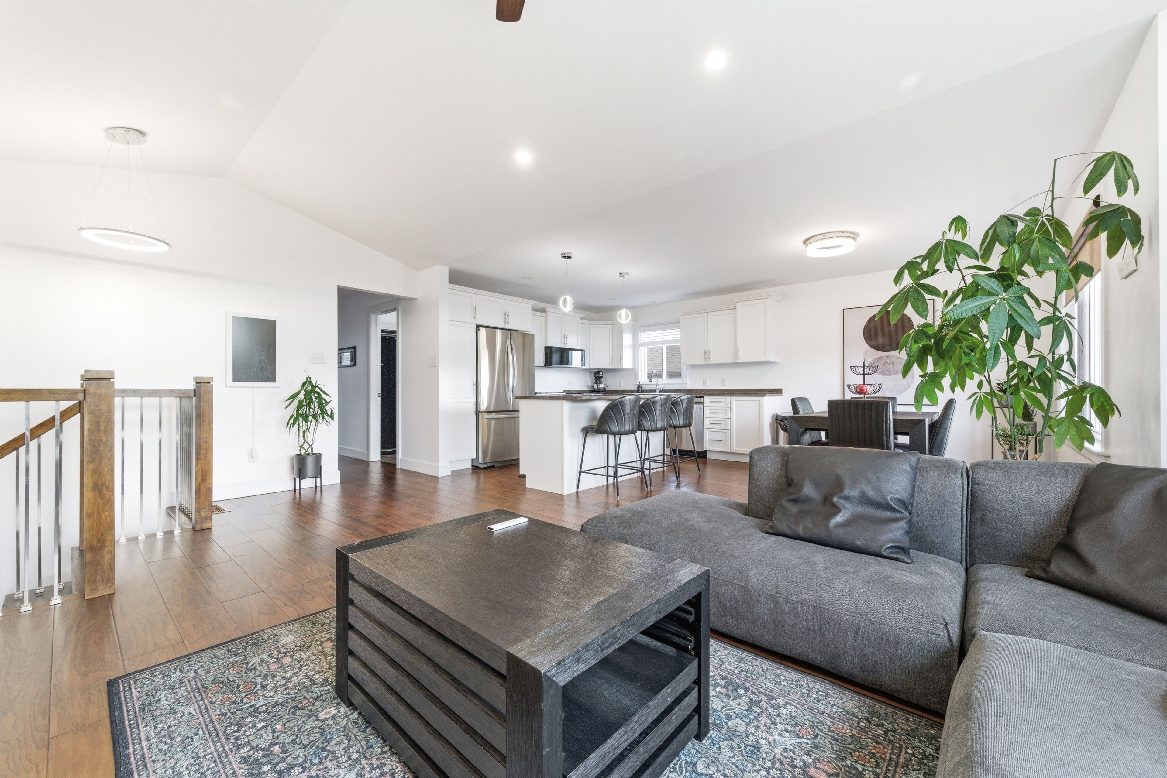 • Bright, open-concept main living area with modern kitchen and island.