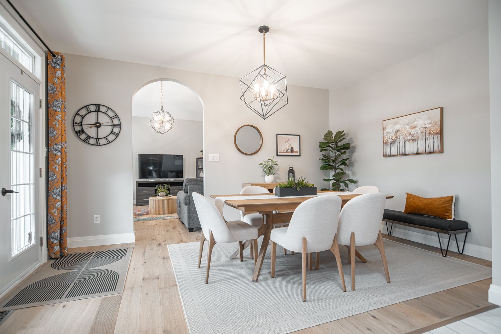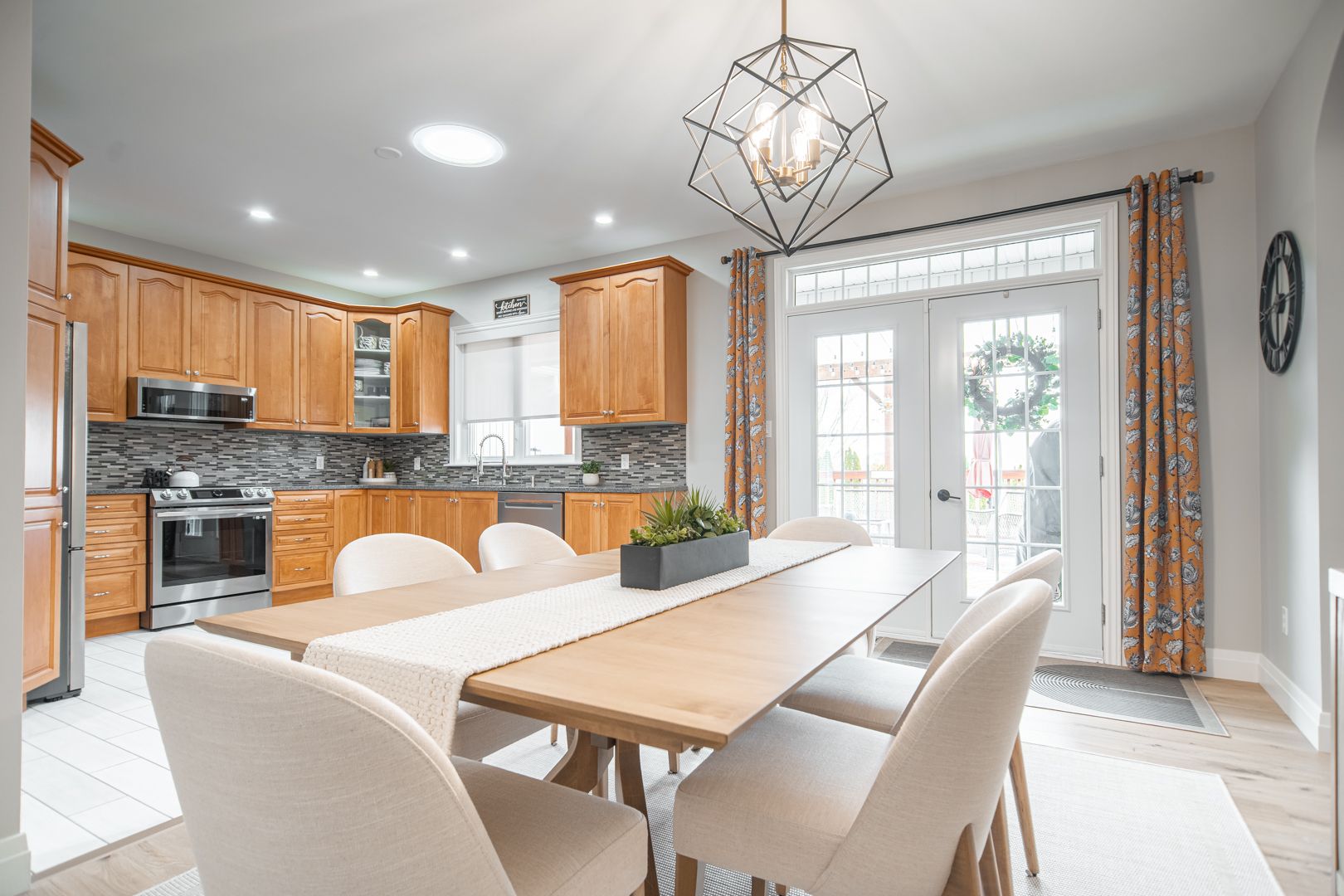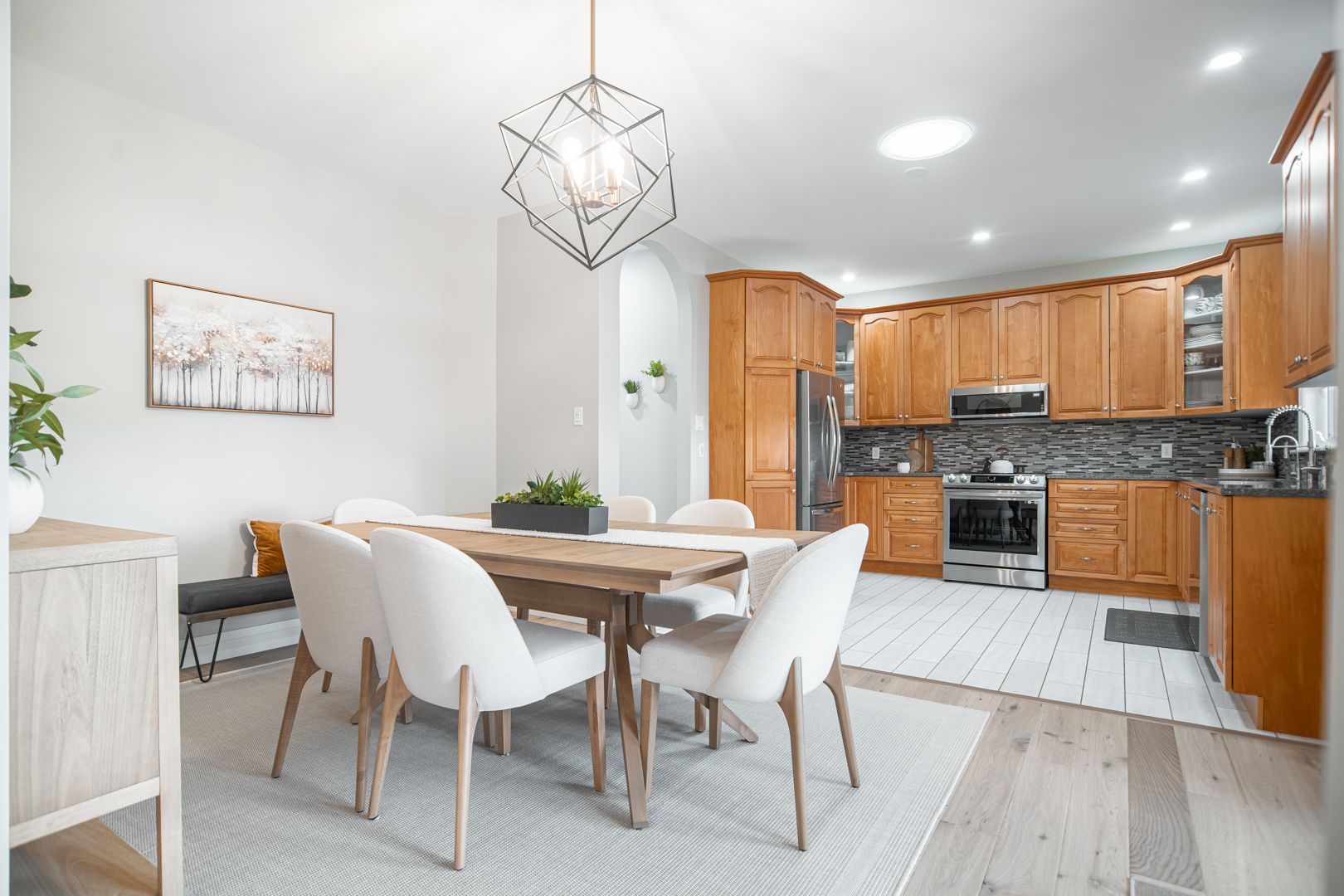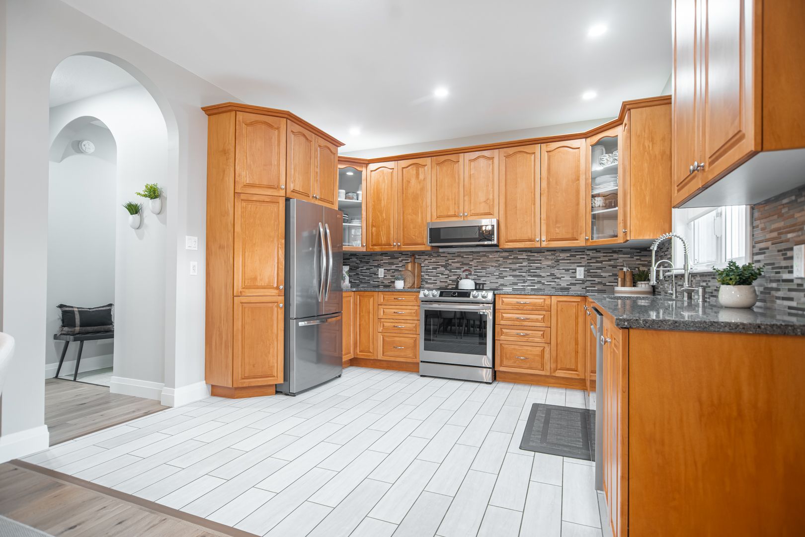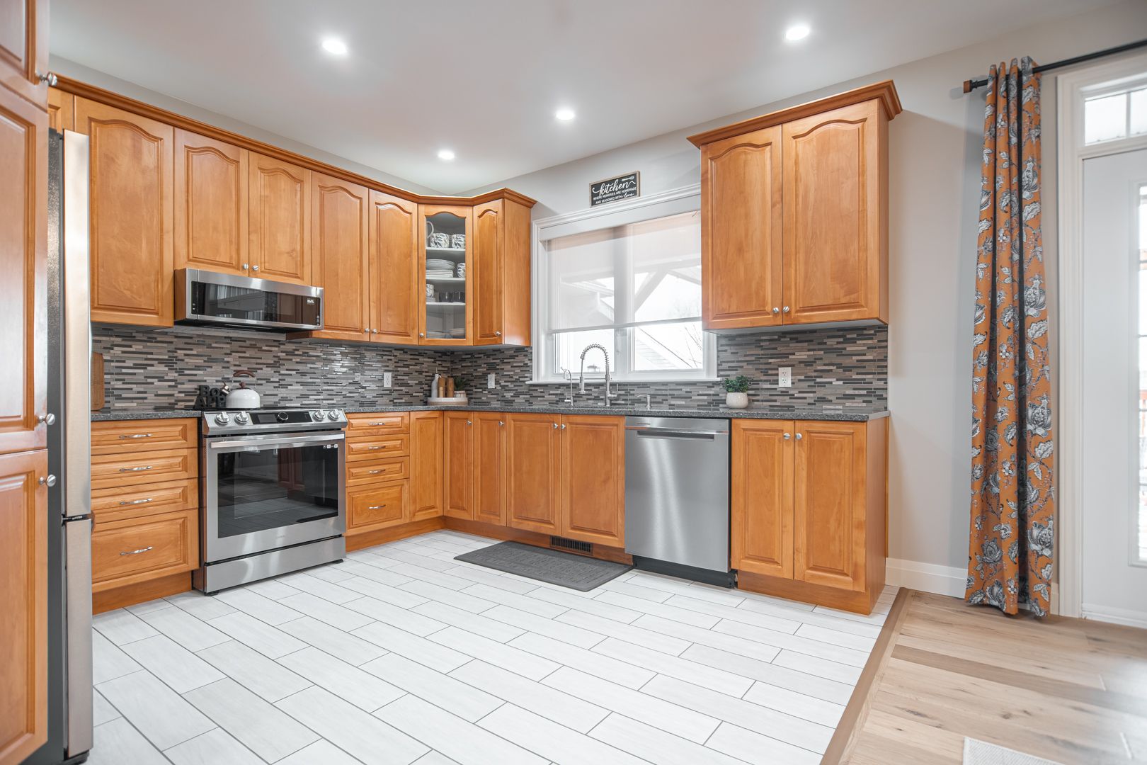 • Bright open kitchen with quartz counters and remote-controlled blinds.