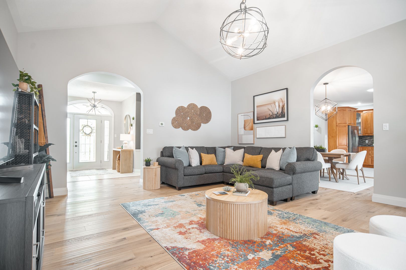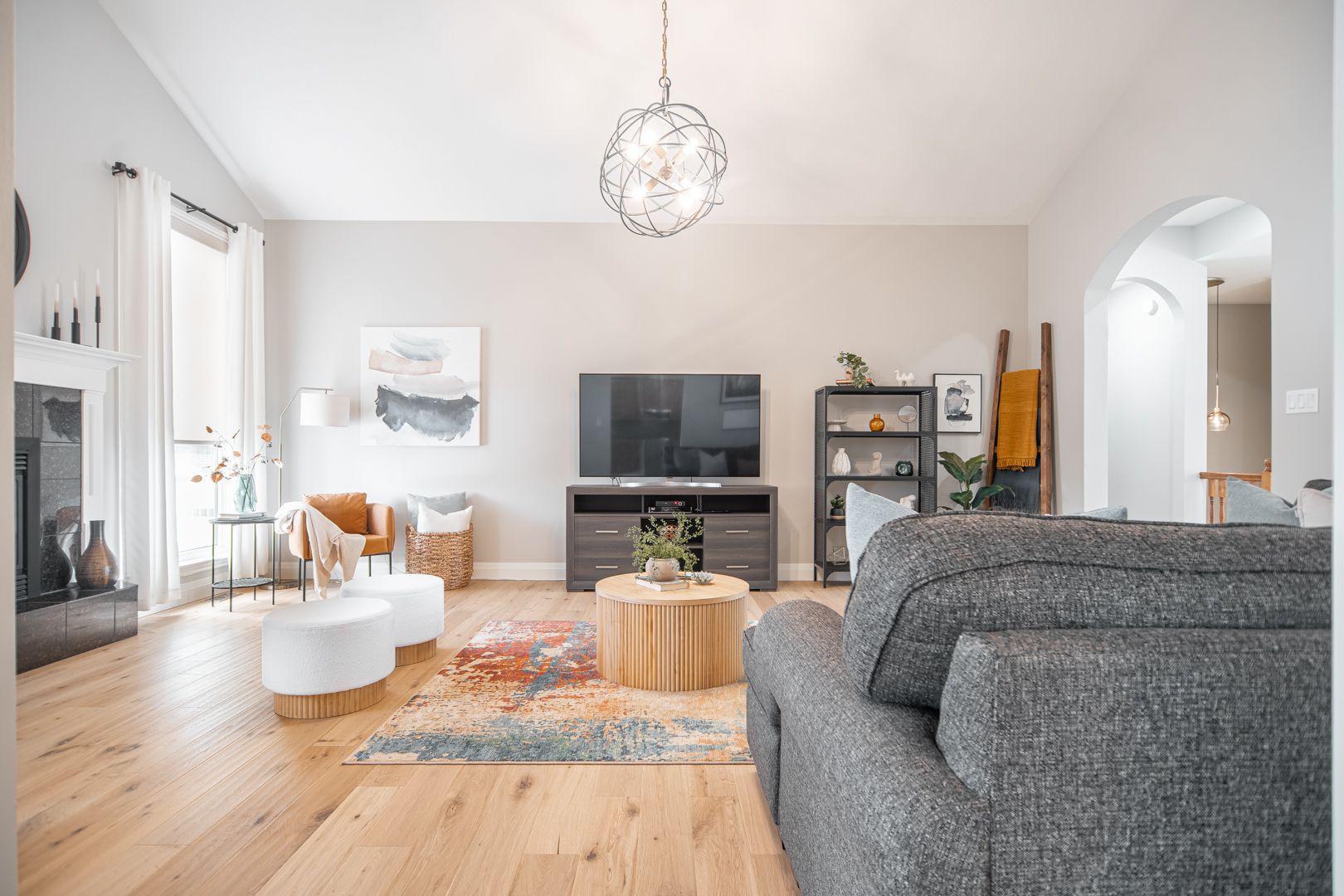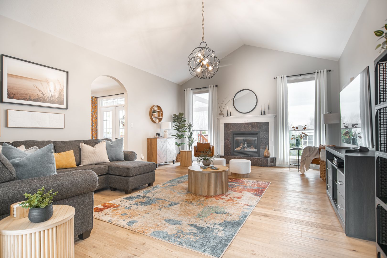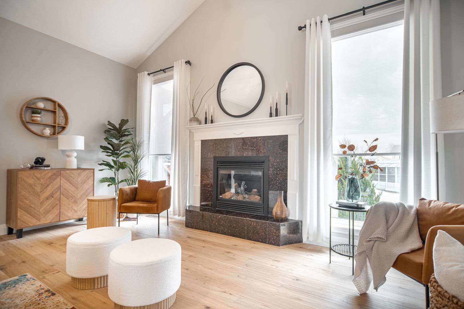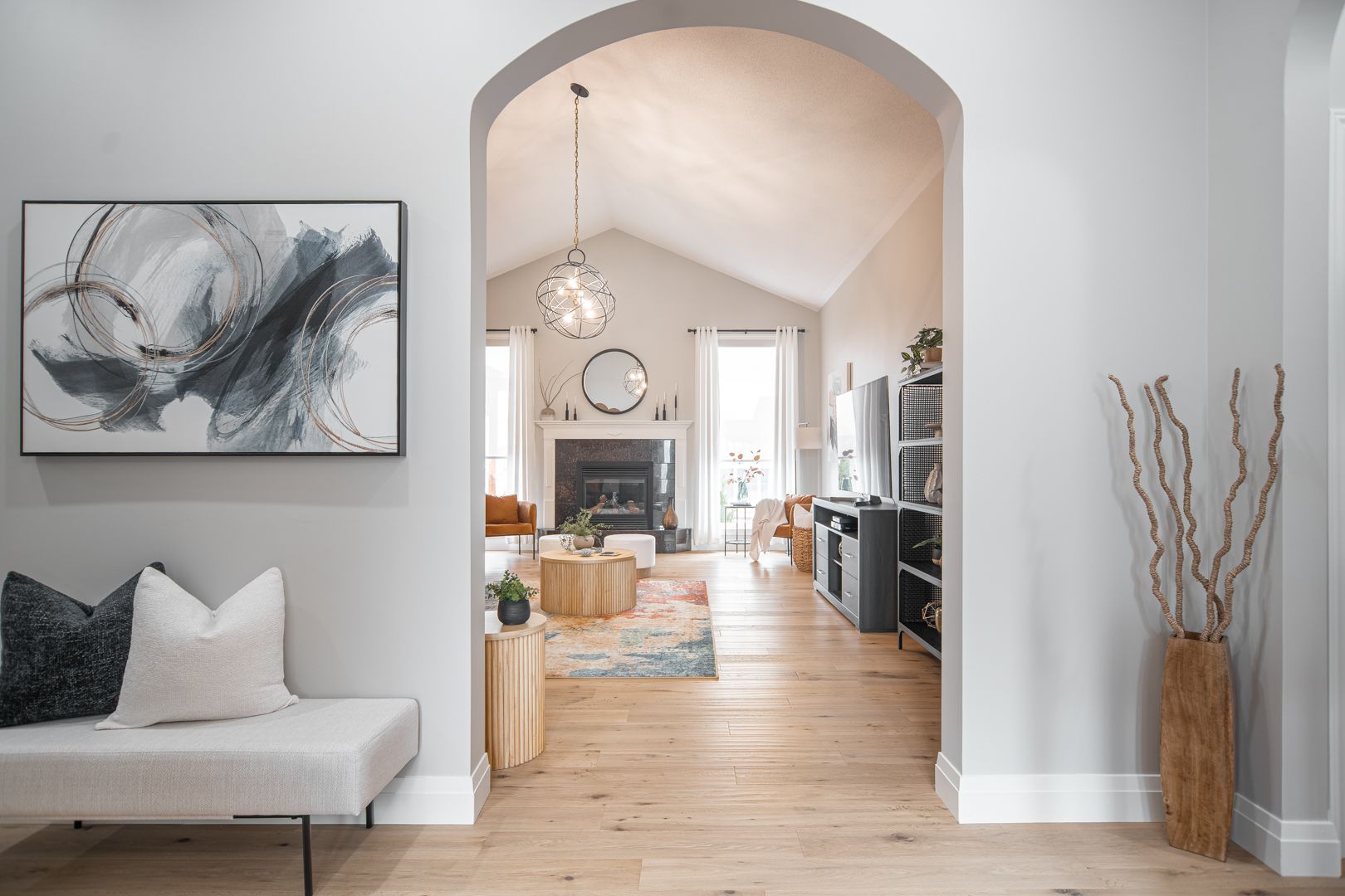 • Bright open kitchen with quartz counters and remote-controlled blinds.