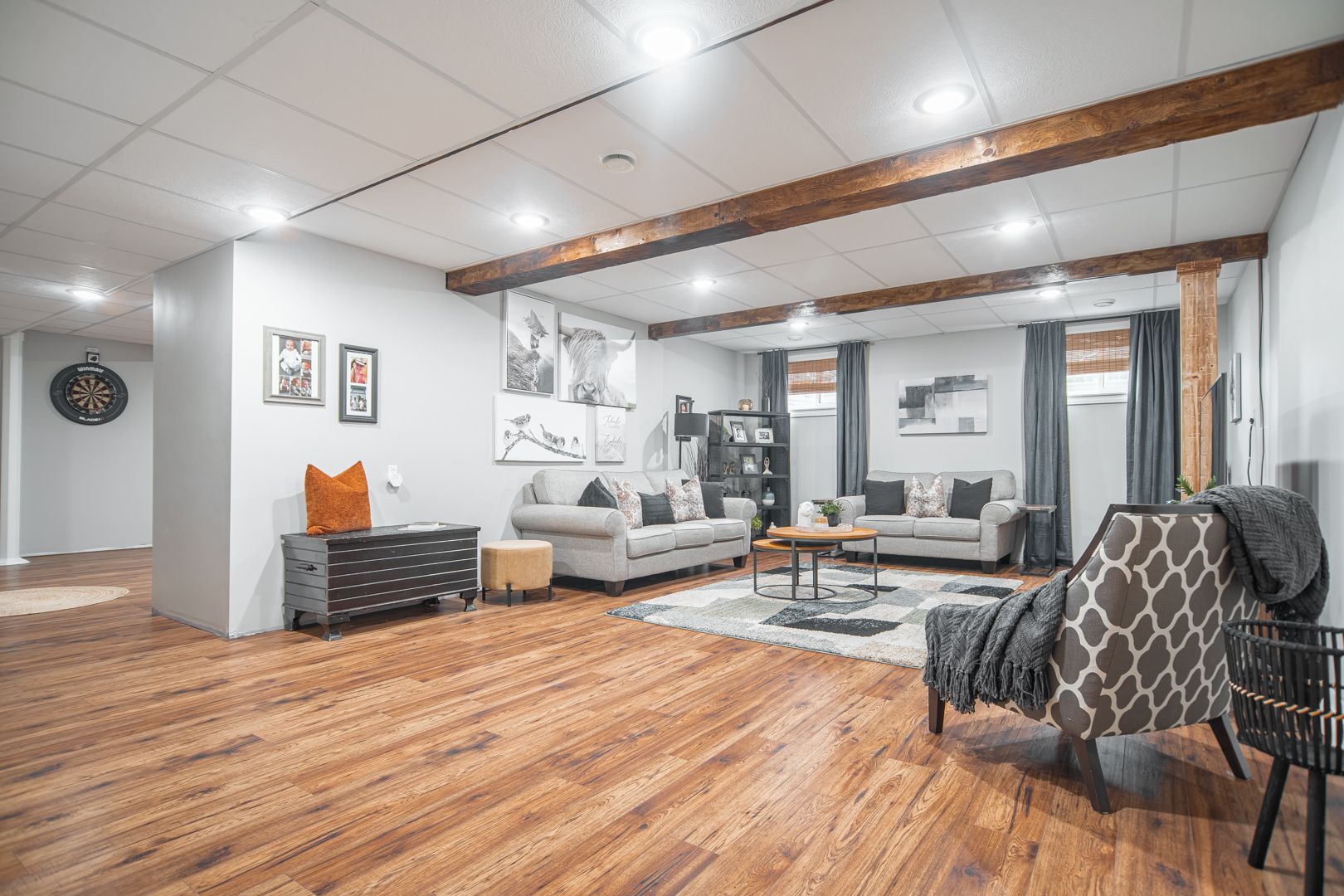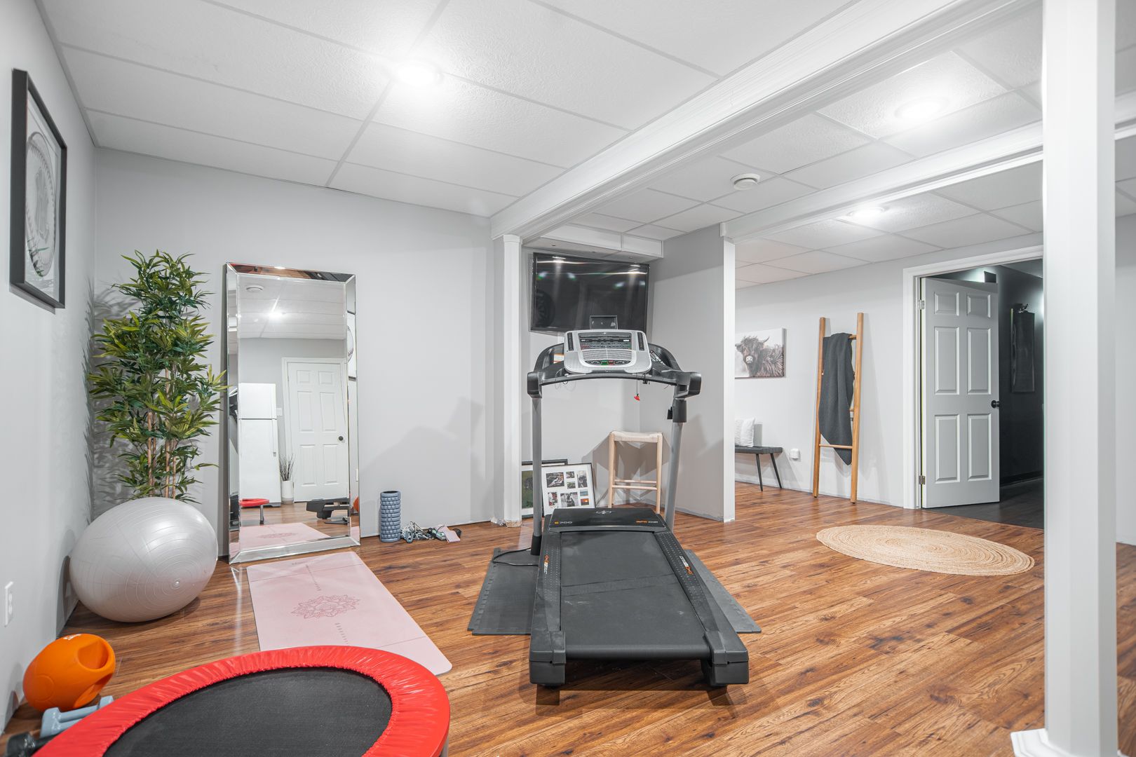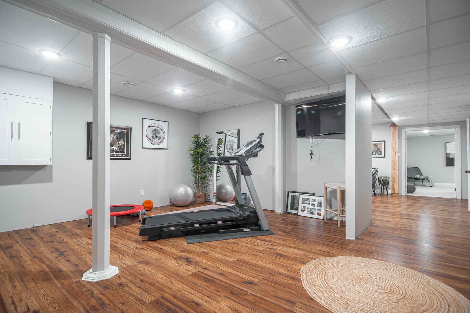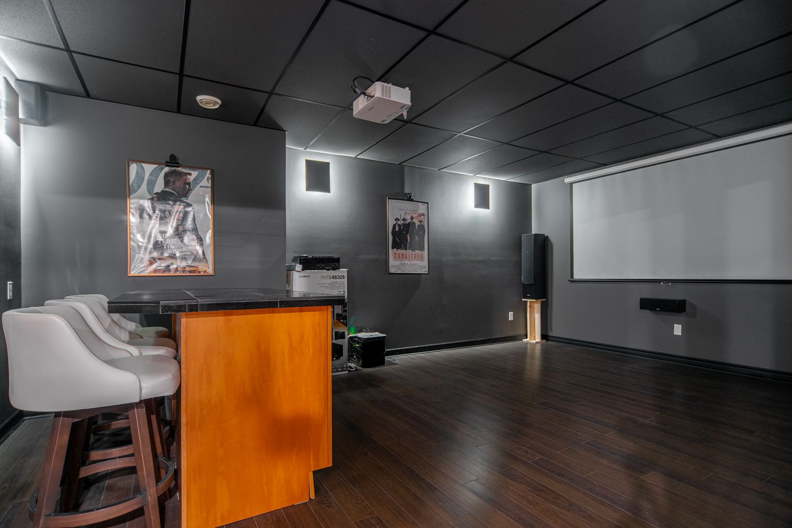 • Finished lower level offers versatile living spaces, including a theater room.